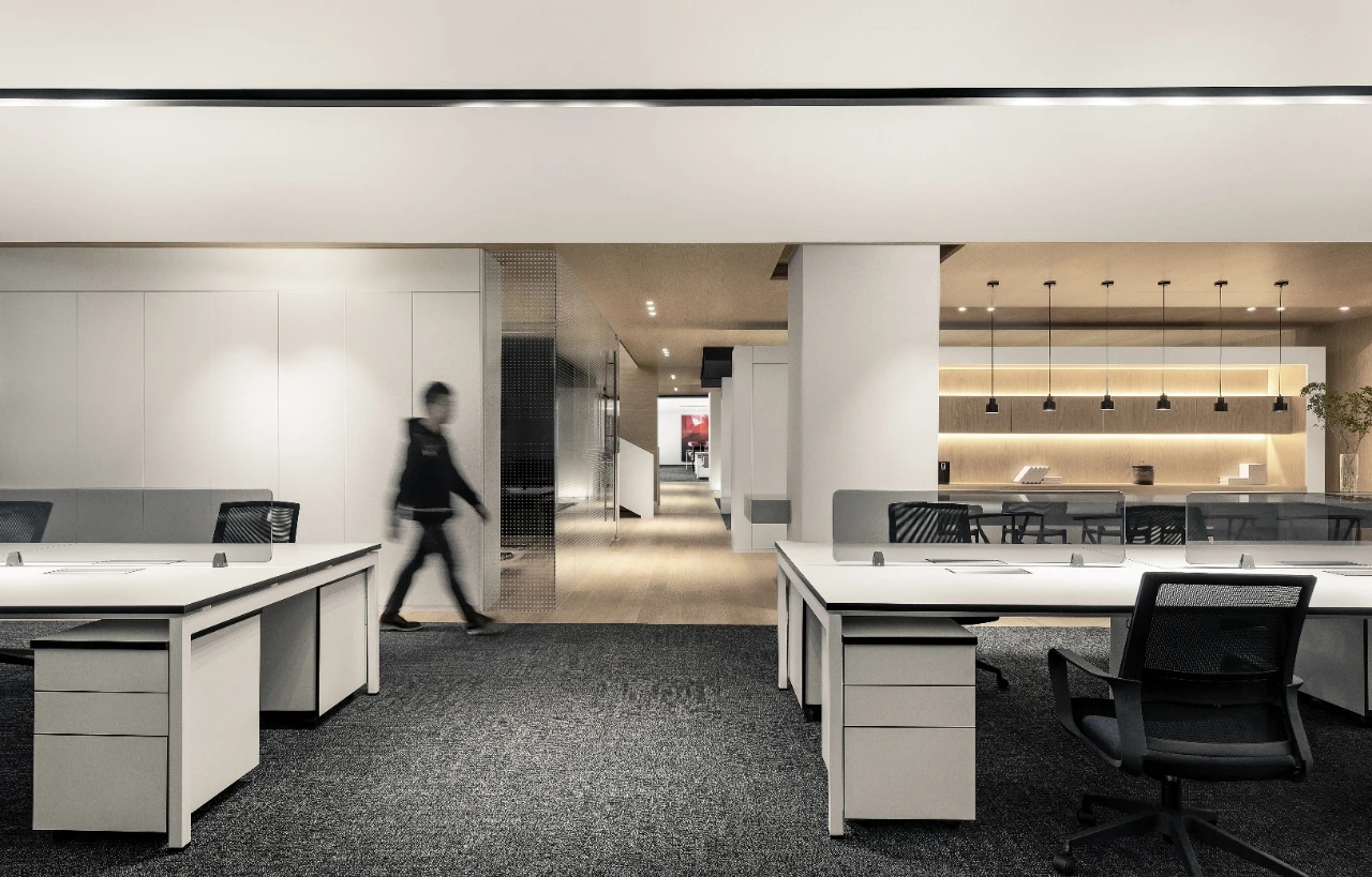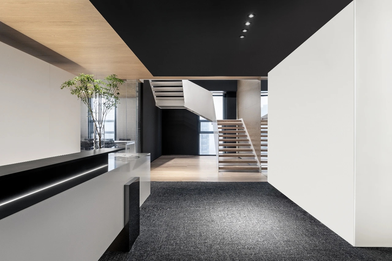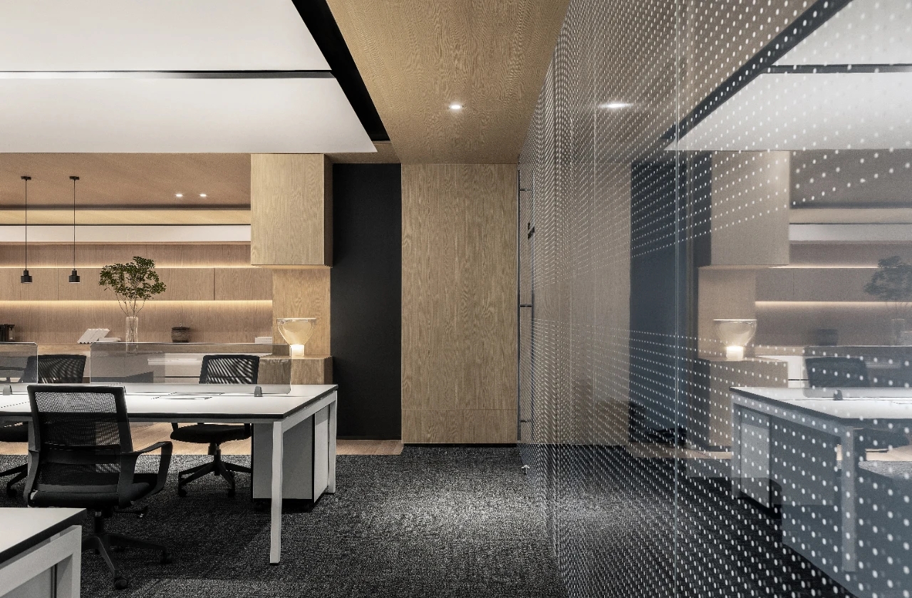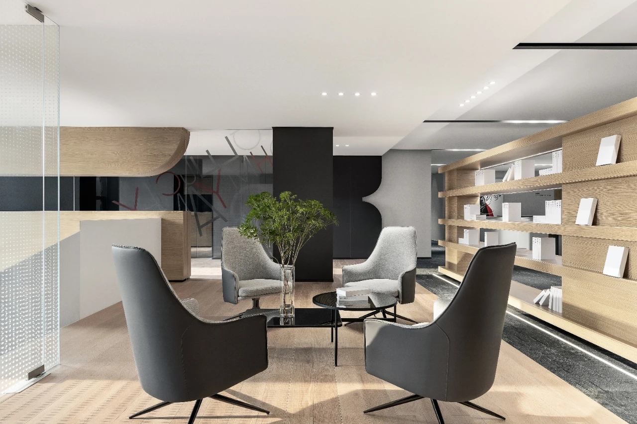 空间的流转如同一瞬转场特效光点矩阵的数列分布一线天地分割办公休闲彼此交接而隔断灰度空间与温柔木色的拼接中和坚硬与柔软打造舒适办公体验