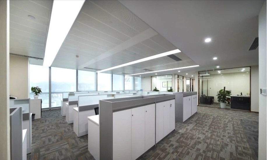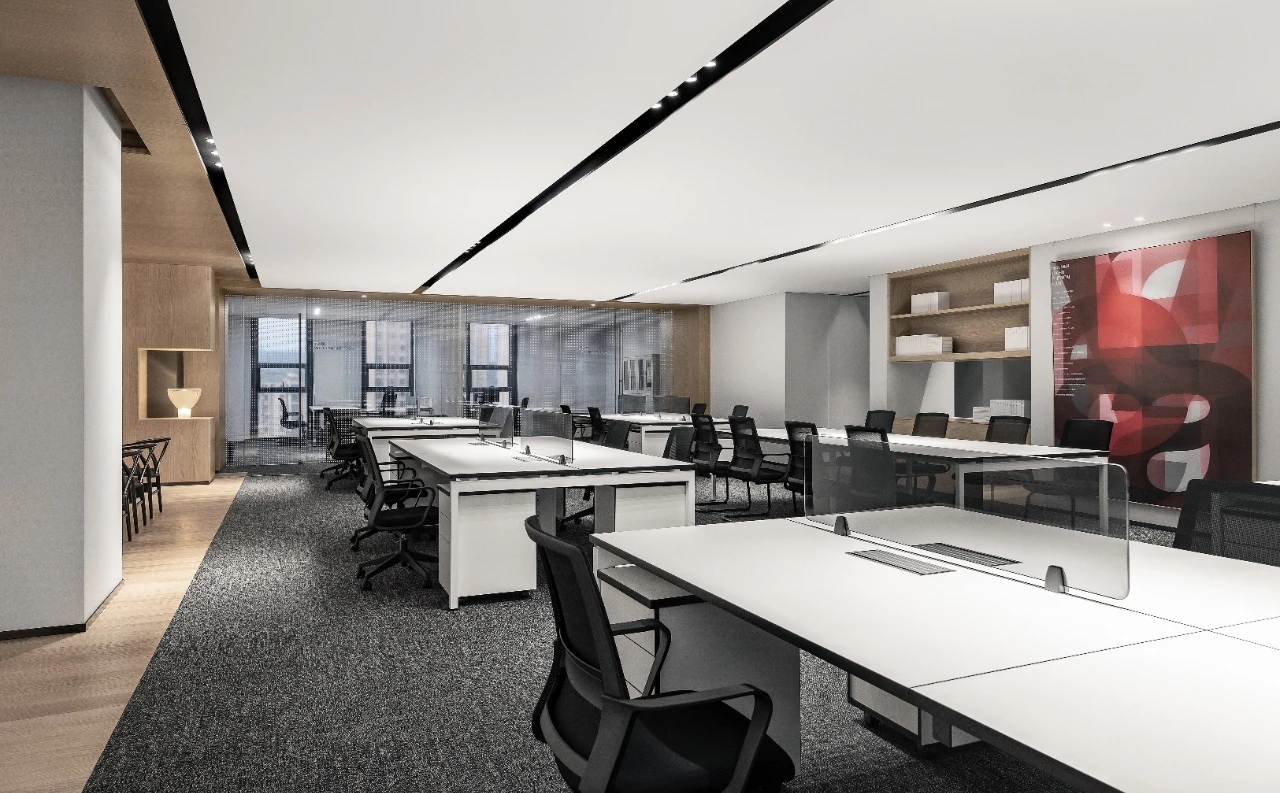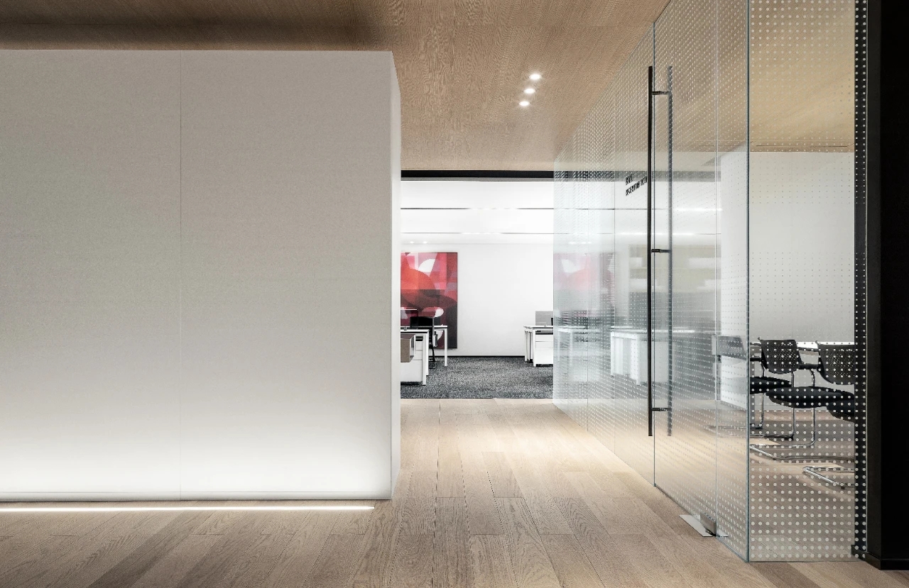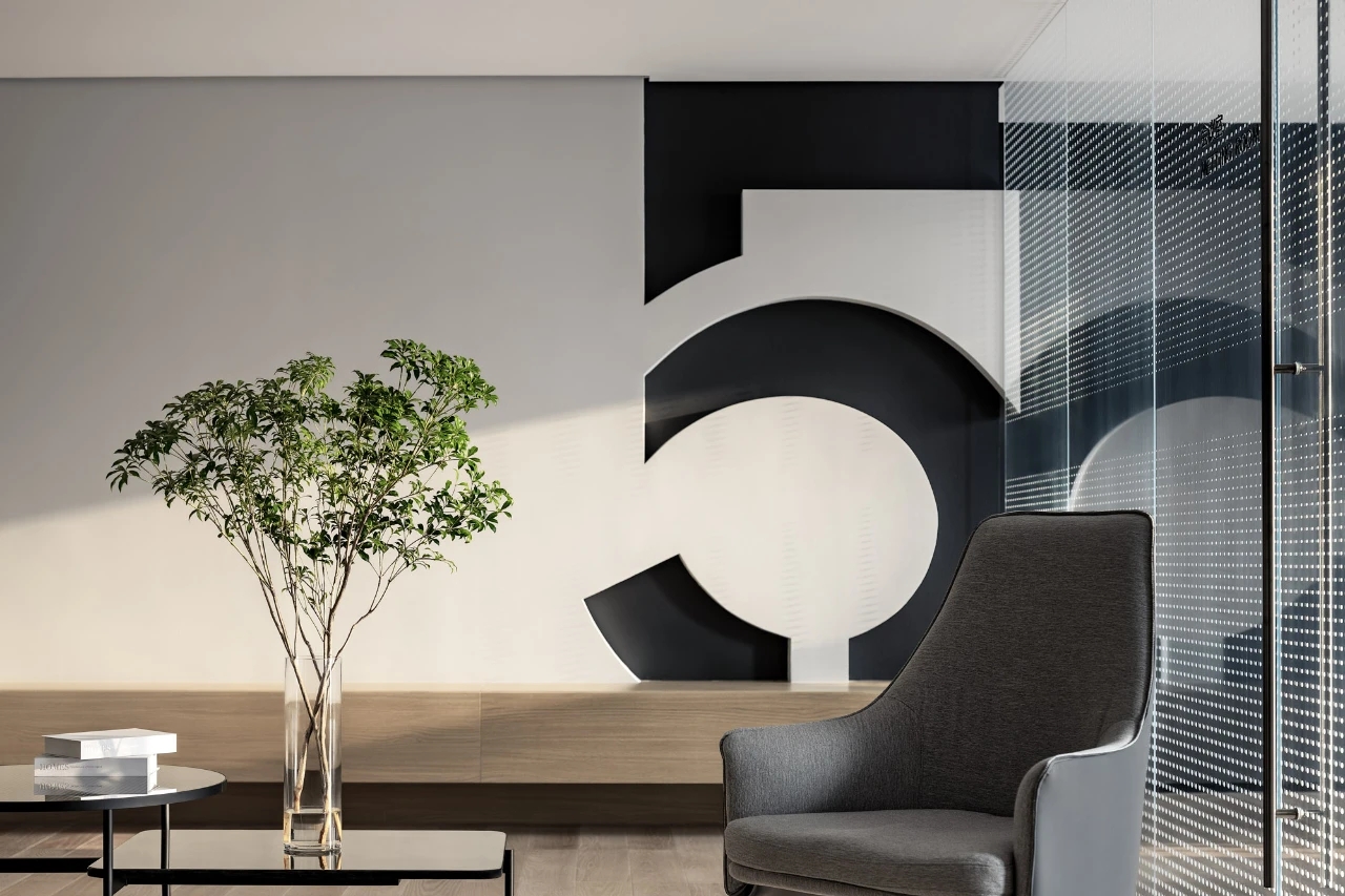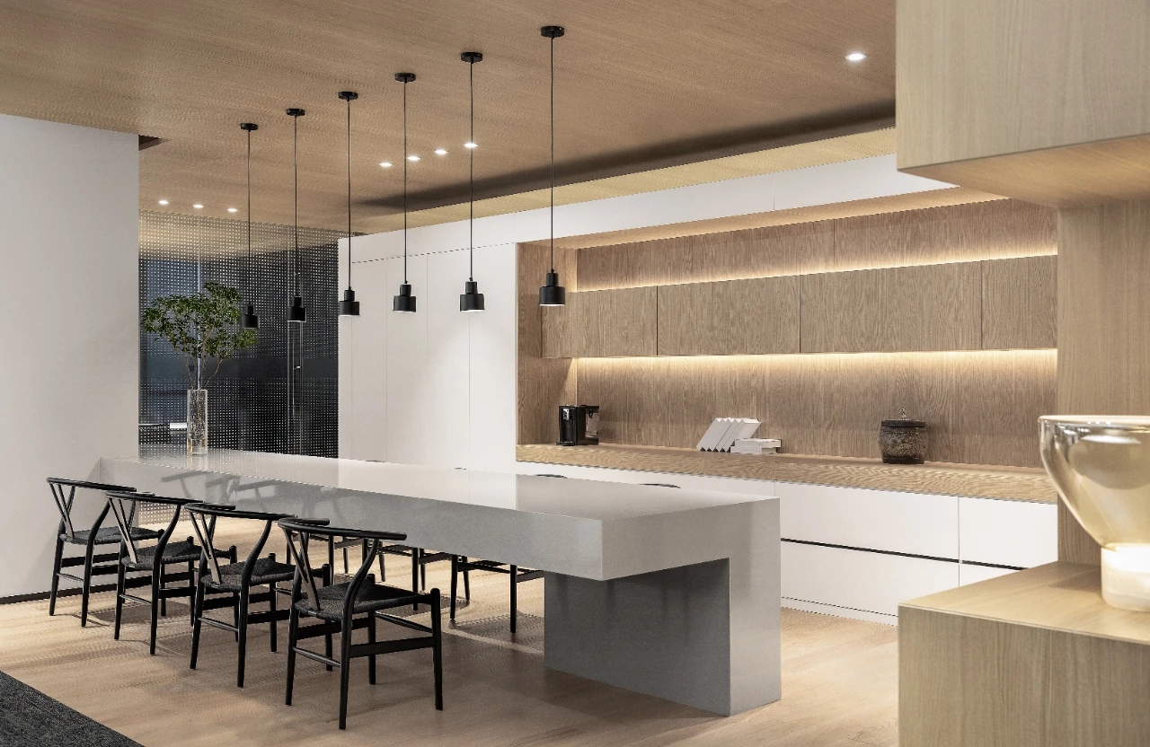 空间的流转如同一瞬转场特效光点矩阵的数列分布一线天地分割办公休闲彼此交接而隔断灰度空间与温柔木色的拼接中和坚硬与柔软打造舒适办公体验
