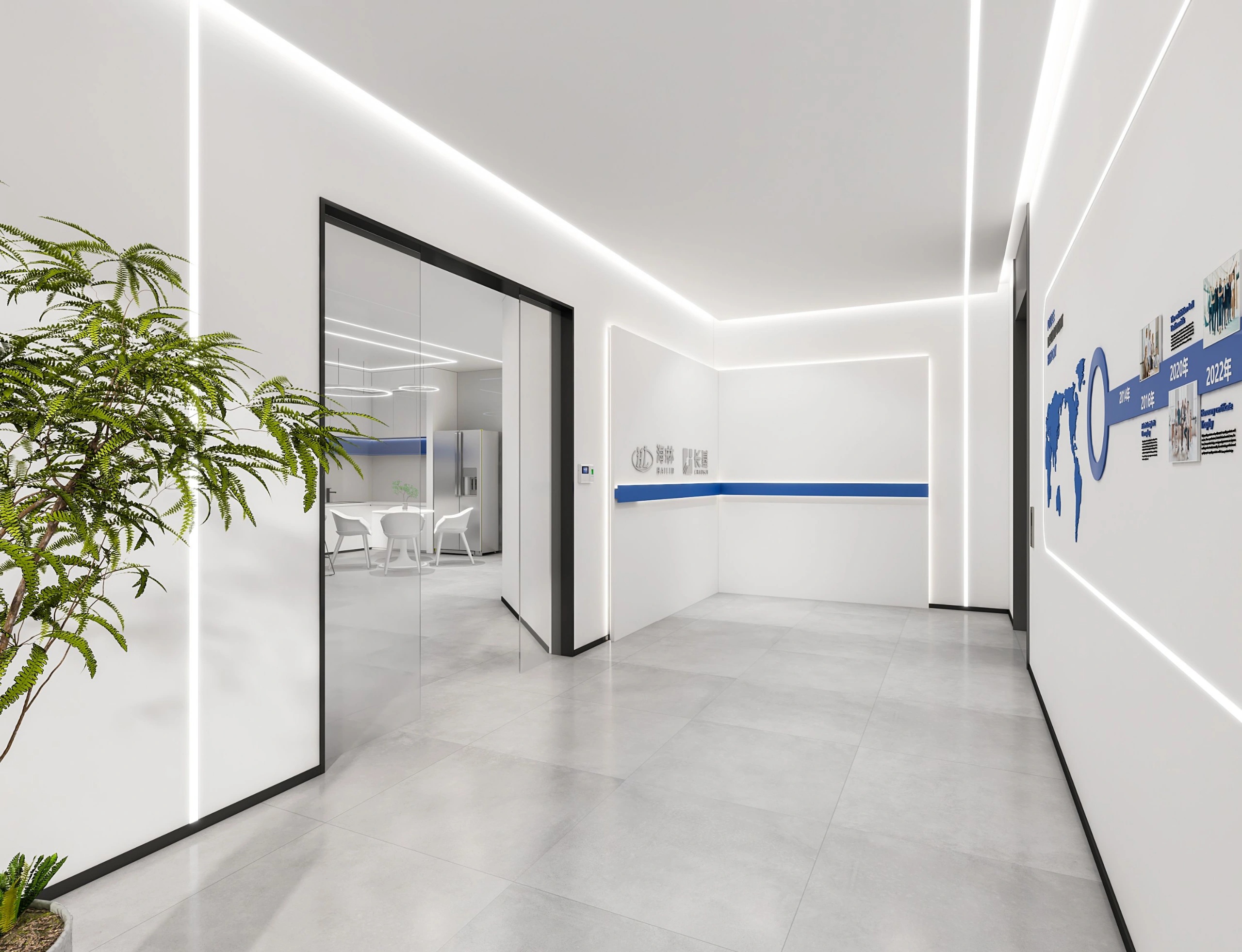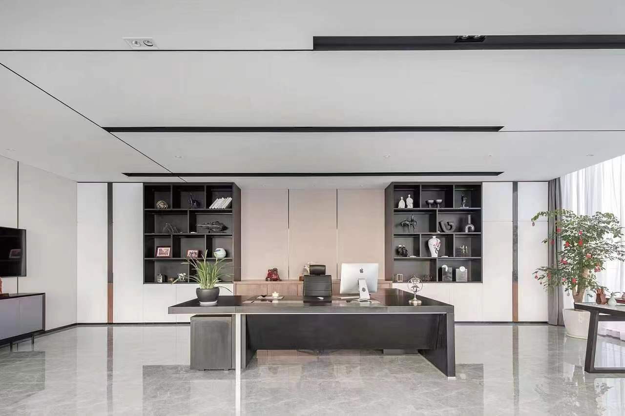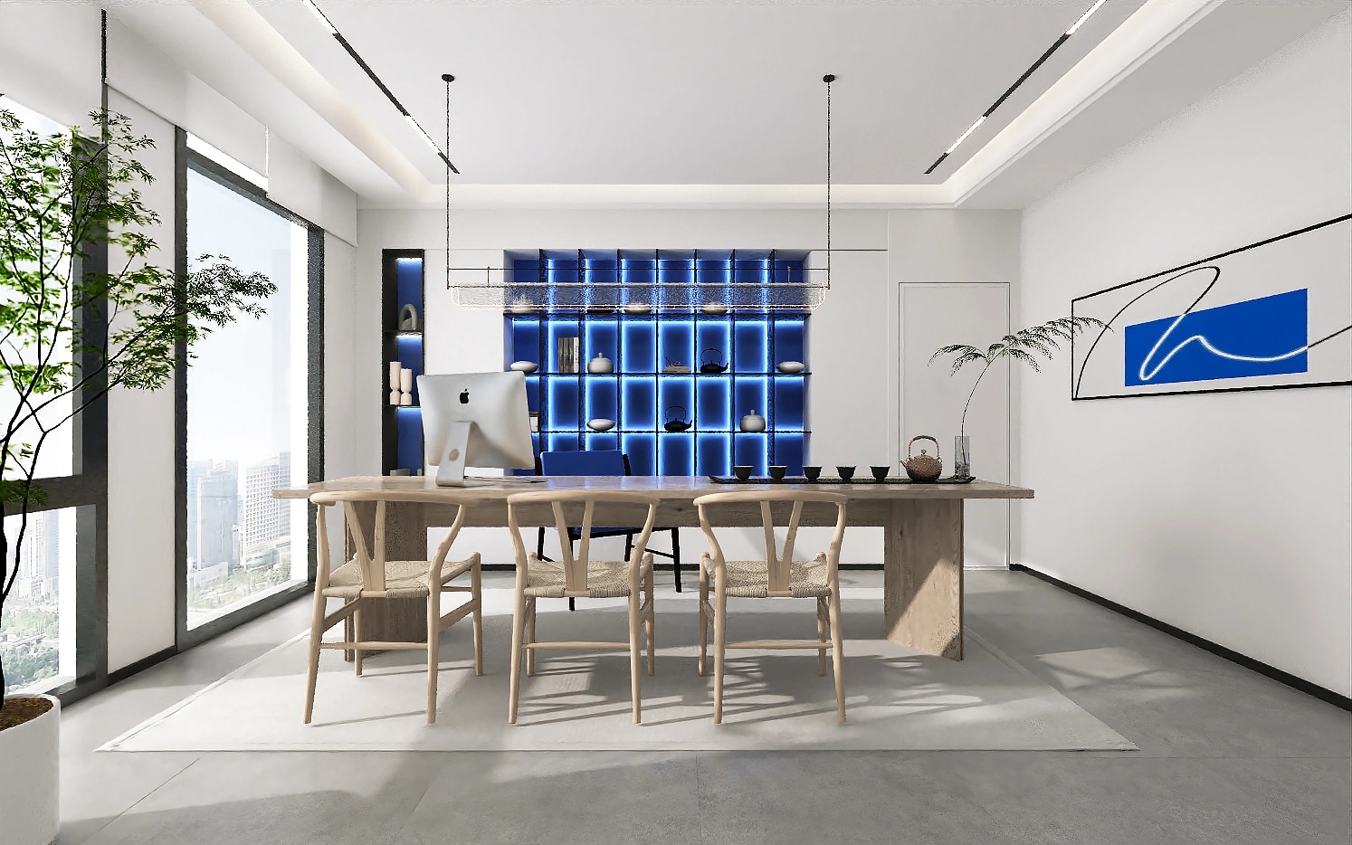 开放式办公区域,采用岛台式方式布置桌椅,同时考虑人体工程学及办公空间的生态环境,计算出一定的距离,设置节点空间。
