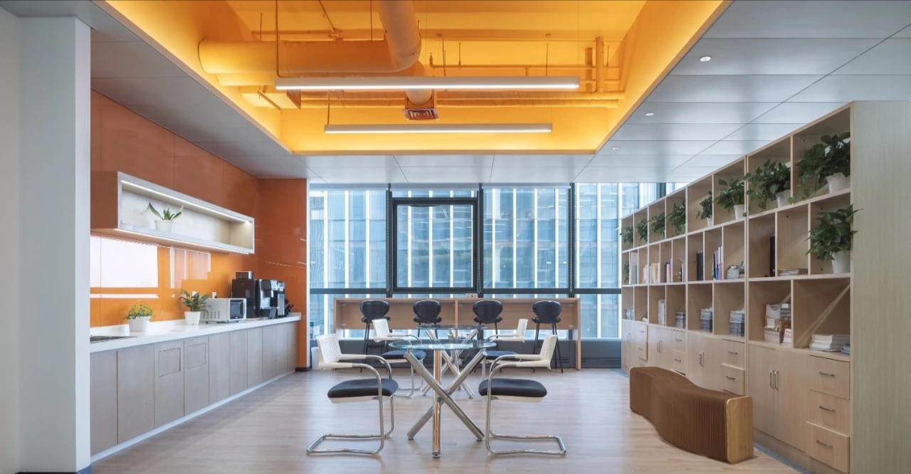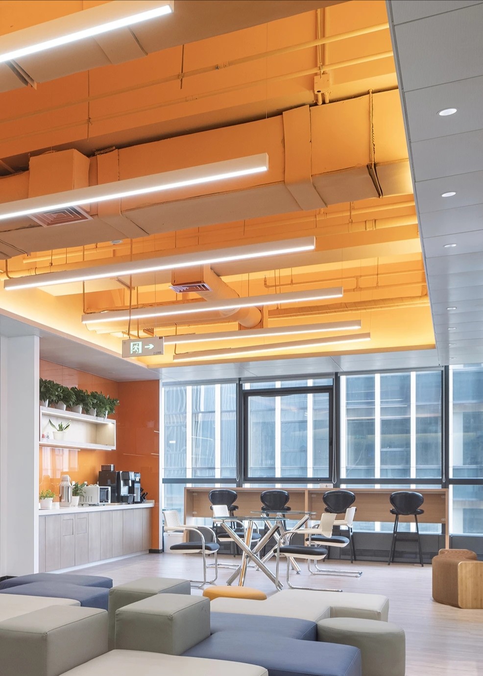 色彩可以调节办公空间的光线,塑造不同的空间情绪,我们以橙黄色营造休闲洽谈区的明亮和温馨氛围,同时橙色吊顶形成的漫反射光,拉长了空间的距离感,大大增家空间的趣味性。茶水间吧台,随意组摆的沙发坐凳,成为员工休憩,探讨问题,临时待客,交流情感的场所。