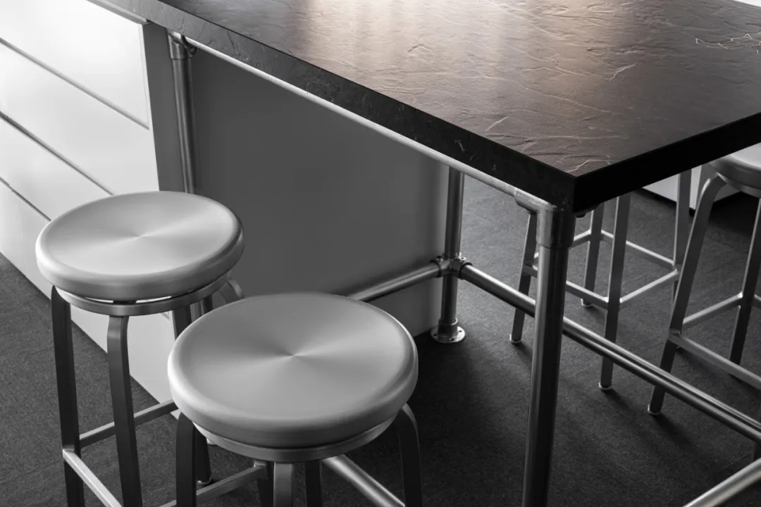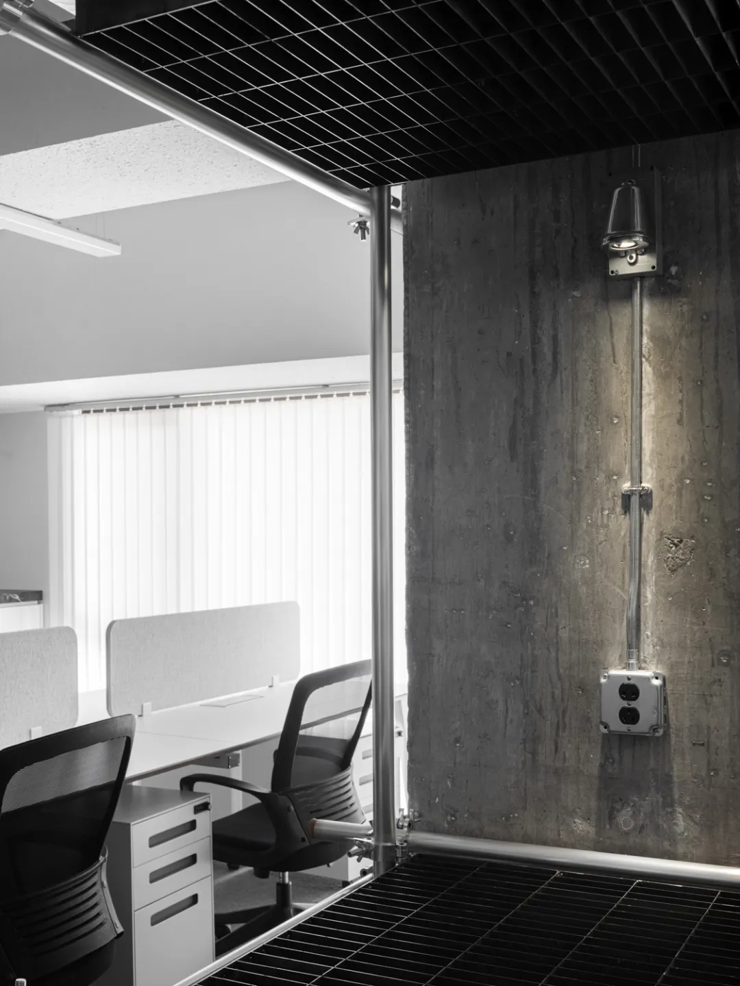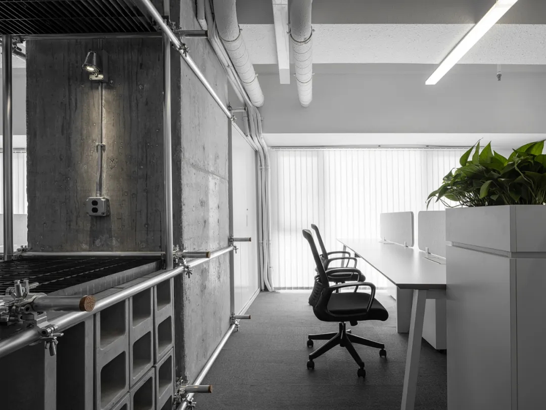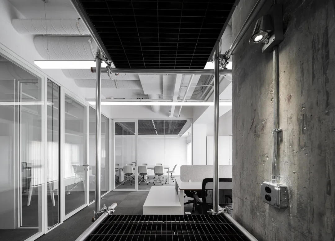 设计中定制的构架系统实现了空间上的开放和链接,并打破了办公室单调的特性。空间中所用的材料-金属、定制构件、混凝土预制体、裸露的天花和原始墙面等与工业制造过程呼应结合。