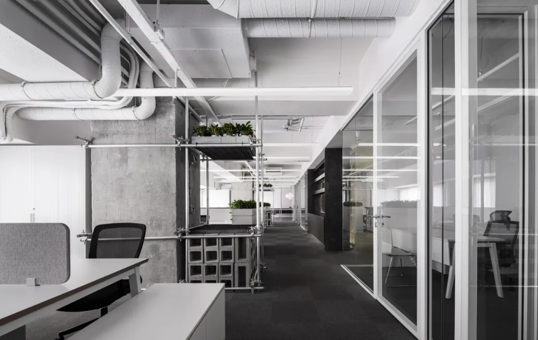 本团队创造了一个充满光线和单色的办公空间,与工业美学产生共鸣,但仍旧保持温暖舒适的可持续办公环境。