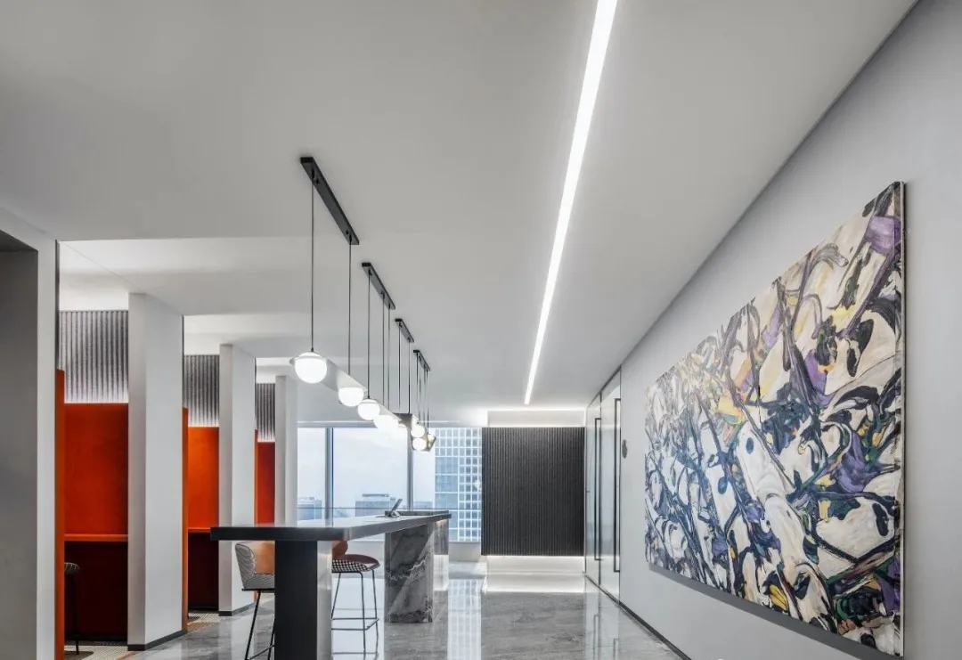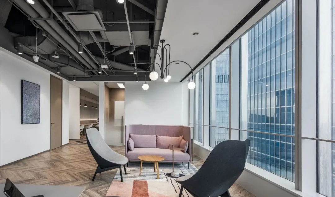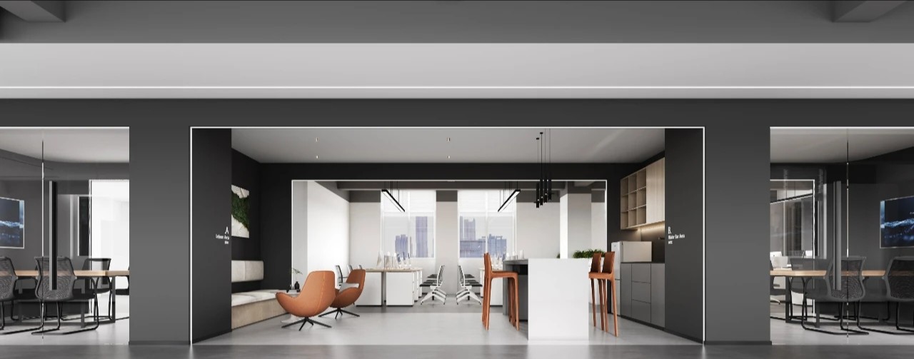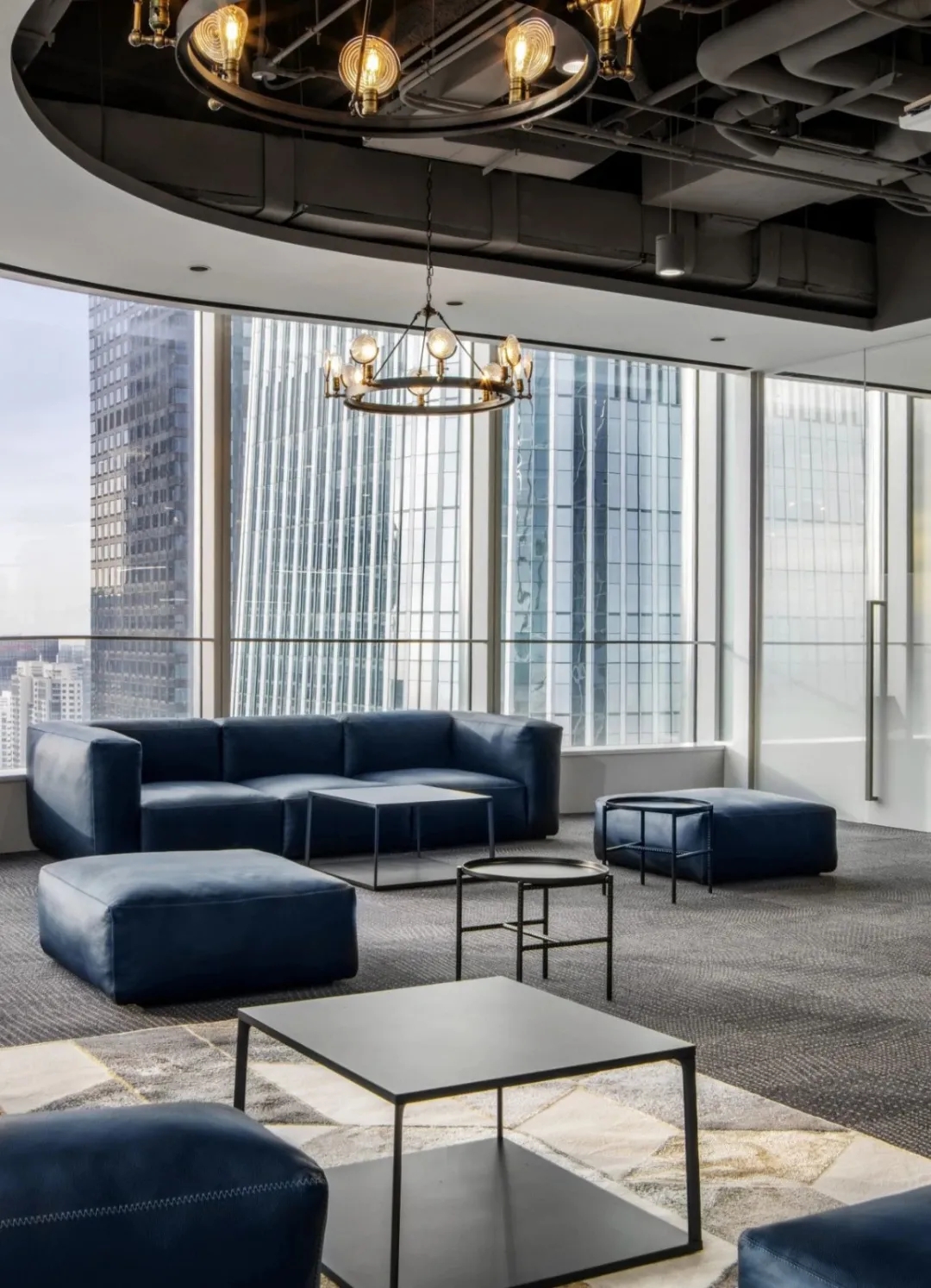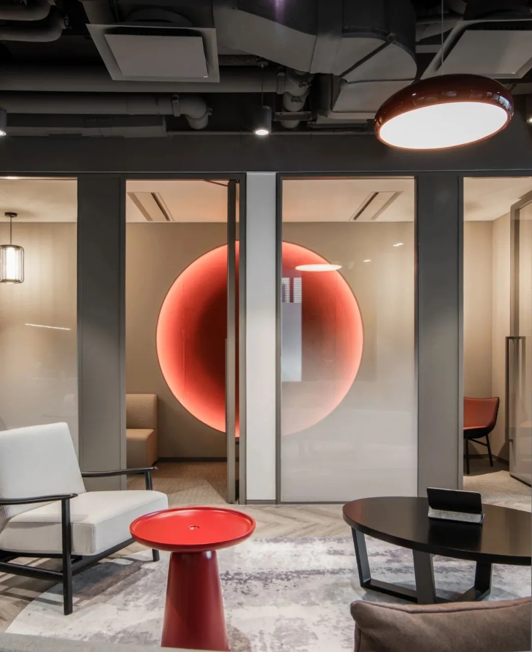 会议区以优雅的灰色为基调,混合橙色、红色、蓝色,跳动的色彩搭配平衡办公氛围的严肃、沉静。休闲区被设置在视野最开阔的区域,近270度的环绕落地窗装裱户外的天光云影,成为空间的巨幕。流线型,艺术感观性高的高品质办公家具丰富空间层次变化,使空间更为灵动,打破办公环境的枯燥和乏味。
