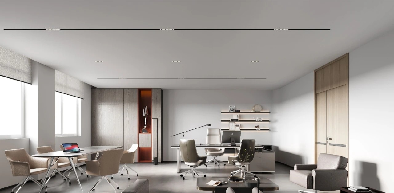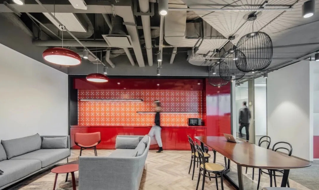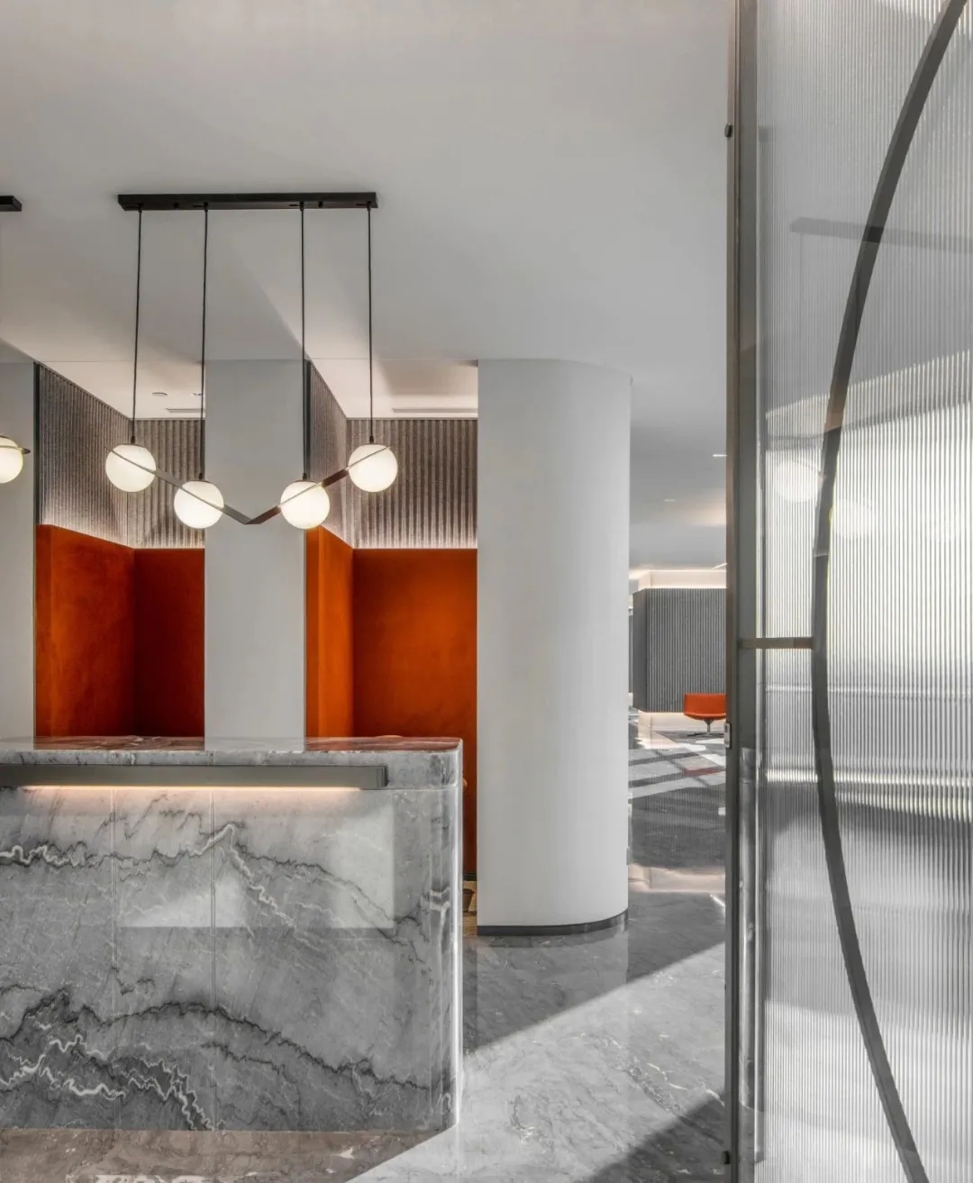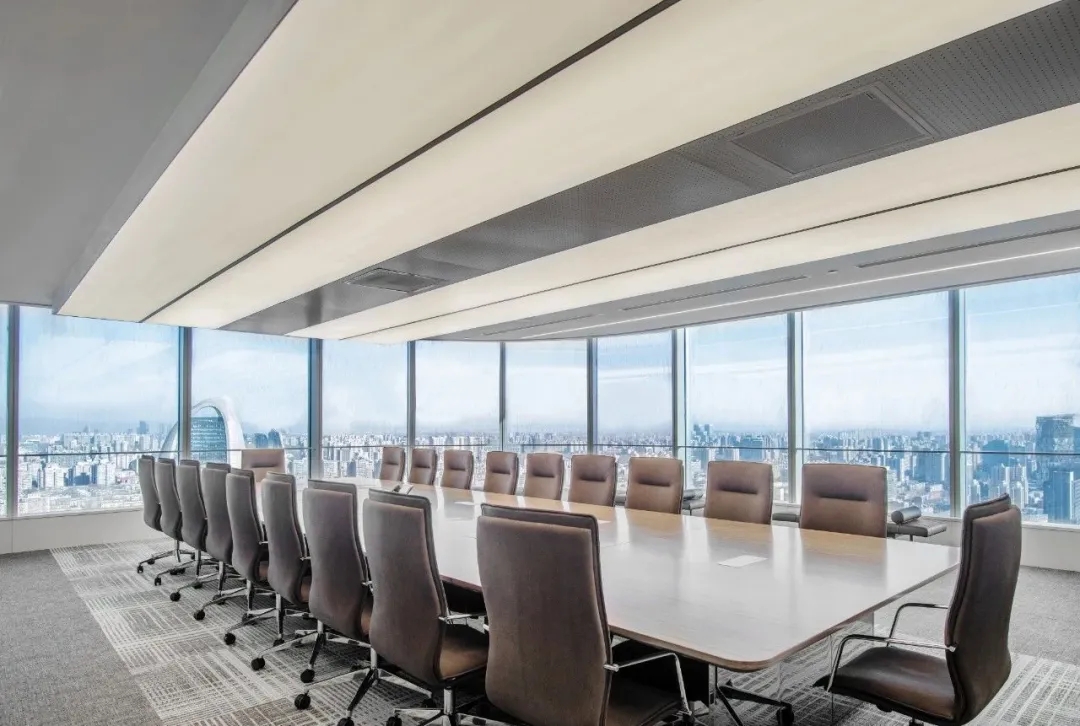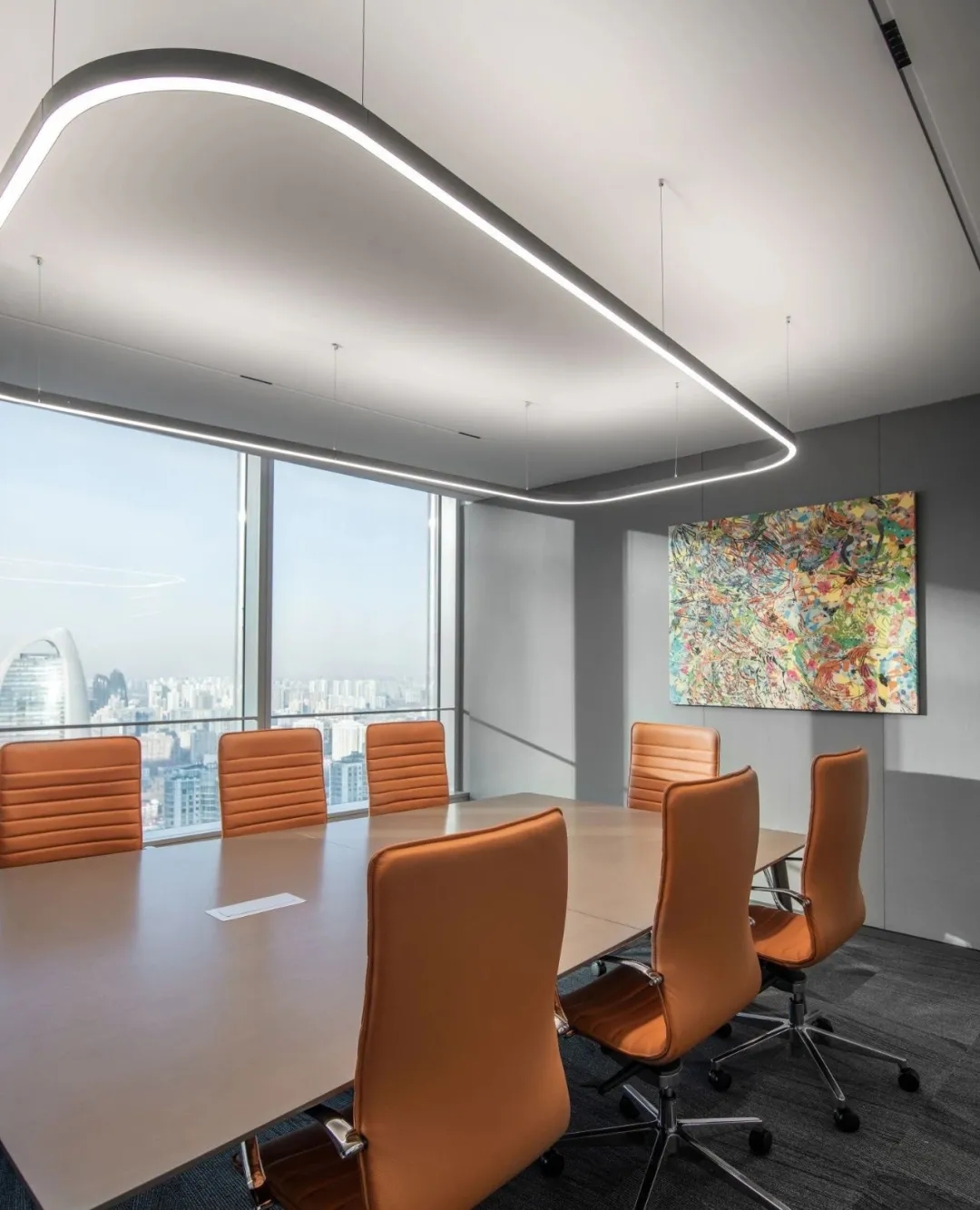 会议区以优雅的灰色为基调,混合橙色、红色、蓝色,跳动的色彩搭配平衡办公氛围的严肃、沉静。休闲区被设置在视野最开阔的区域,近270度的环绕落地窗装裱户外的天光云影,成为空间的巨幕。流线型,艺术感观性高的高品质办公家具丰富空间层次变化,使空间更为灵动,打破办公环境的枯燥和乏味。