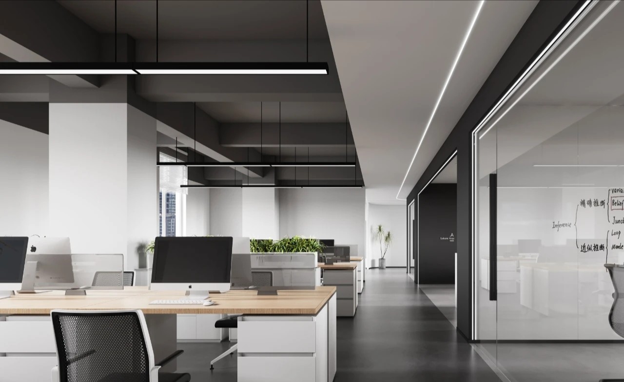 深灰色墙面搭配白色灯带构成的线条,时尚中又透露出一丝严谨。棕黄色桌椅与吧台凳作为打破整体视觉的颜色点缀。