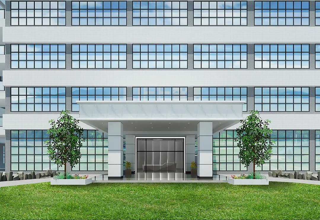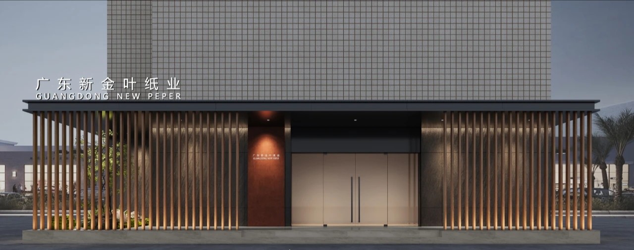 外观设计上,为了凸显企业产品特质,同时融入纸制品企业节能环保及可持续发展理念,采用铝格栅构建了仿木格栅的结构,并在内里搭配了绿植景观。