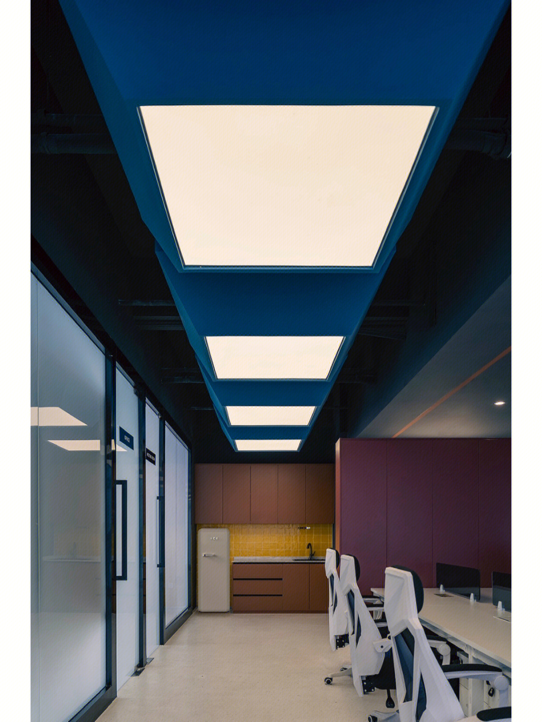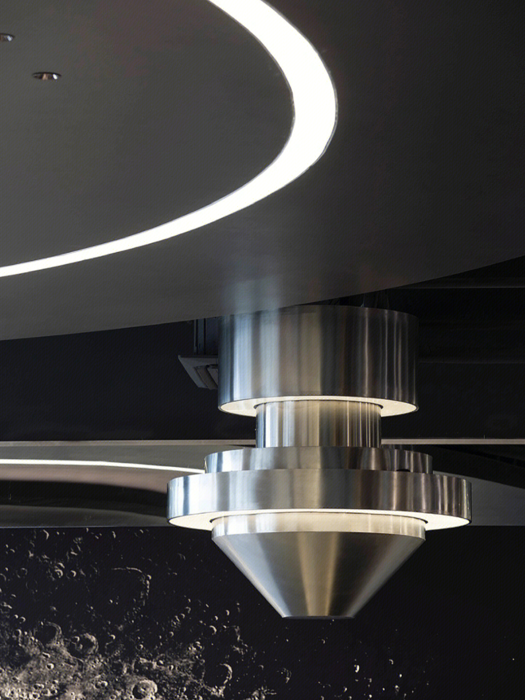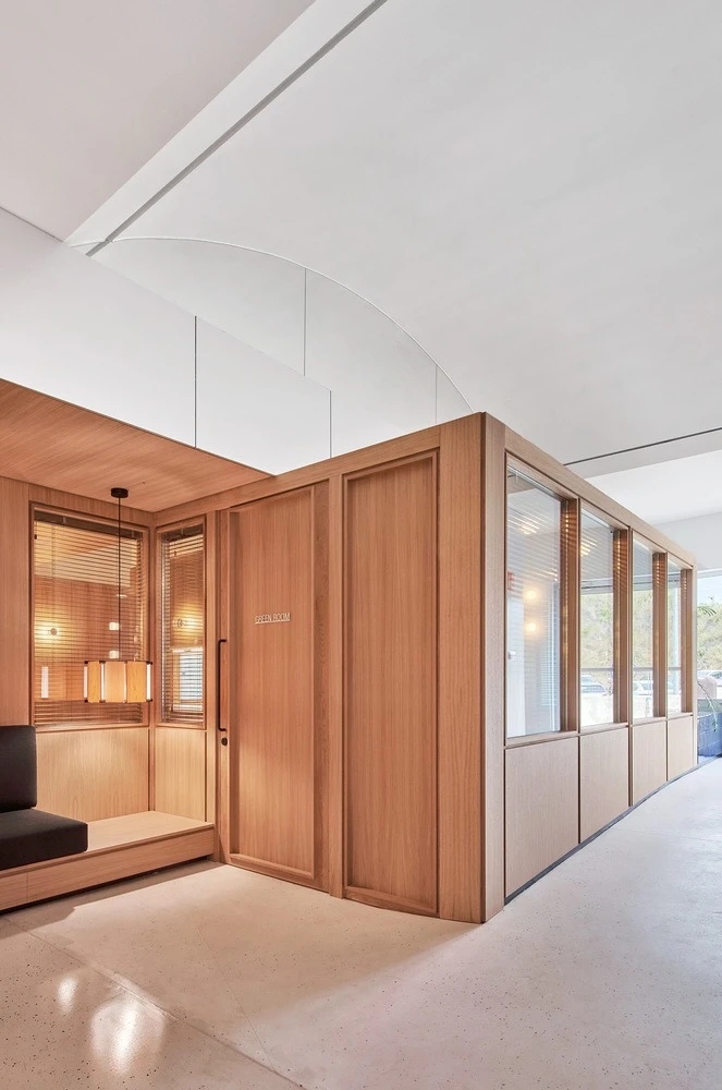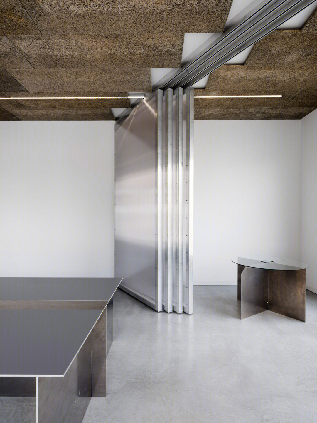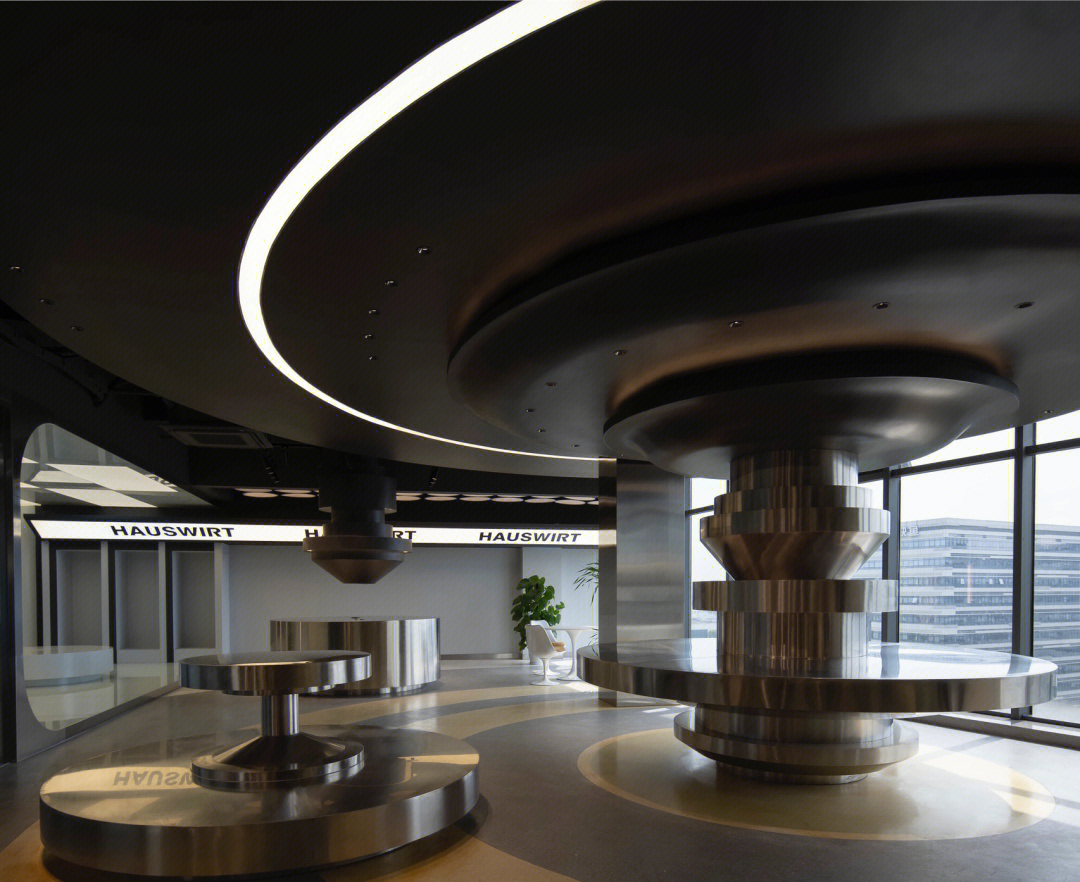 在可以容纳380人的礼堂,木质墙壁犹如台基一般环绕着房间,并与同样是木质的台阶融为一体,为走下楼梯的人带来被温暖包围的感觉。与木材形成对比的是浮动在天花板上的白色“波浪”,它呈现出像织物一般的飘动效果,伴随着光线和声音,它将为公司内的各种大型活动提供生动的背景。
