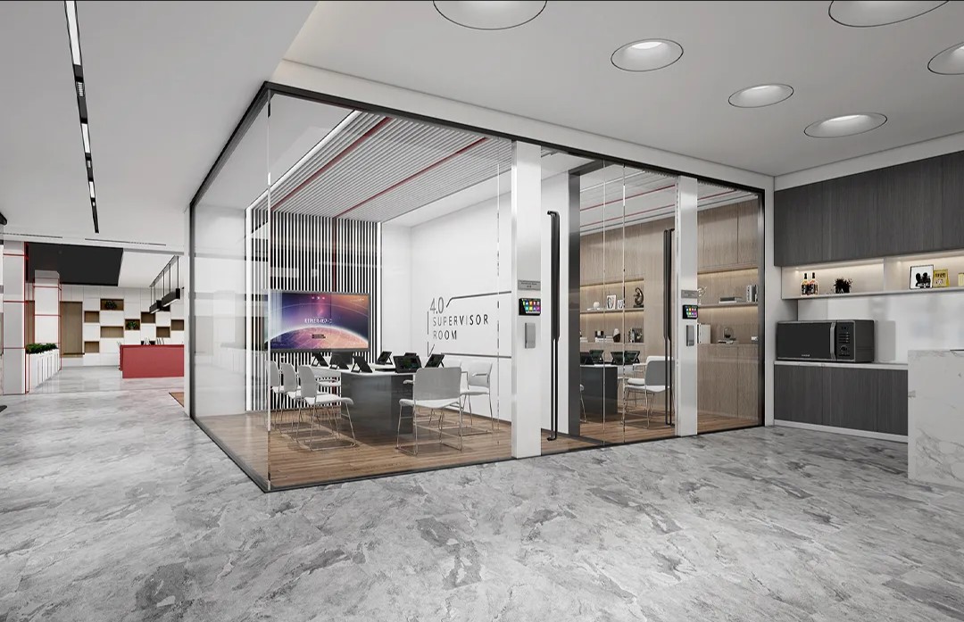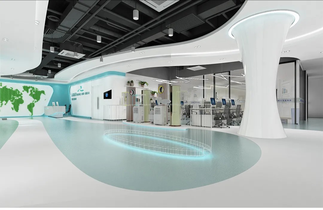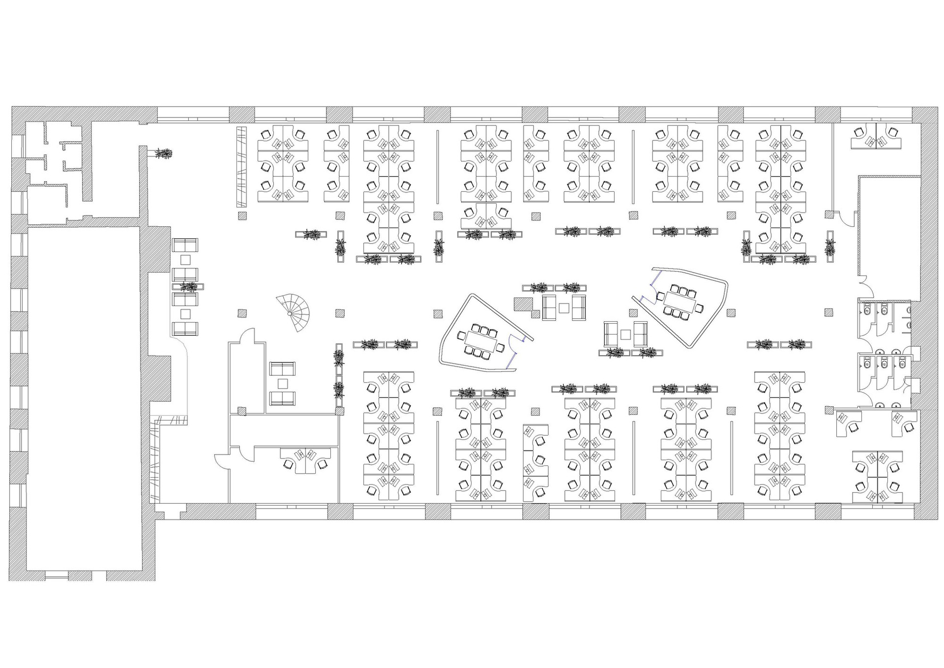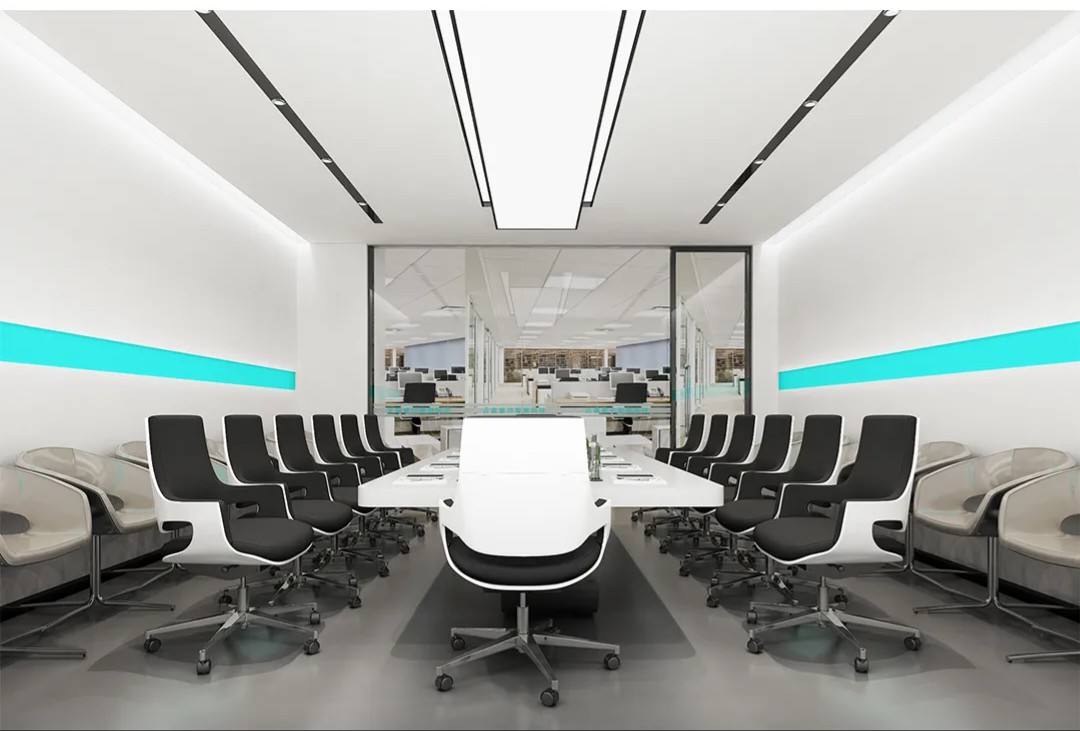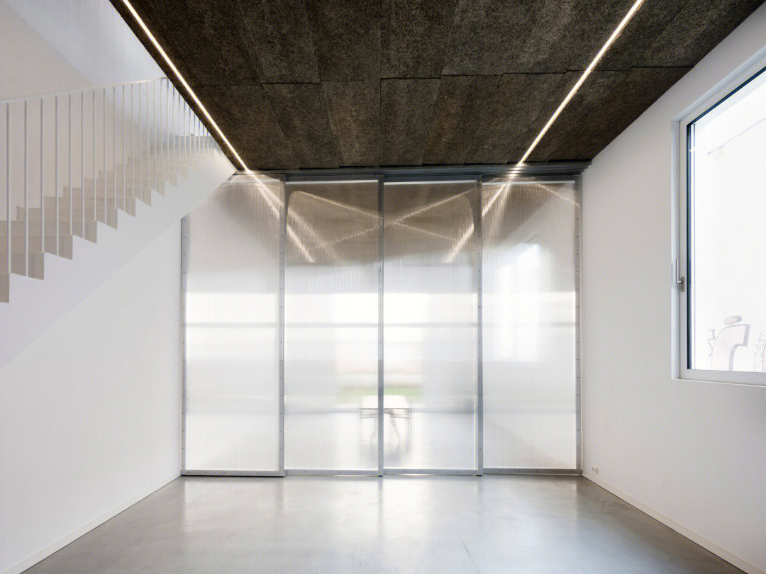 在可以容纳380人的礼堂,木质墙壁犹如台基一般环绕着房间,并与同样是木质的台阶融为一体,为走下楼梯的人带来被温暖包围的感觉。与木材形成对比的是浮动在天花板上的白色“波浪”,它呈现出像织物一般的飘动效果,伴随着光线和声音,它将为公司内的各种大型活动提供生动的背景。