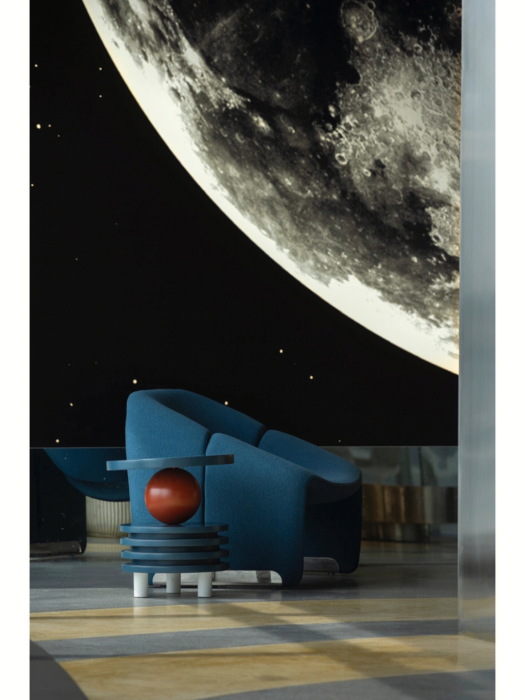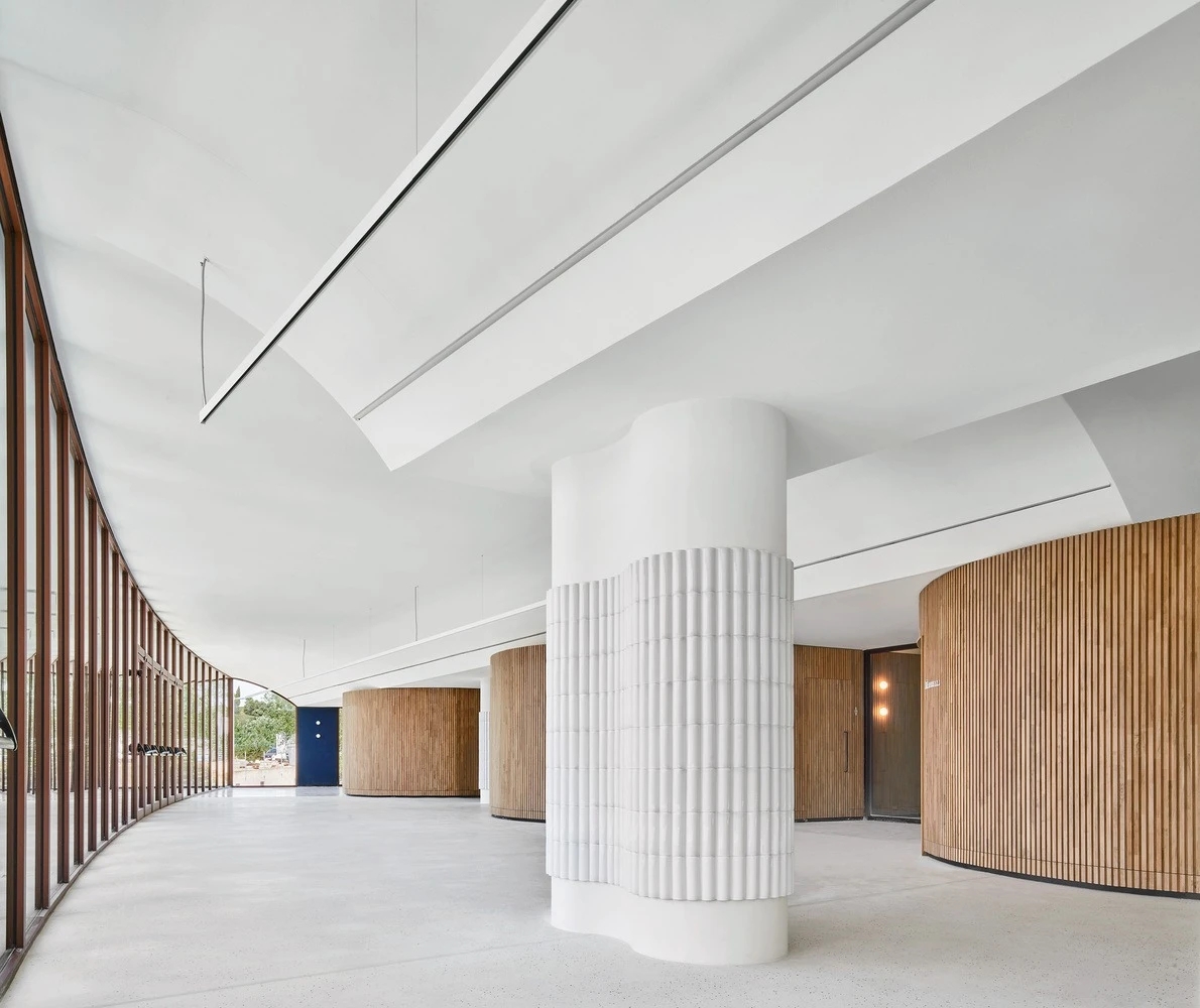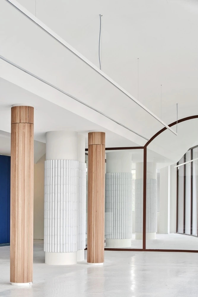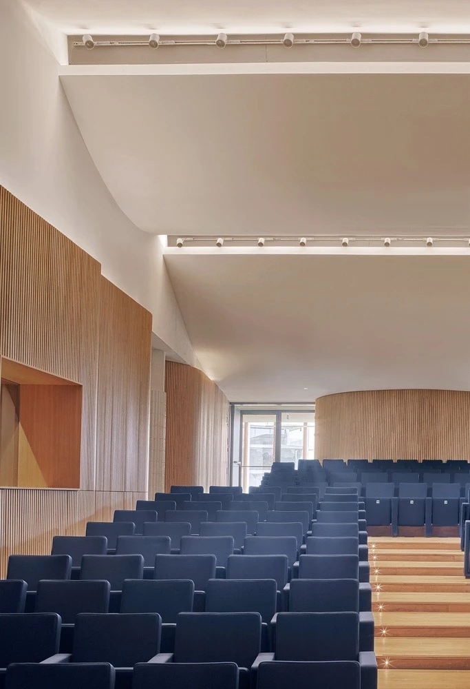 朝着这种概念发展设计,弧形立面尽可能保持干净无装饰,给人一种无尽的延伸感。院子里的装置就像缝错位置、被剪出来做成上衣抵肩(套在肩膀和脖颈外围一圈)的碎布。所有不同的混凝土柱都穿上了量身定做的成衣,让建筑师记起芬兰现代建筑师阿尔瓦·阿尔托(Alvar Aalto)大学项目简洁宽敞的空间元素。泰罗尼亚风格的拱顶天花板将所有东西与柱子紧密相连。弧形的木墙适应了流通空间,使人们在它周围穿梭流动,就像风往上吹起再翩然飘落的裙子。最后背景中蓝色的落地帷幔宛若衬裙般点缀着空间。