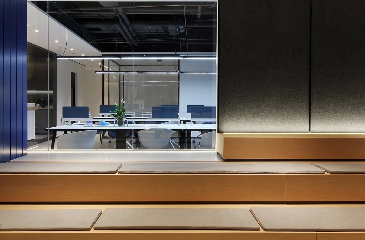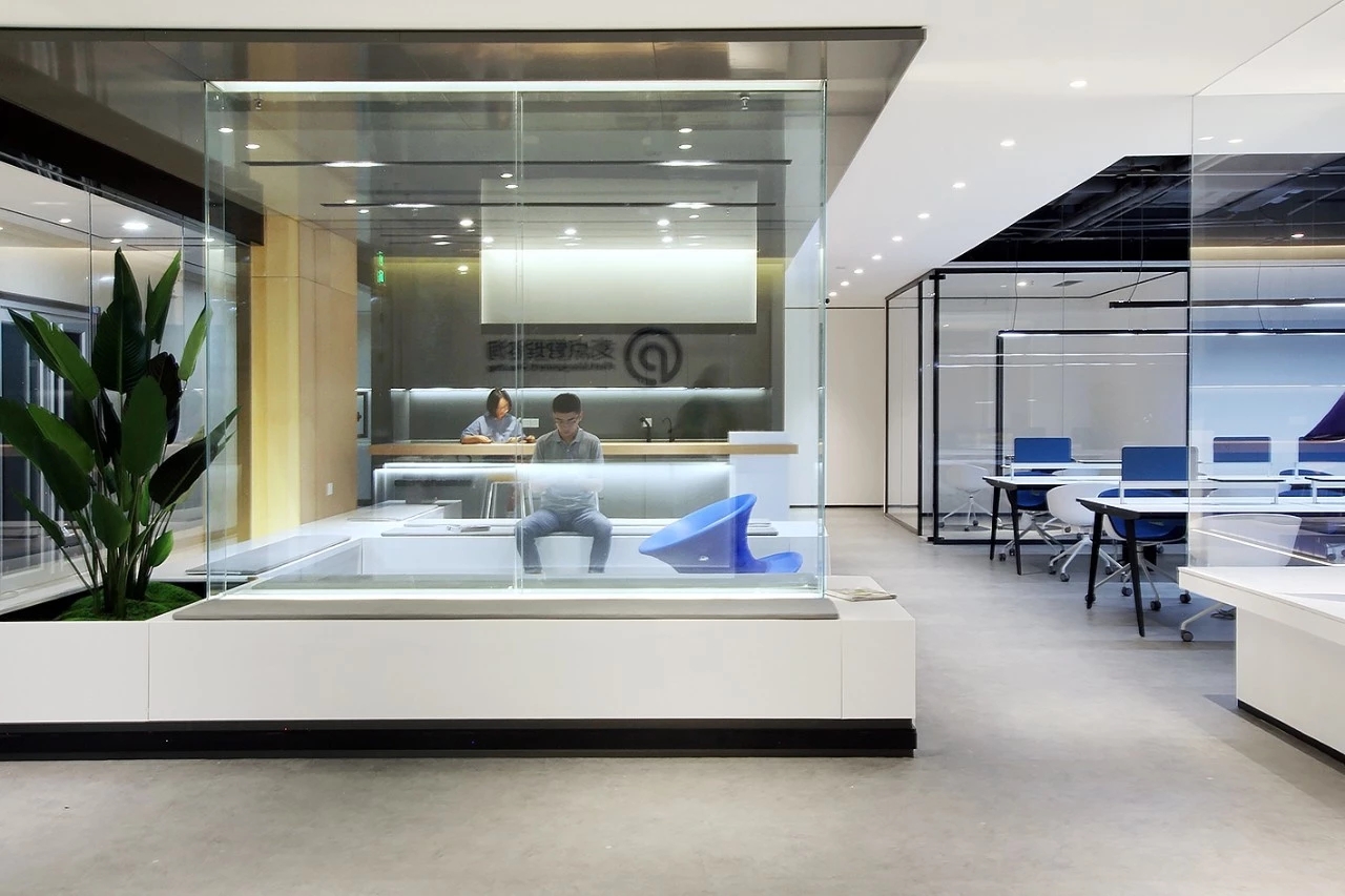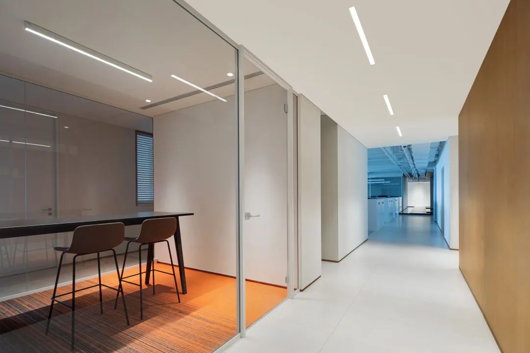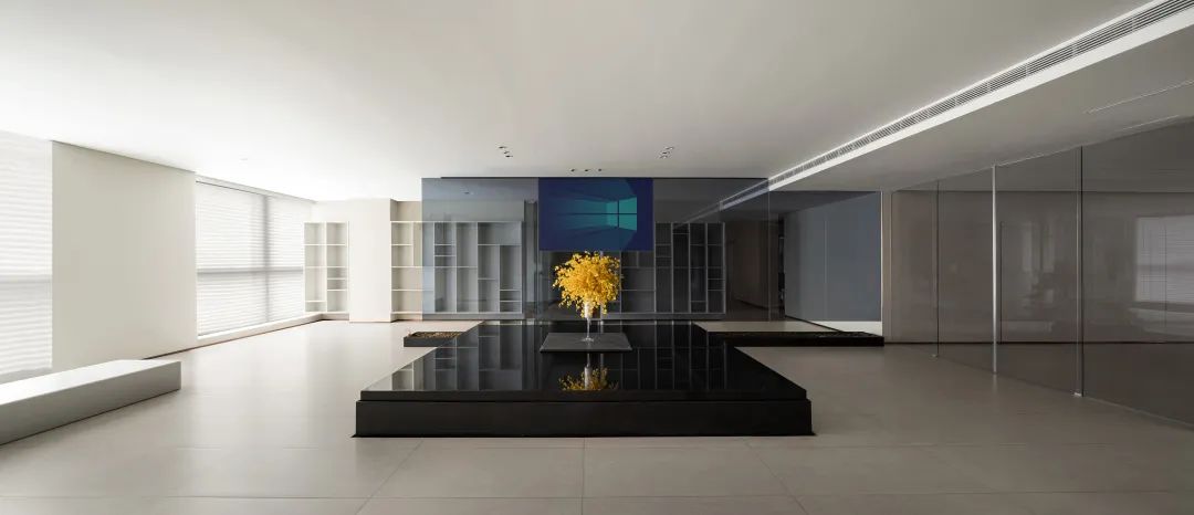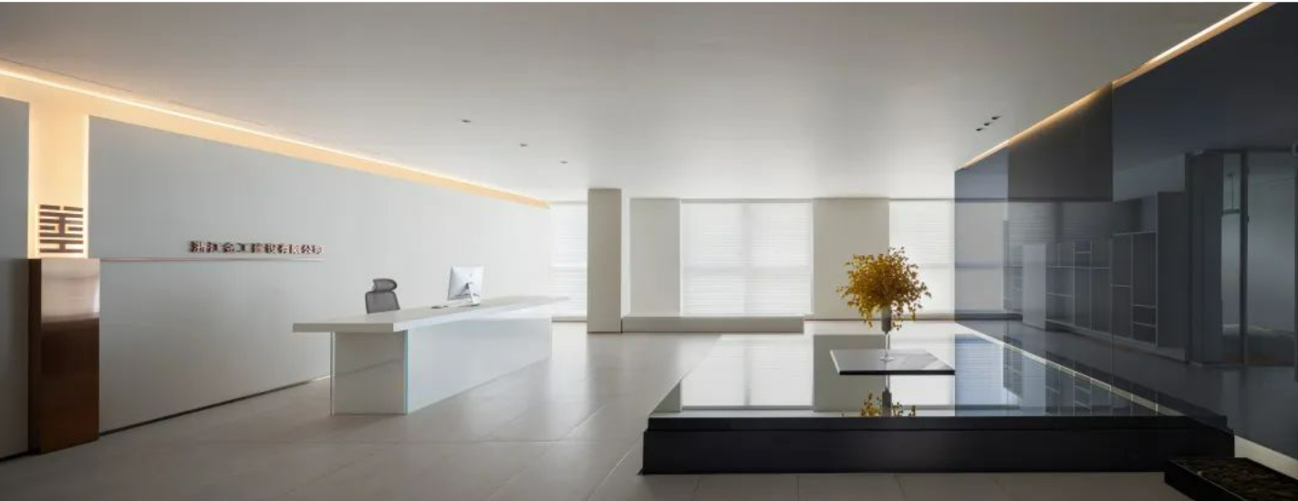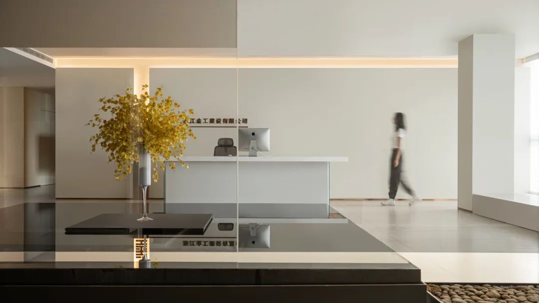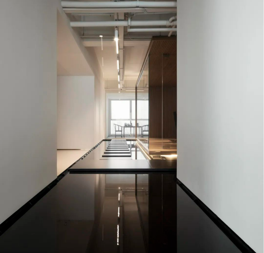 身处普通的高层写字楼,两处水景为办公空间带入生机与意趣,一个超尺度的入口门厅,更像置身于艺术馆,需要穿过水景和玻璃屏风通道后才能进入的办公空间,保证了办公区的安静 。