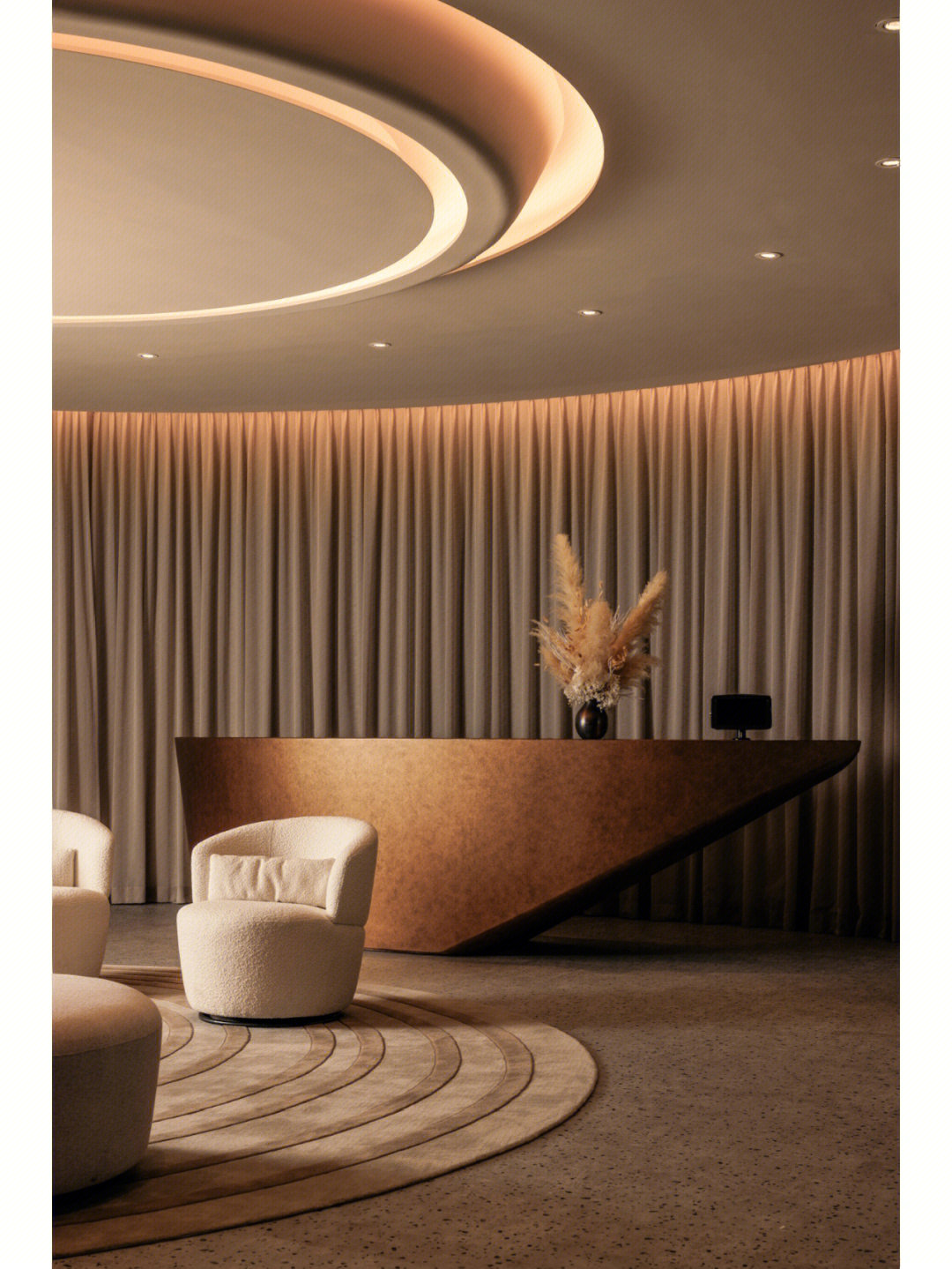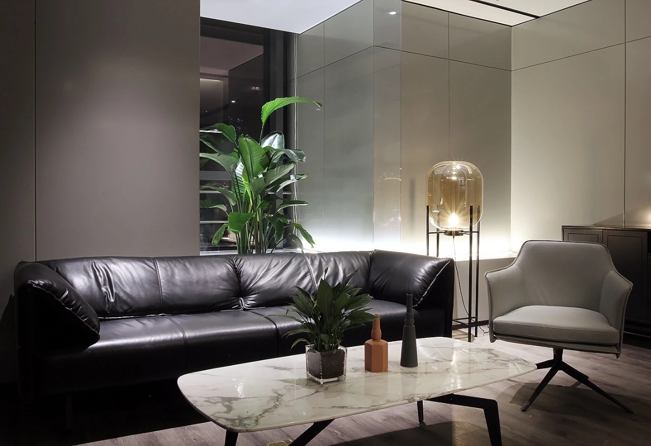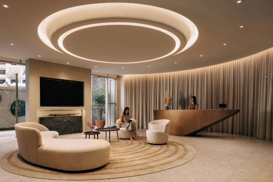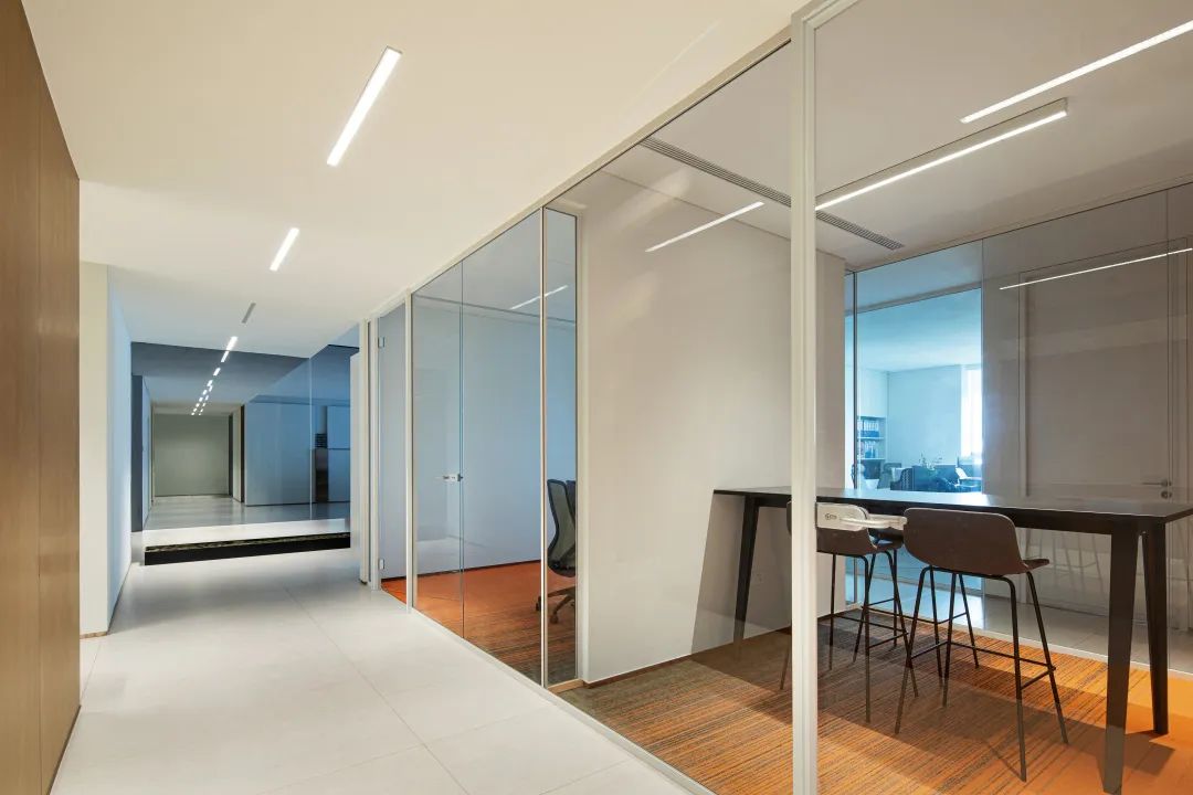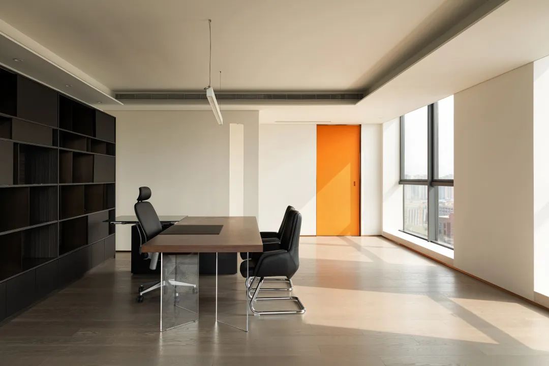 身处普通的高层写字楼,两处水景为办公空间带入生机与意趣,一个超尺度的入口门厅,更像置身于艺术馆,需要穿过水景和玻璃屏风通道后才能进入的办公空间,保证了办公区的安静 。