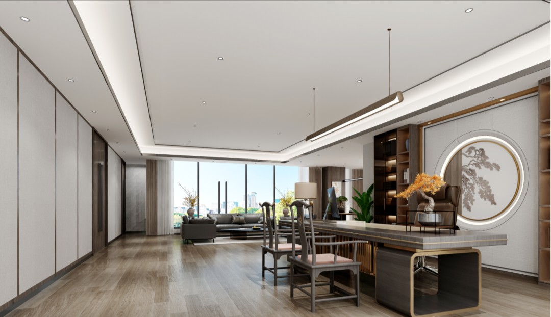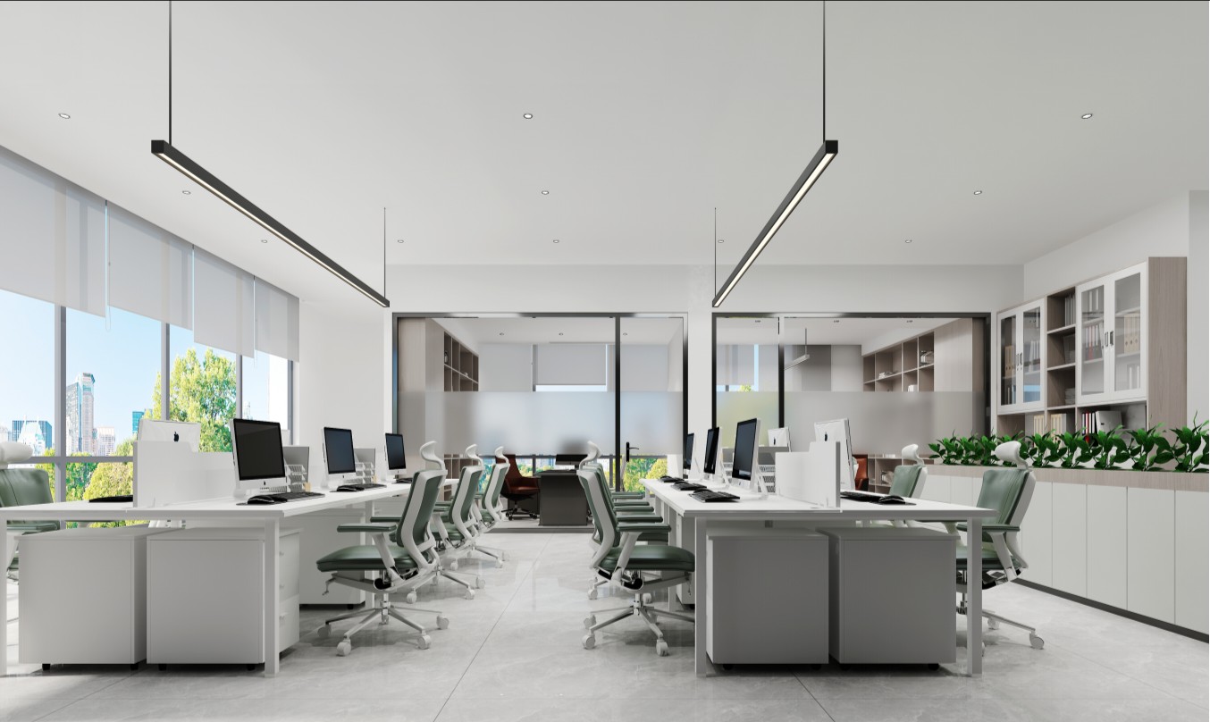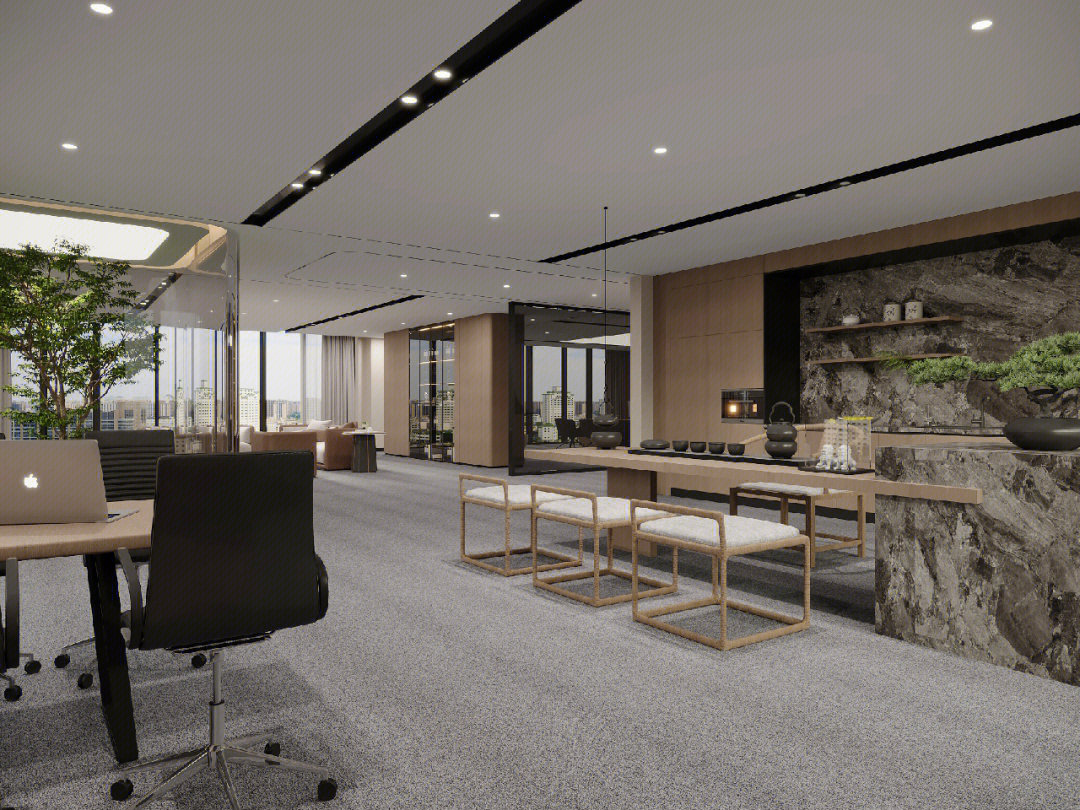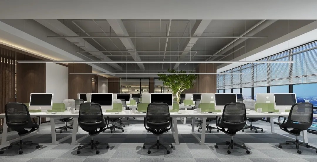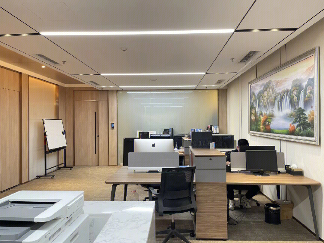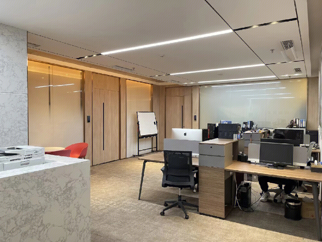 办公区域设计主要以简洁为主,让空间看起来更大气通透,简约的灯饰、科技感色彩明快,让空间表现出灵动的气质。