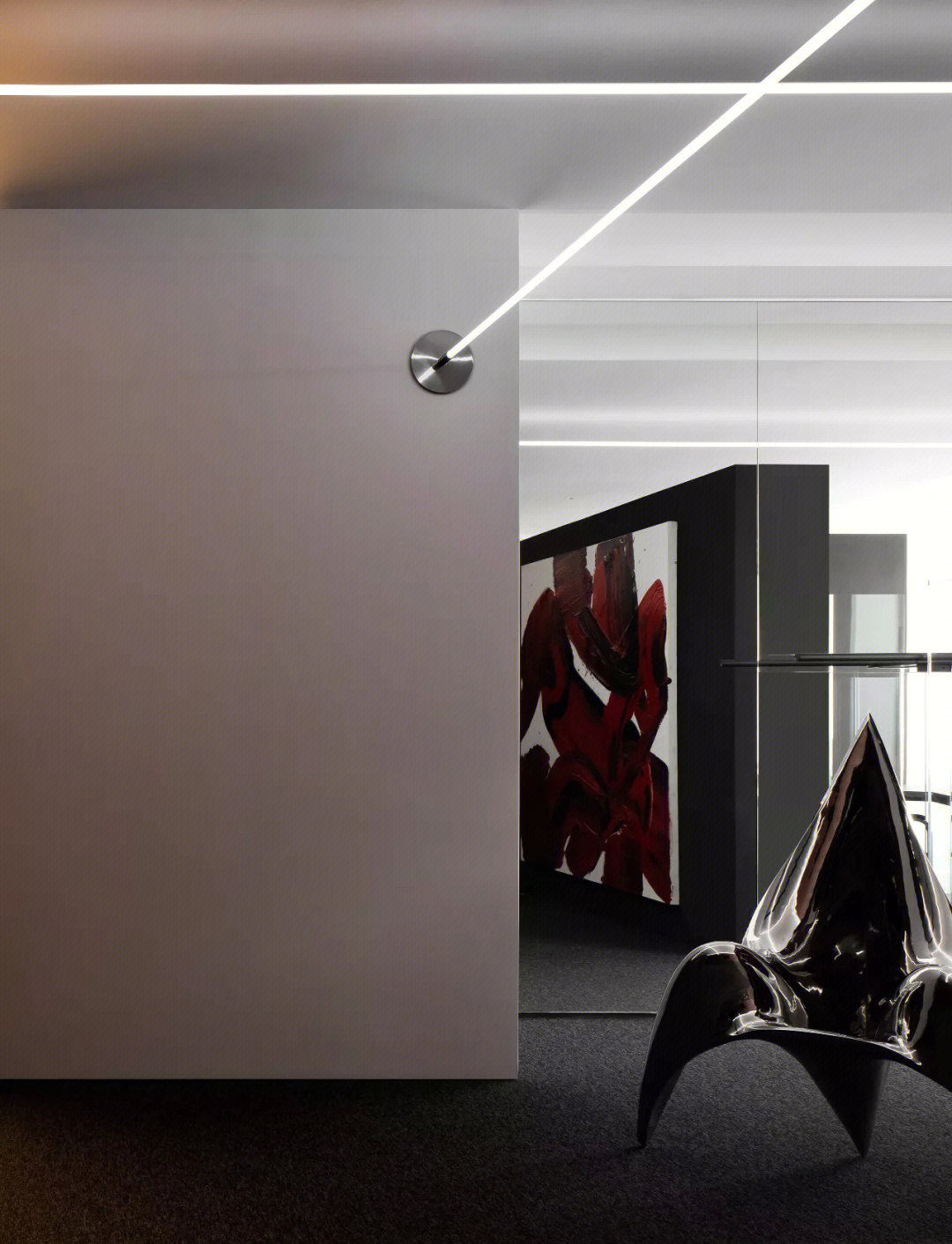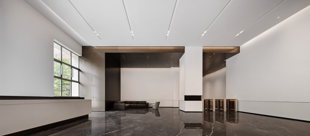 首层大堂,整体气势周正端庄、大气包容,极简中有现代格调,展现出国际化的面貌、艺术化的韵味。大面积落地窗将自然光线尽收其间,生机蓊郁的园林景致亦呈于视野,加之墙身选用了可降解的涂料,将客户旗下绿色节能的产品特质呈以空间的语言,无形之中带给访客身心放松之感。