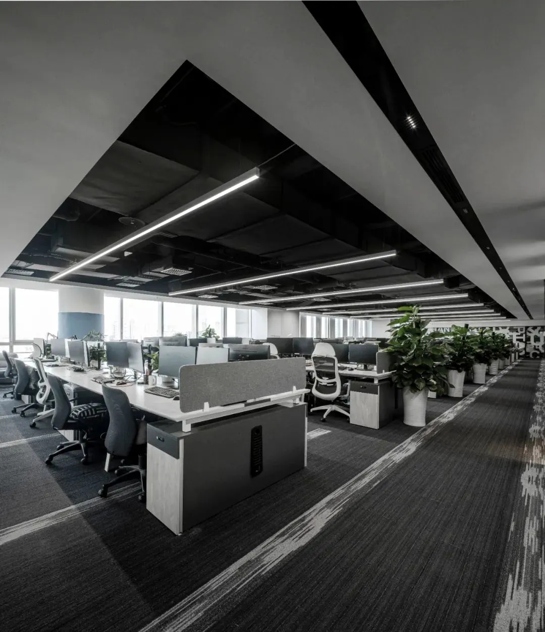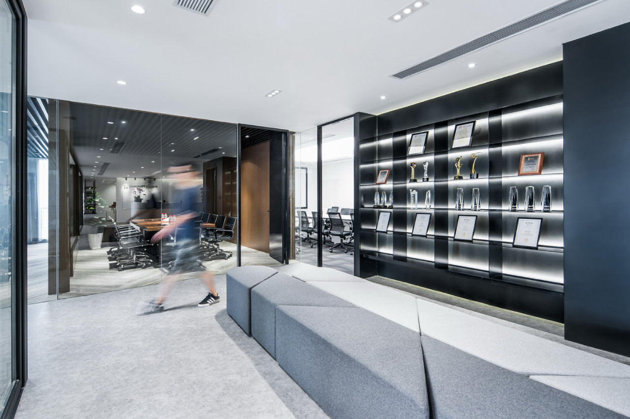 采用现代简约的设计风格,黑、白、木为主色调,以“盒子”为设计概念,运用无限延伸的线条、轻盈的体块、不同材质的碰撞,用一条“飘带”将所有功能空间有机地连通,张弛有度,营造出一个具有活力、凝聚力、创造力的办公空间,给使用者无限的想象空间,激发其创作的灵感和探索的激情。