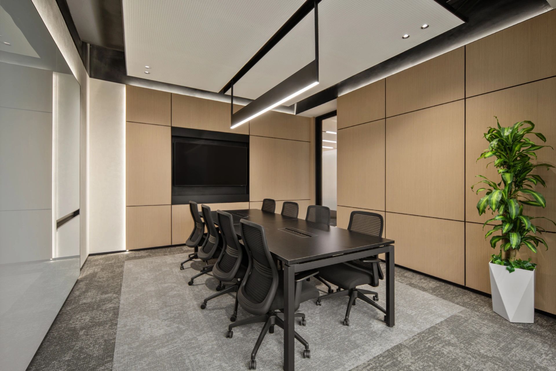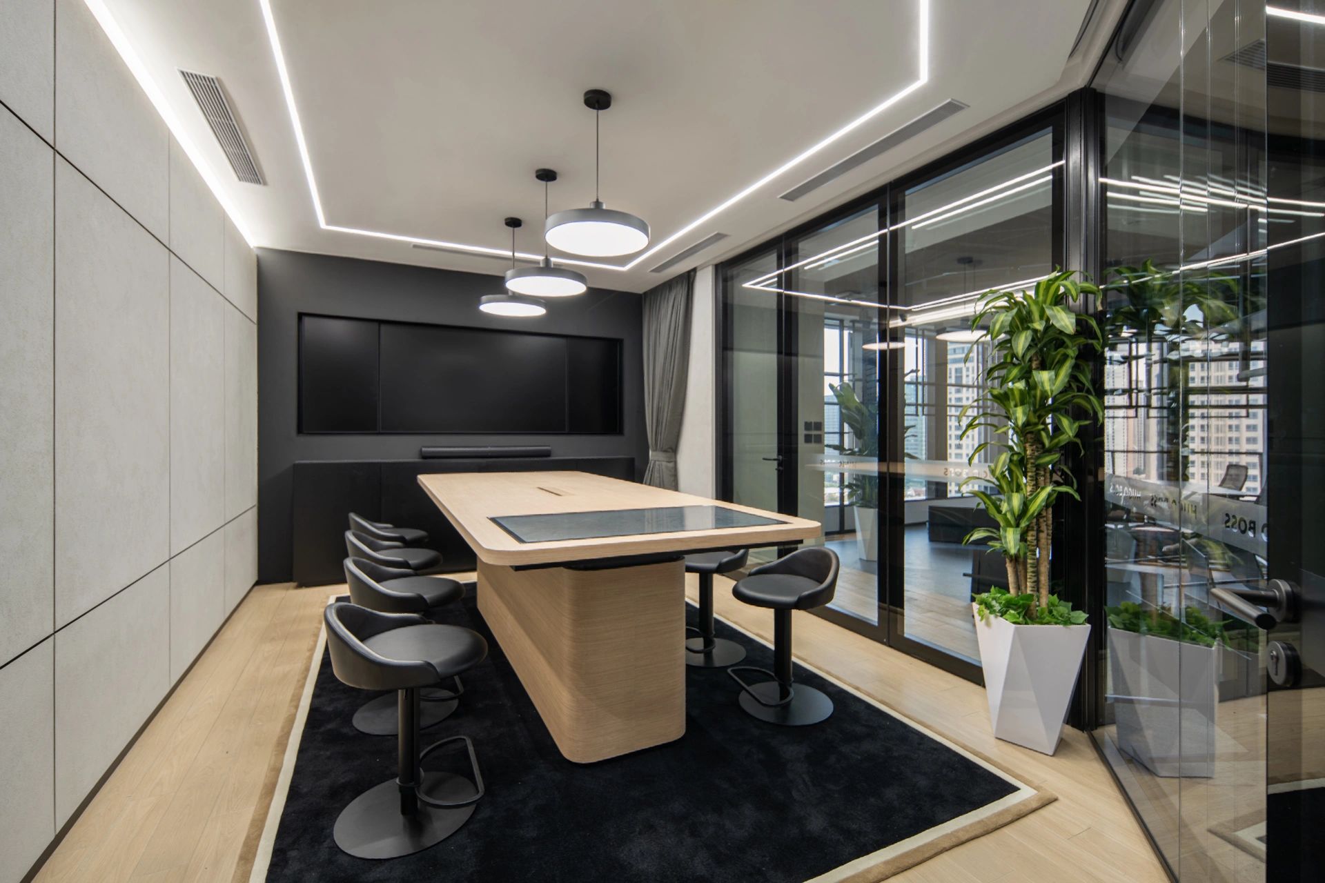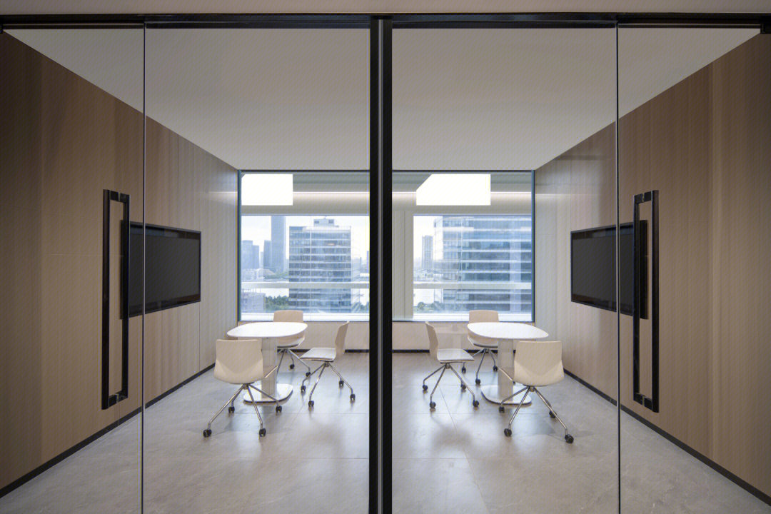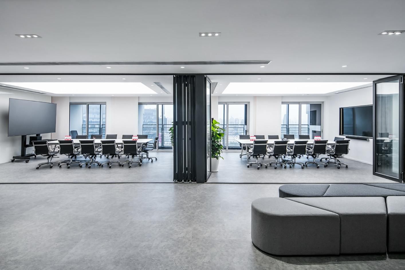 我们在设计上运用了很多组合空间,将整个接待区域打造成一个集接待、会议、洽谈、展示、培训为一体的多功能空间。通过活动折叠门,将三个原本独立的空间连接起来,在会议室不使用的时候可以通过打开折叠门的方式让整个接待区域空间感提升三倍。在进行公司例会时,接待区域又可以作为例会空间的一部分,让空间的利用率大大提升。