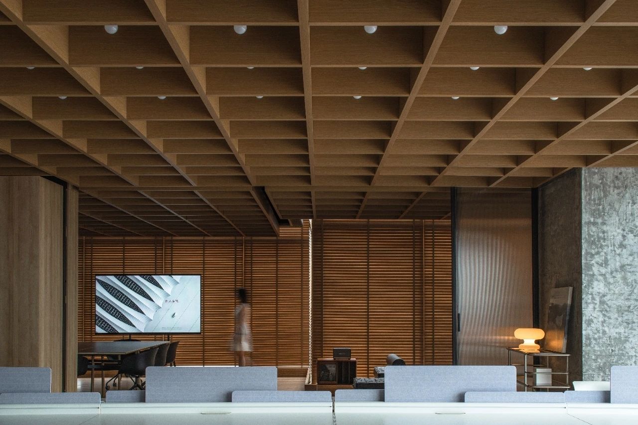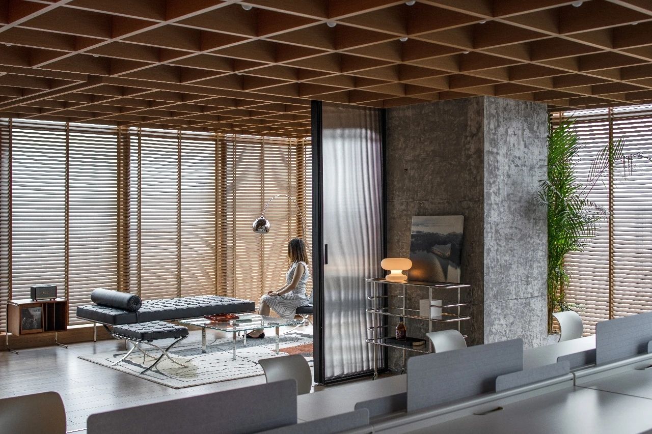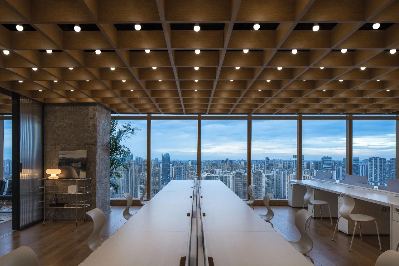 设计以空间的舒适性为出发点,温润柔和的木色成为了空间的整体底色,以不同的材料形式在顶面、地面、立面得以呈现。白色的办公桌赋予空间明快轻松,剔除掉乳胶漆表皮的混凝土立柱彰显力量感与时间感,精心设计的家具体系,灵活的空间隔断,构成了全部的空间表征,宛如一幅当代城市山水画卷。