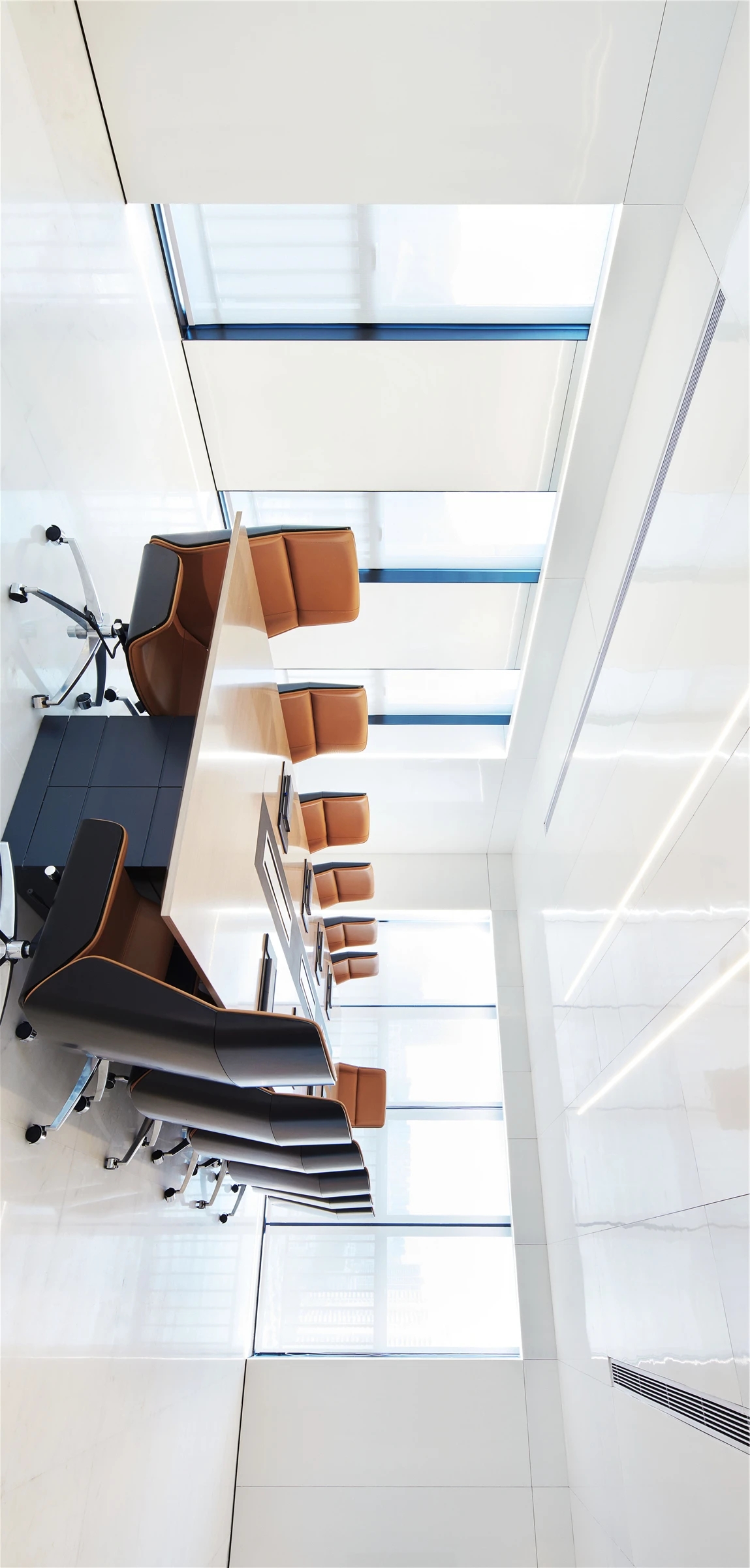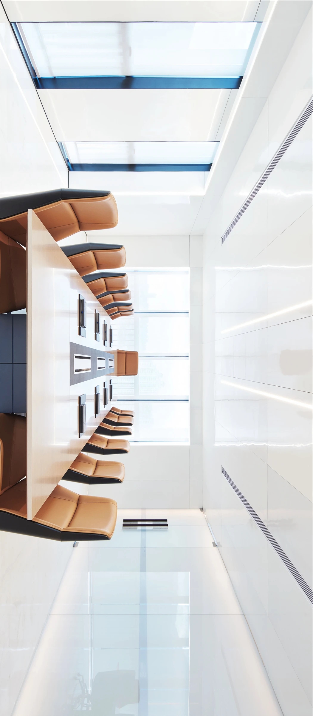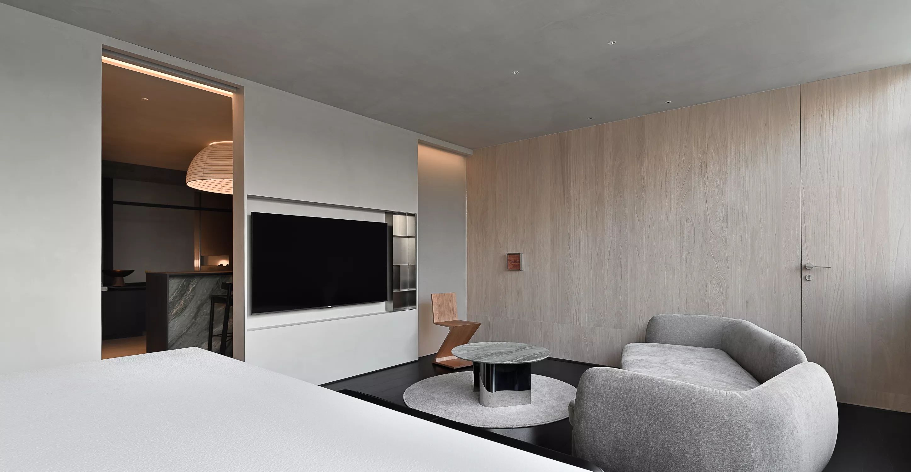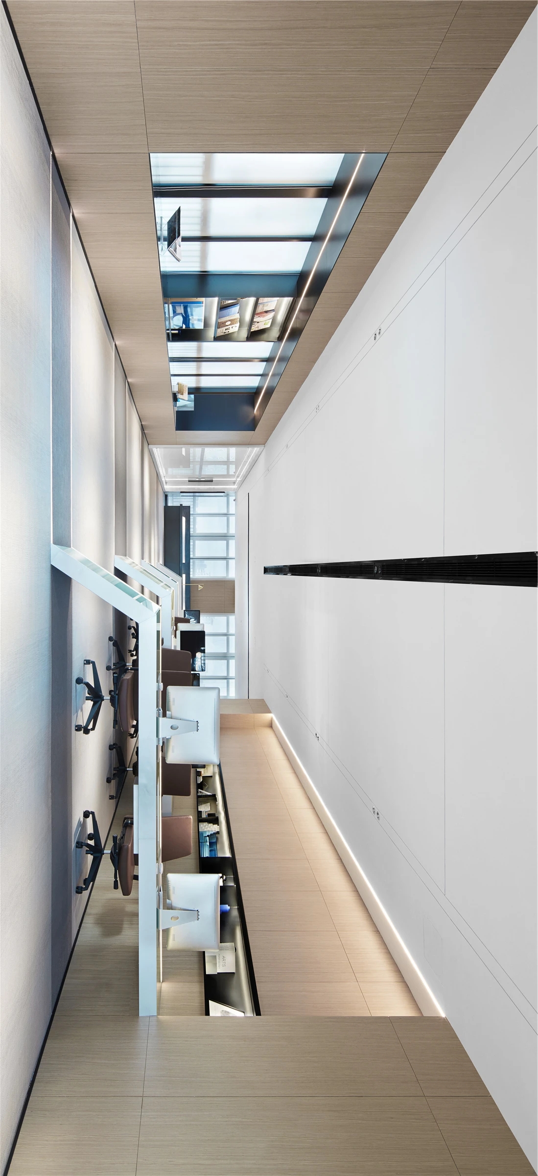低调、中庸、引而不发,中式处世哲学对现代生活依旧有着潜移默化的影响。以明亮温暖的感官打造一个舒适的对话空间,透光而不透明的夹丝玻璃保护隐私性。一个非典型意义上的开放式交流空间,足以平衡工作、心理的双向需求。