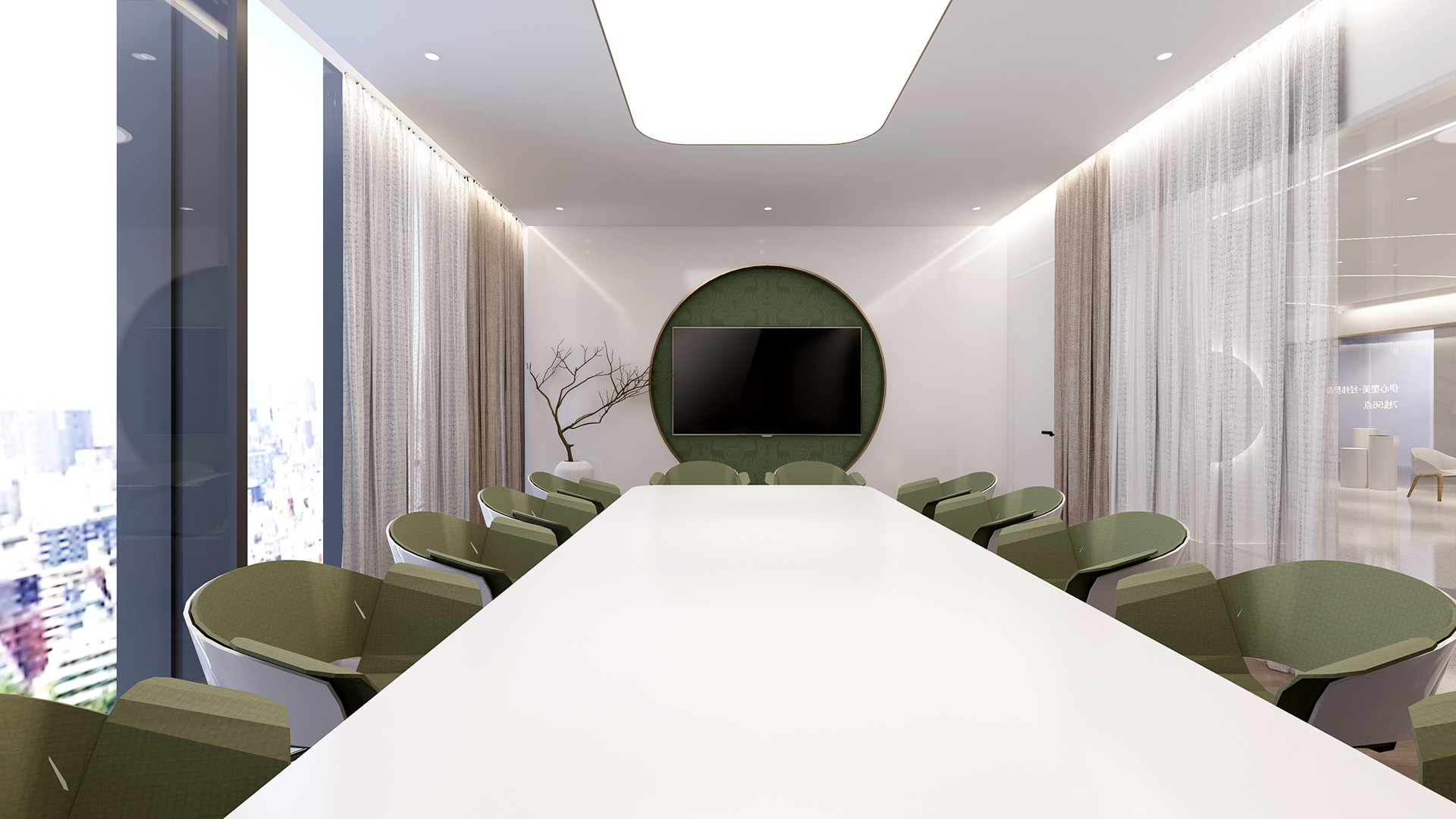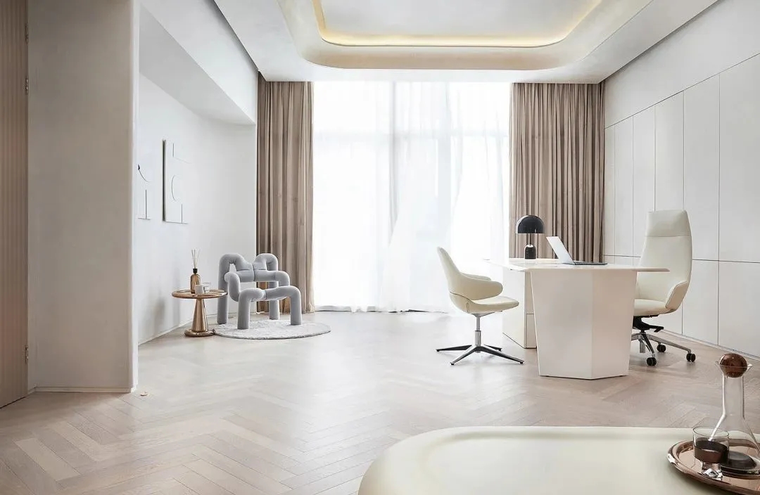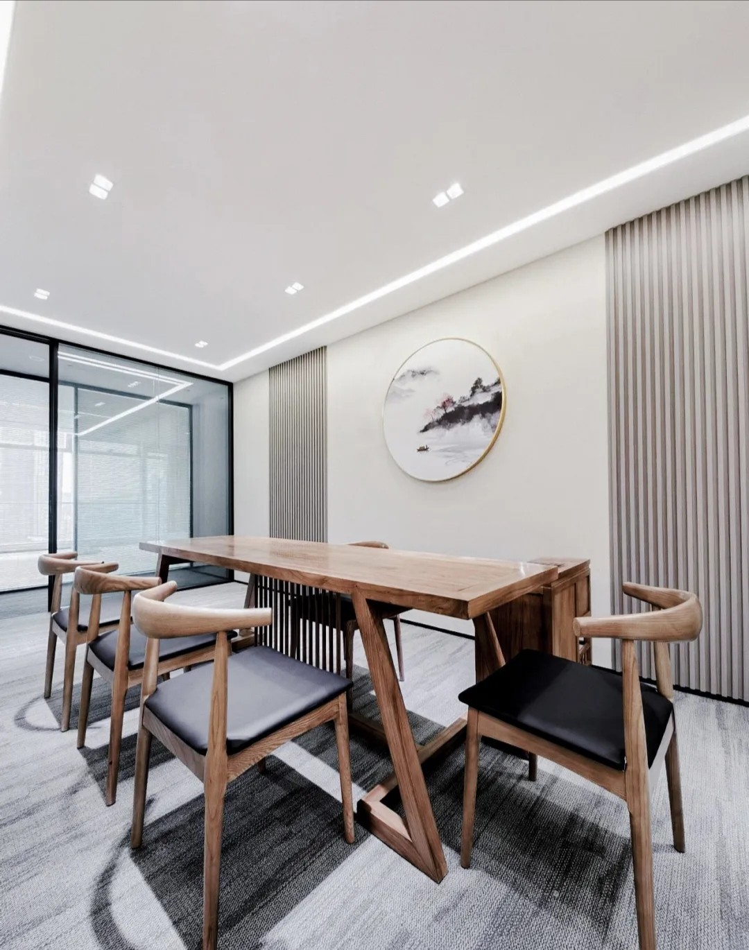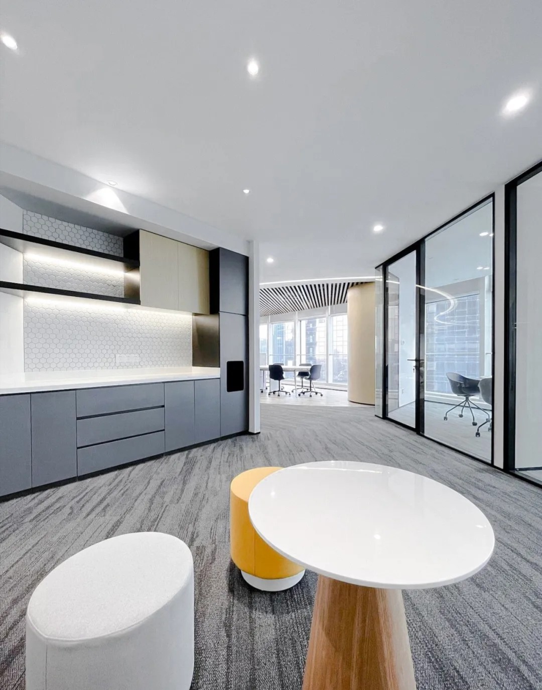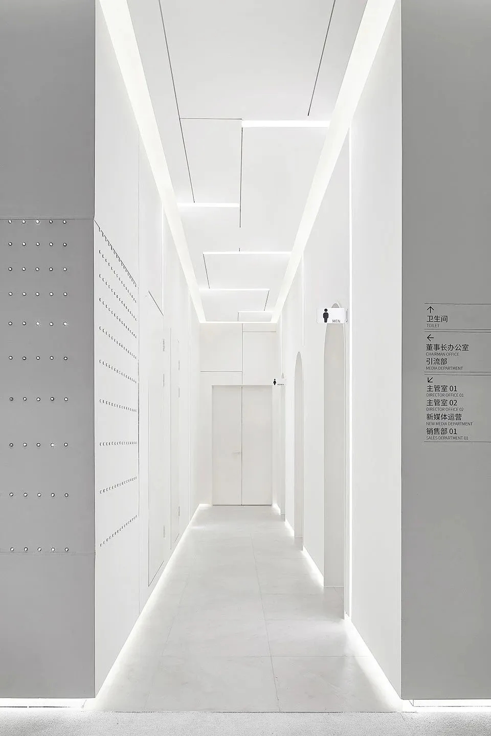 本项目中我们设计师更注重营造具有亲和力、吸引力和高可信度的空间氛围,为律所重置全新的空间蓝图。设计通过重塑和弱化原本柱体以及逼仄的天花,创造迎接客户和关怀员工的开放性空间。同时让律所各空间相互流通,将开放空间与私密性空间相互协调相互连接且不失整体性。圆弧形的前台背景掩盖了原本存在的柱子,同时增强了空间的横向延伸。爵士白大理石地面搭配墙体饰面的木纹肌理让来访者感受到整体空间带来的稳重、亲和与空间的包容性。通过强调空间与空间的流通,在区域与区域之间,自由的变化。