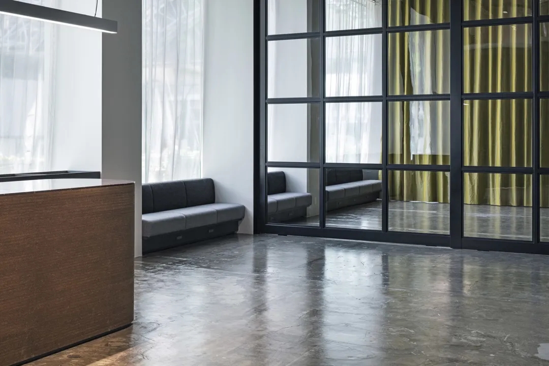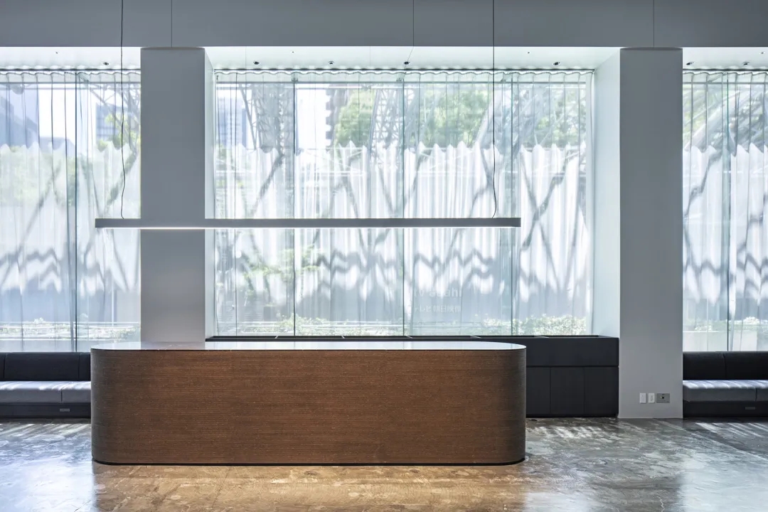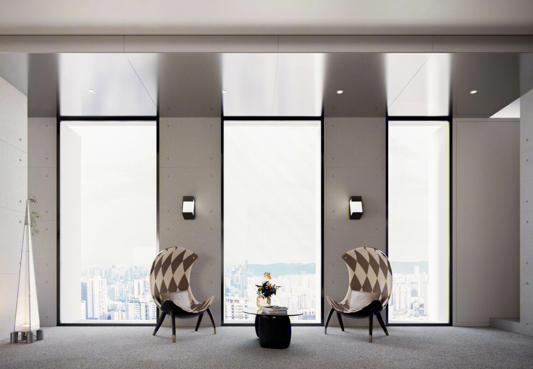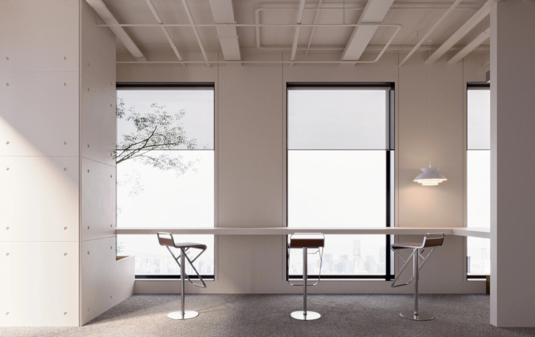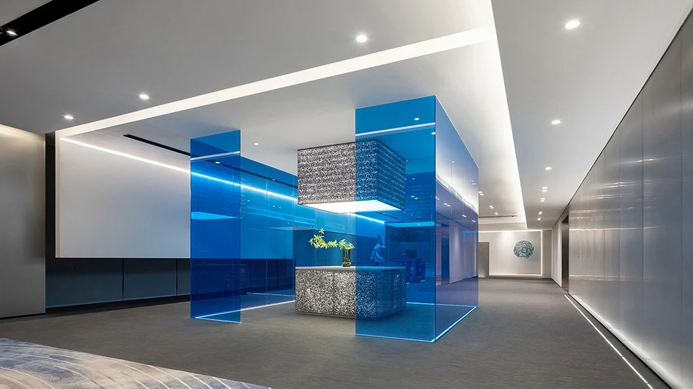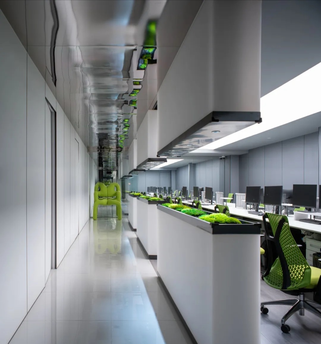 室内空间由功能家具和装置形成自然分隔,空间整体因祛除隔断而产生了流动,这与科学巨匠斯蒂芬·霍金的宇宙观具有一种相通性。Robbie太空兔和陨石一起来到这里,被安置在接待台和会议室中,向来访的人们讲述宇宙的故事,犹如那些激动人心的创业事迹一样,源于有限的奇点,产生突破界限的无穷能量。