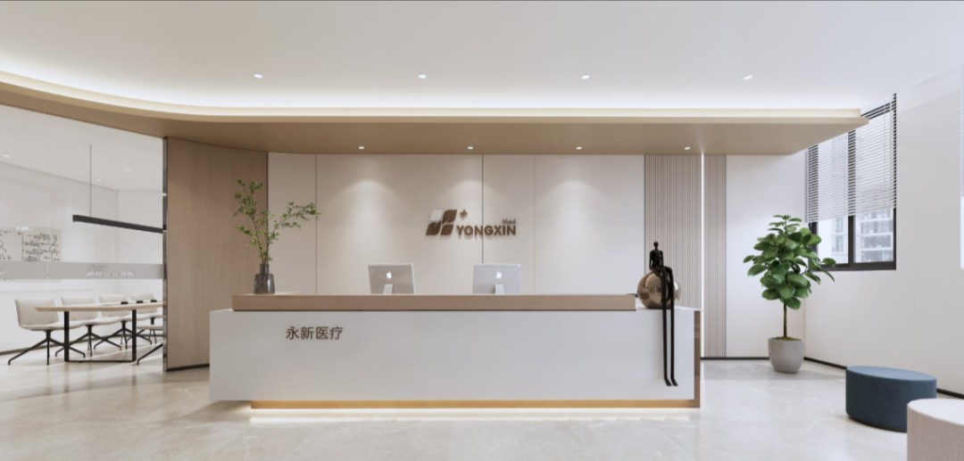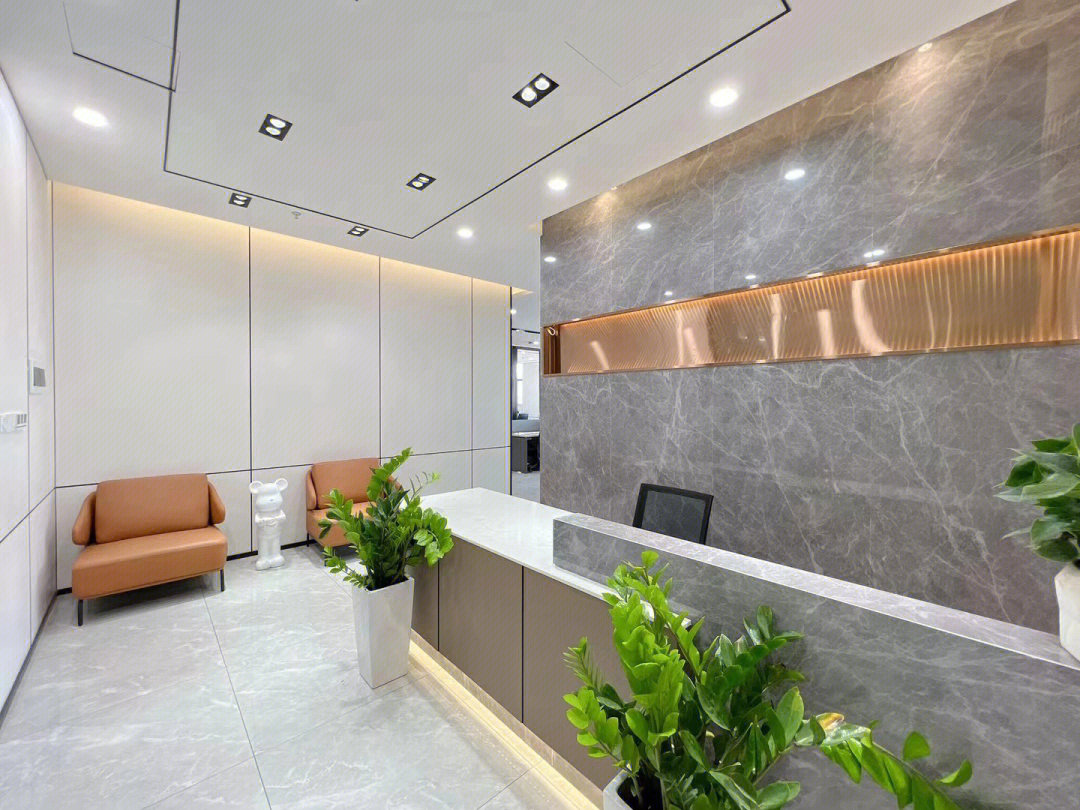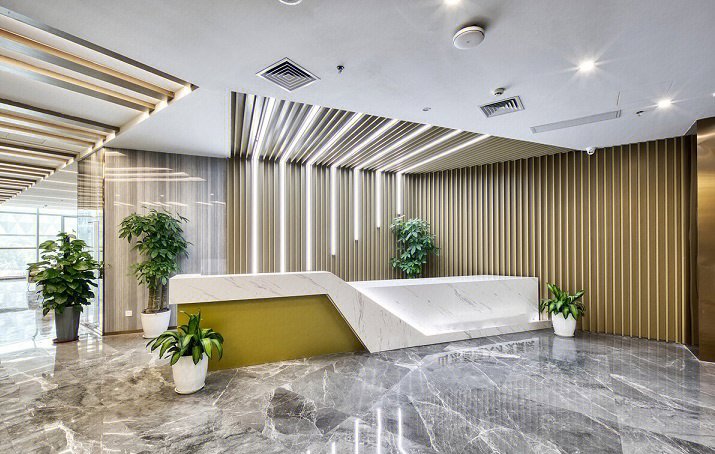 前台是特殊的半椭圆不规则空间,弧形的墙面大面使用木饰面,裁剪出像跳跃的琴键,在射灯和筒灯的映射下,突出了木饰面的纹路与光泽,营造舒适轻松的氛围。在企业logo的展示区域,点挂大面积爵士白大理石板面,与大理石地面交相呼应。