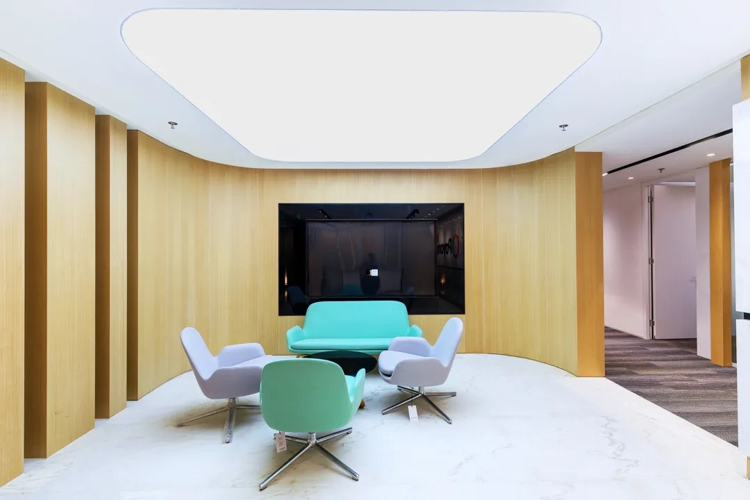 开放式的茶水间,引申到更为广阔的休闲区,风格统一的原木色系,环柱而设的收纳柜与弧形卡座的设计,柔化了整个空间。不仅增加了空间的收纳功能,还可以展示企业文化。
