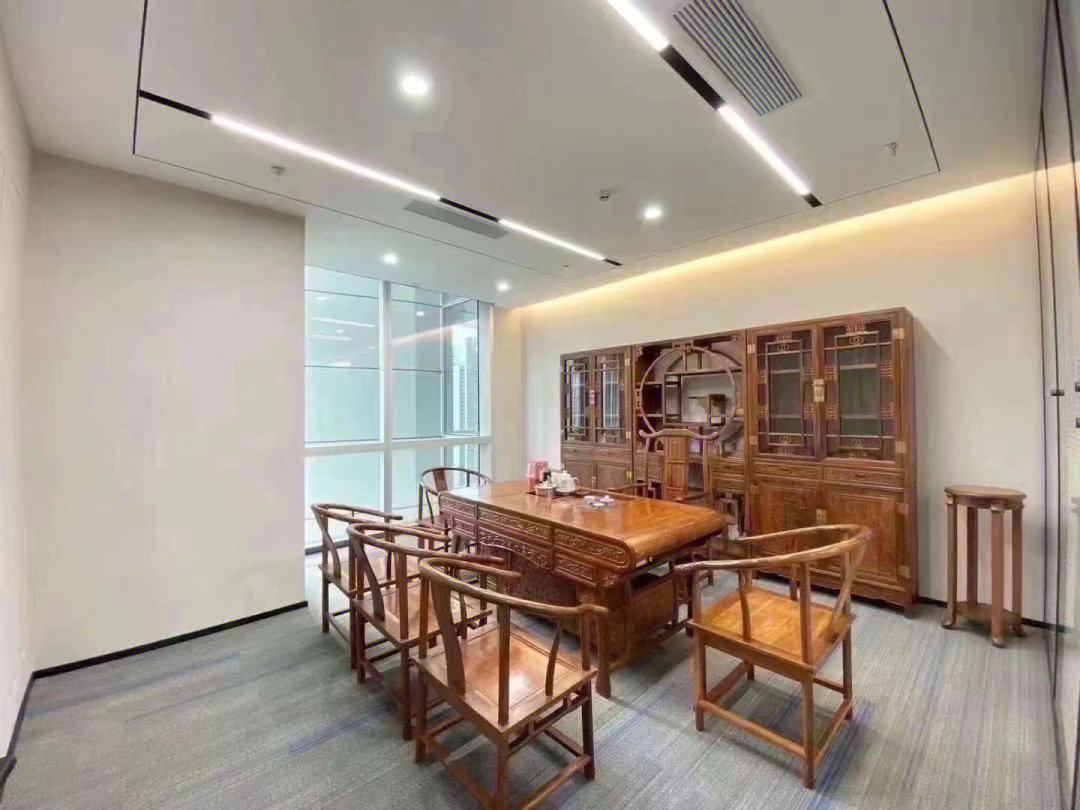 与接待室相通,设置了开阔明亮的大型会议室,与前厅相似的黑色背景搭配几何线型灯光的天花,将包含宇宙空间秘密的黑洞元素延伸至此。