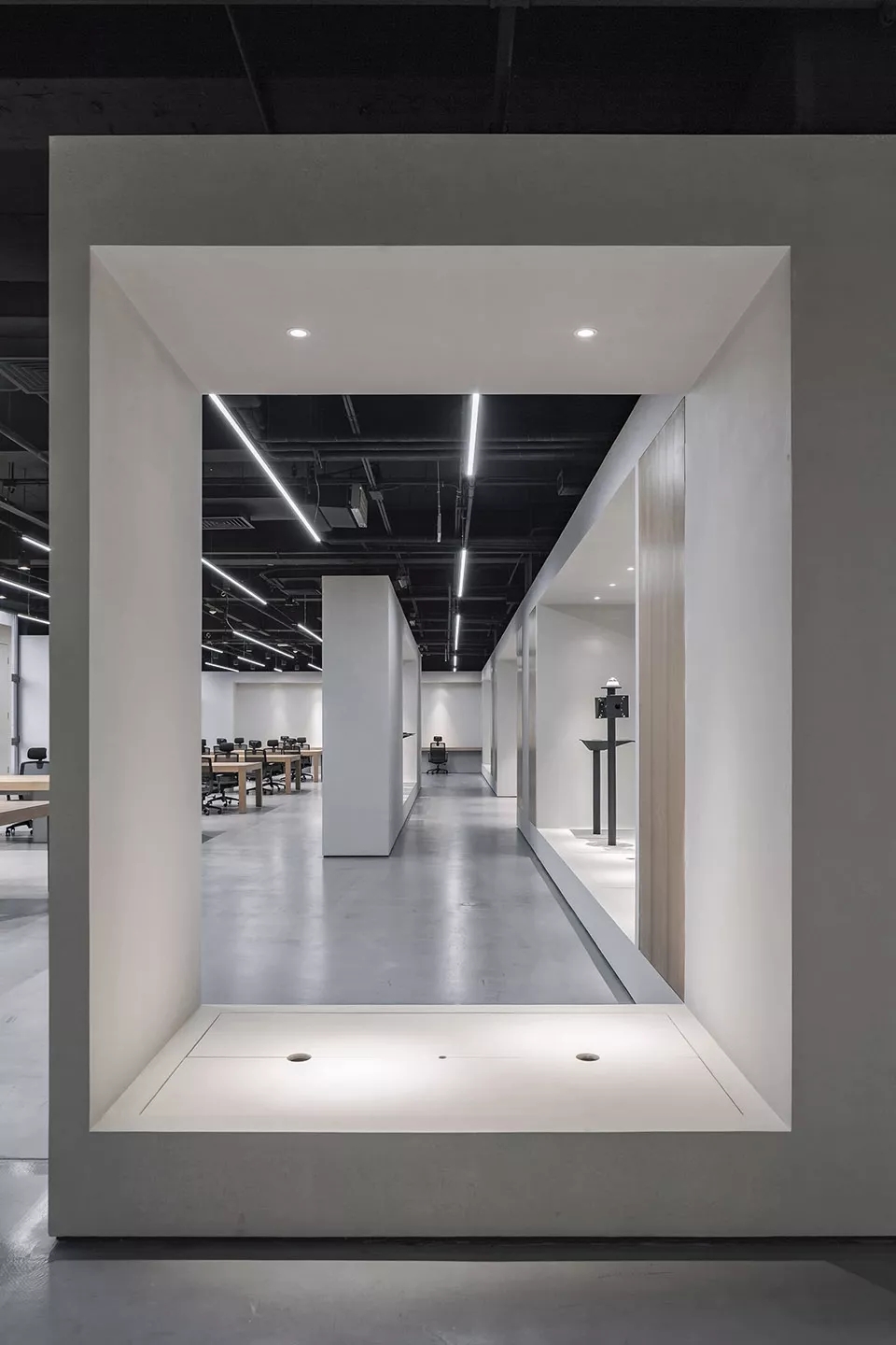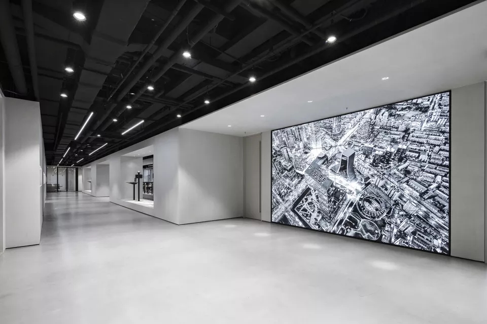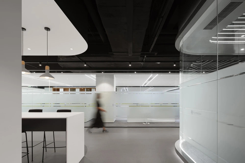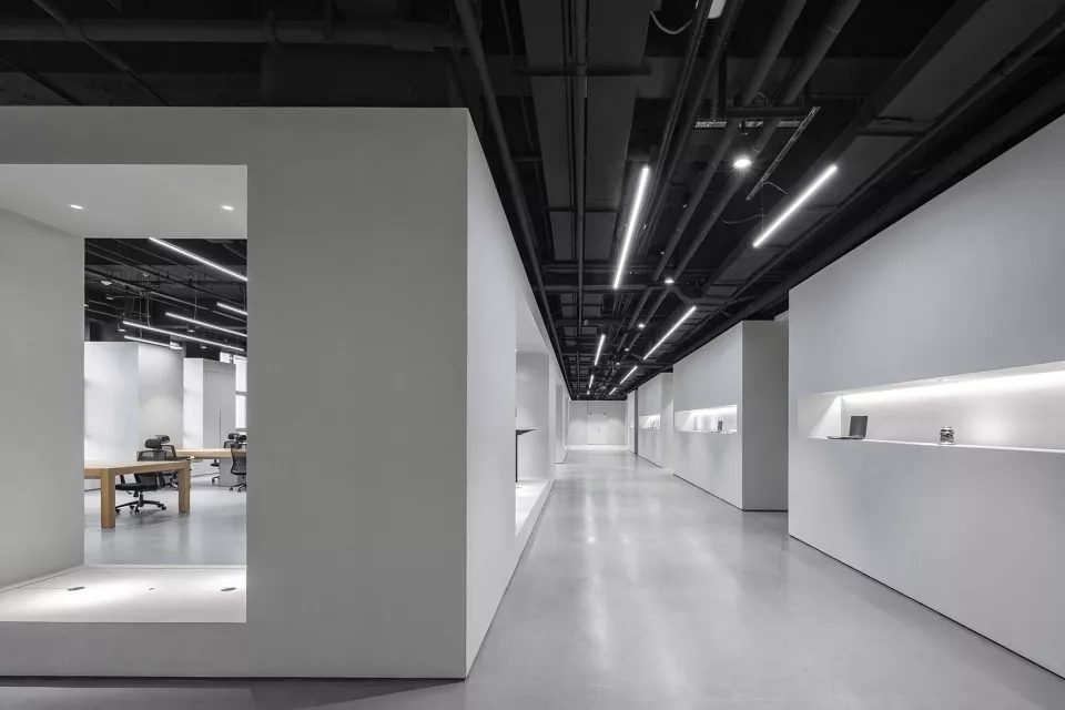 此项目设计使空间的视觉与流线相融,互动展示空间为线型品字布局,品字布局的负型形成了员工的流线。