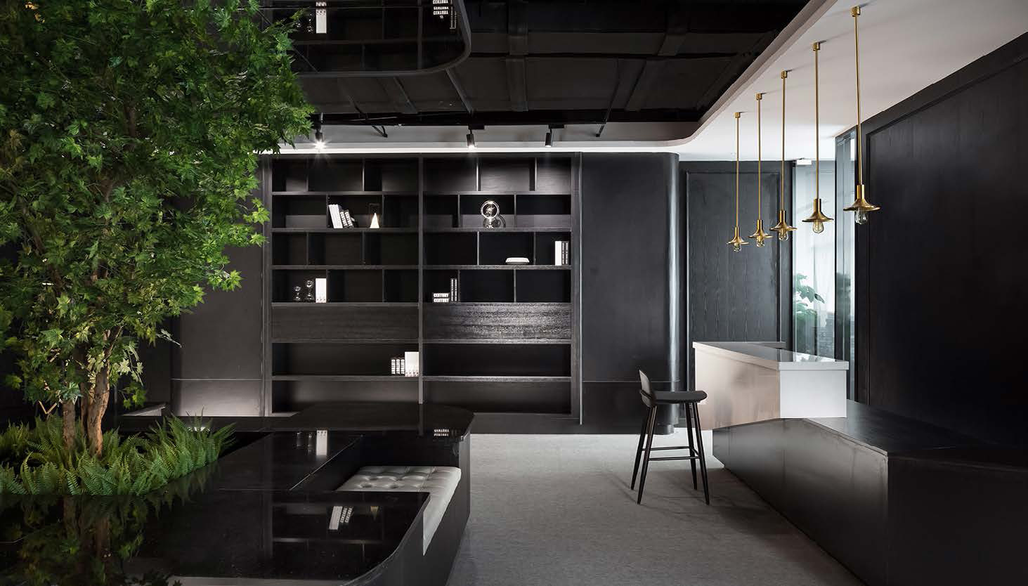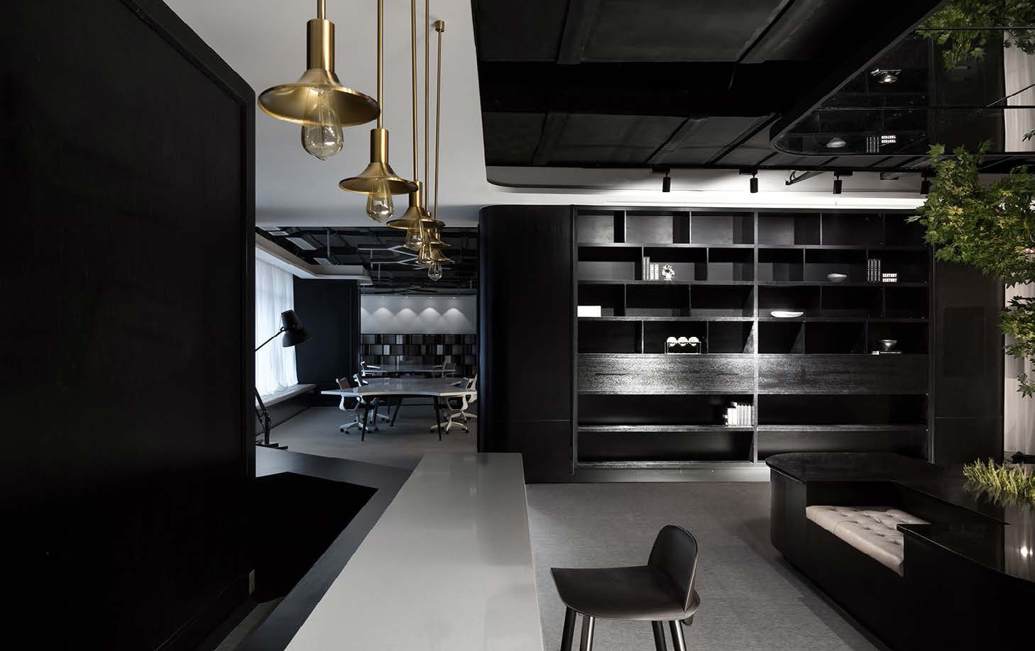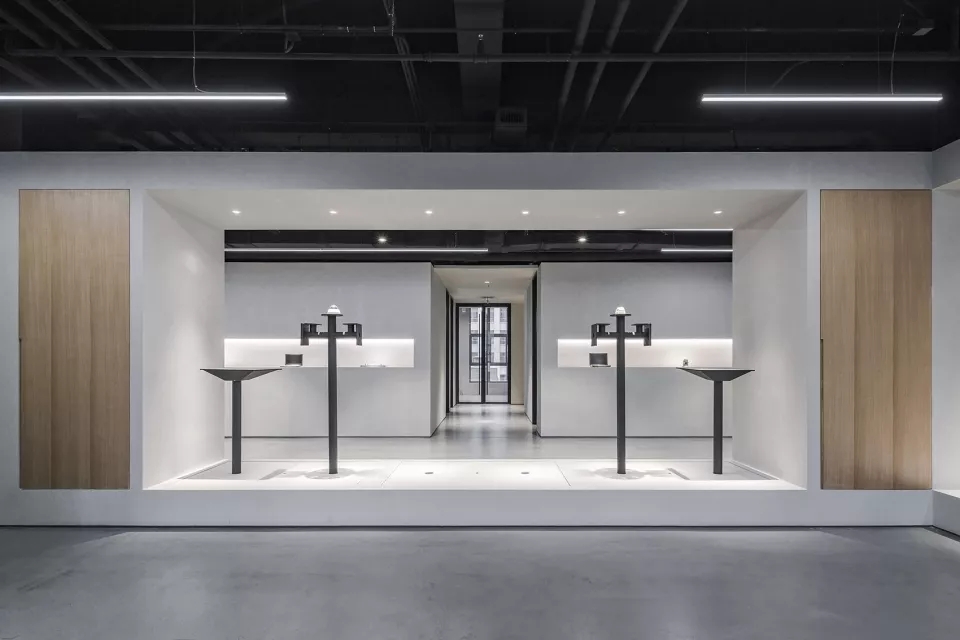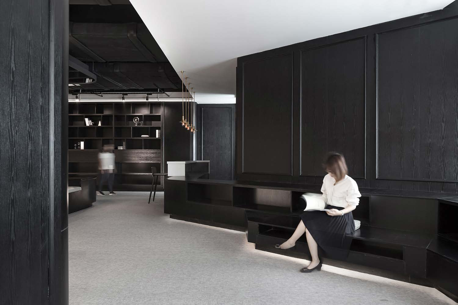此项目设计使空间的视觉与流线相融,互动展示空间为线型品字布局,品字布局的负型形成了员工的流线。