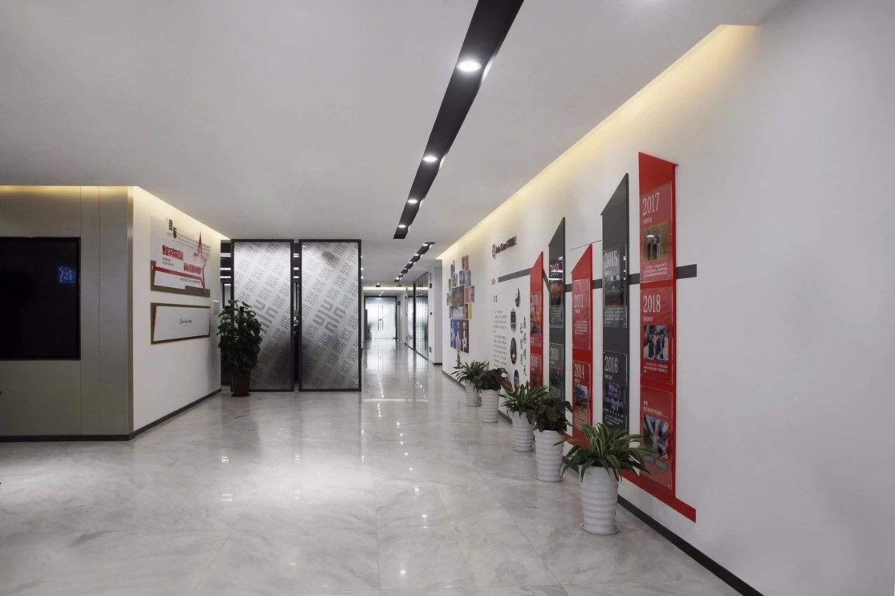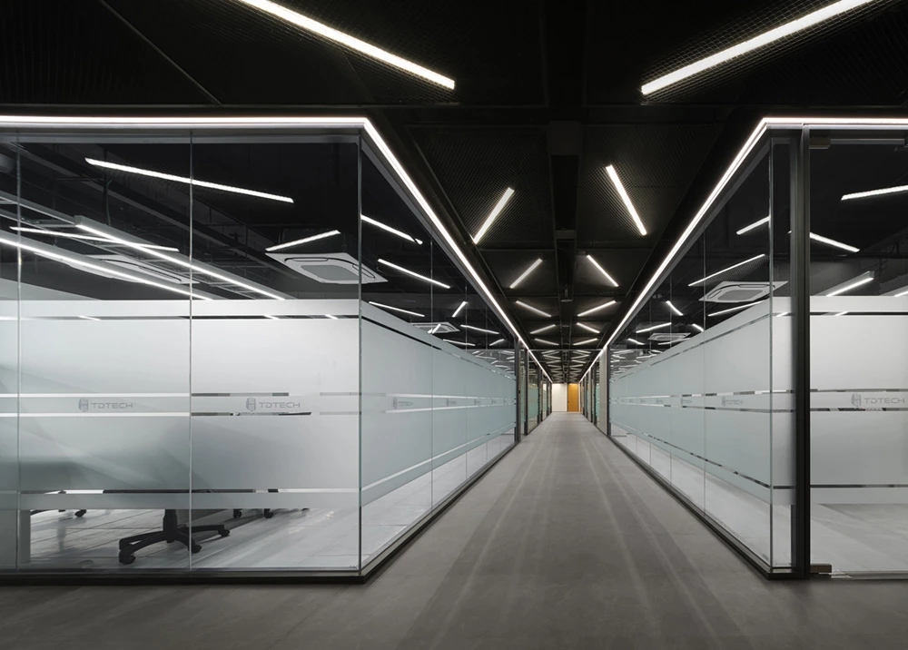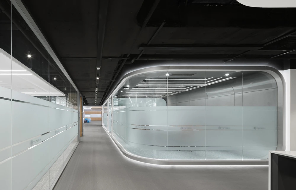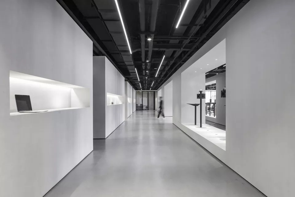 通往独立办公室的主要通道两侧同样是互动展示空间与产品展示墙,独立办公室人员路线必经展示群组空间;通过这两种人本身的行为路线与功能结合的设计,把两种空间完全融合在一起。