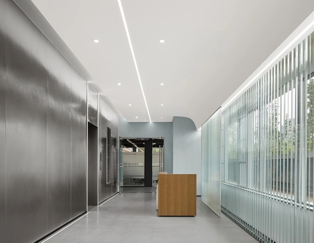 建筑的原始电梯厅较为窄长,连接了位于两端的主要办公空间。我们将柱状的长虹玻璃交叠并置组成虚透的背景墙,营造了一处简约并富有科技感的接待区域。