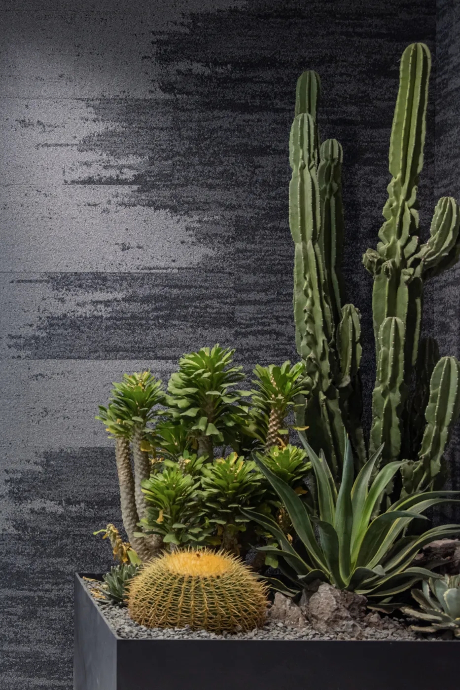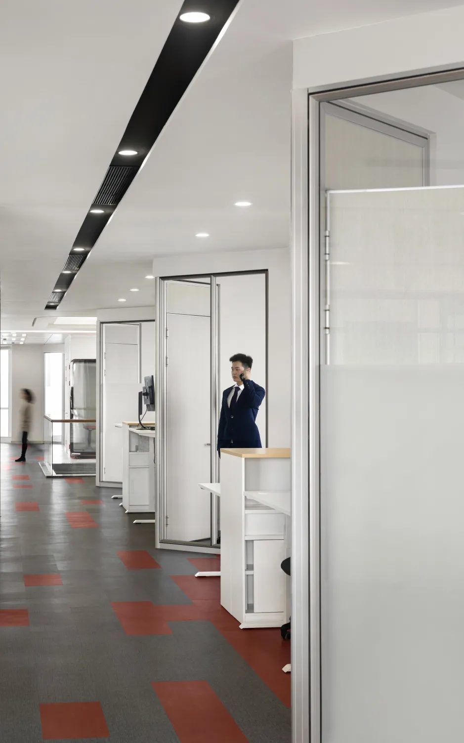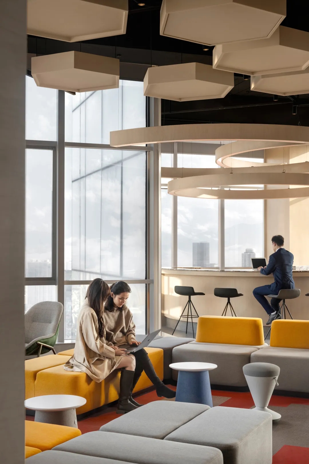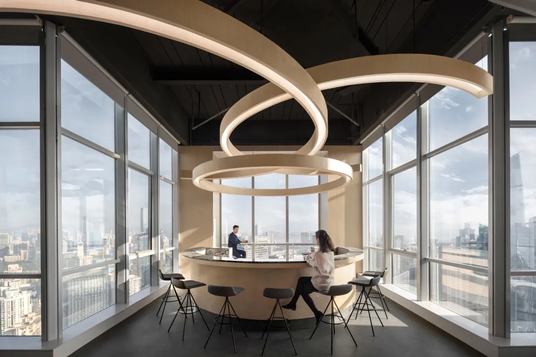 简洁利落的黑色钢板则带给人冷静的现实感,形成包容而实在的交互空间。冰点蓝、稳重黑、轻奢白为主、思想灰为辅的色系,加之地毯、软装的营造,烘托出似有云层、有河流的丰富自然空间.....