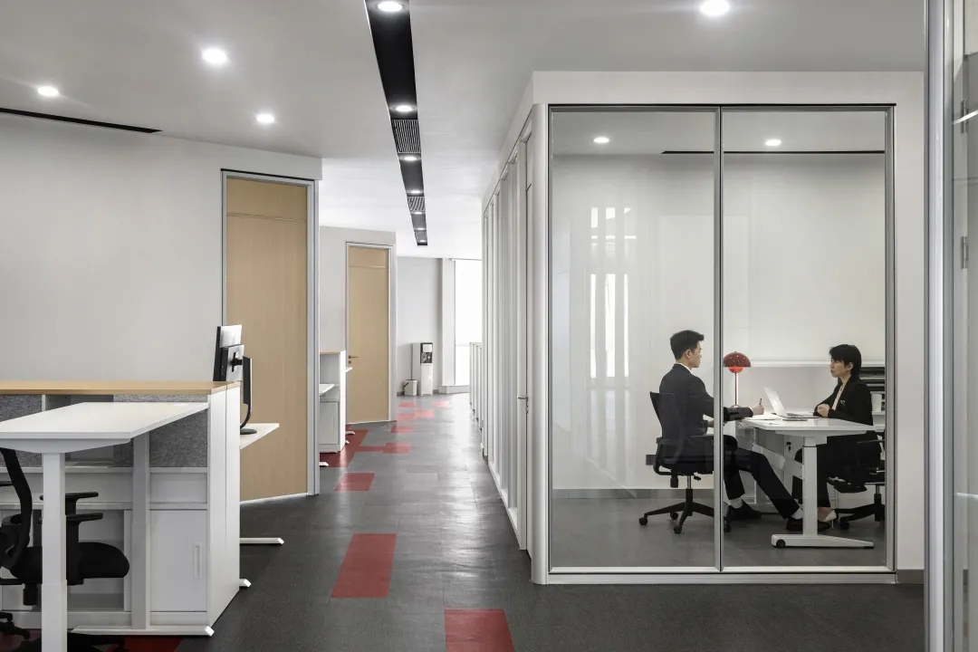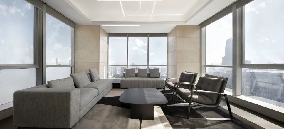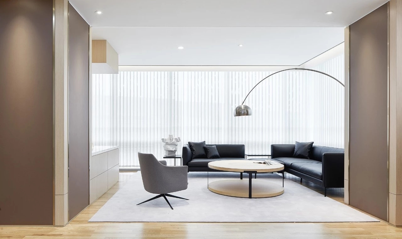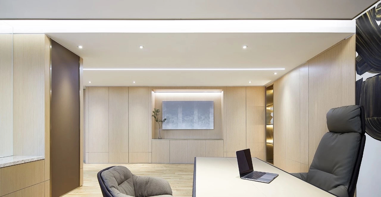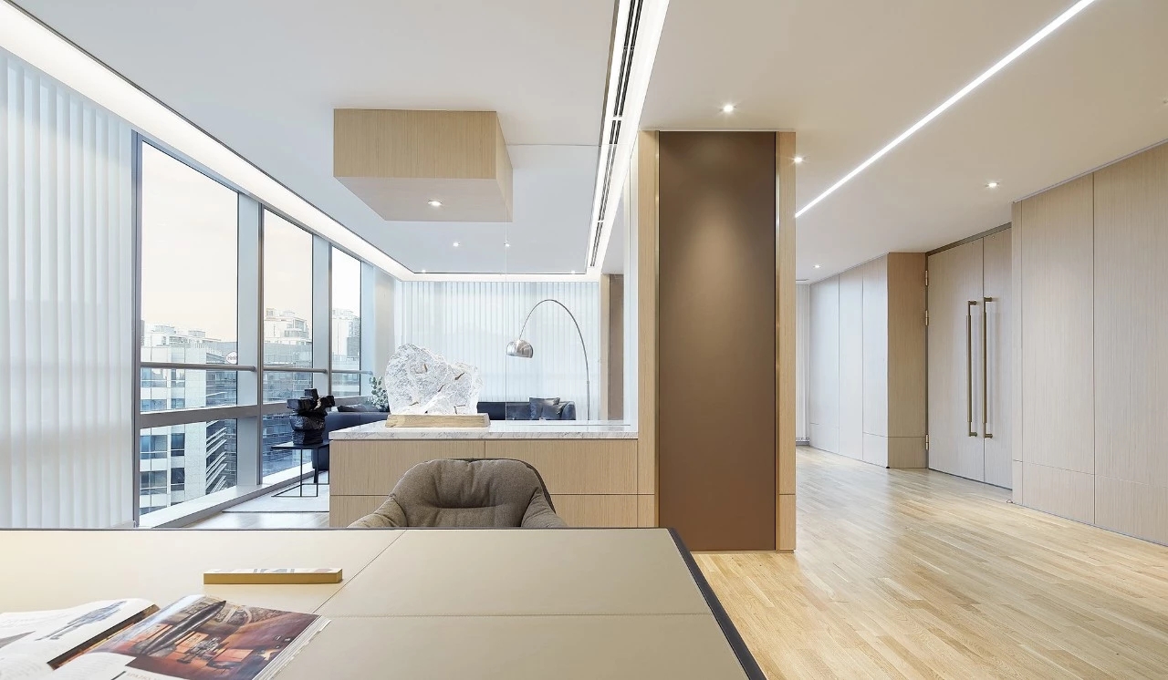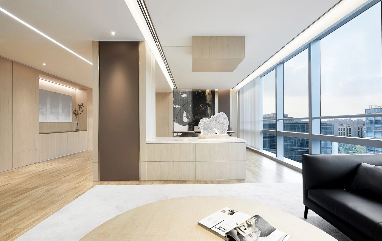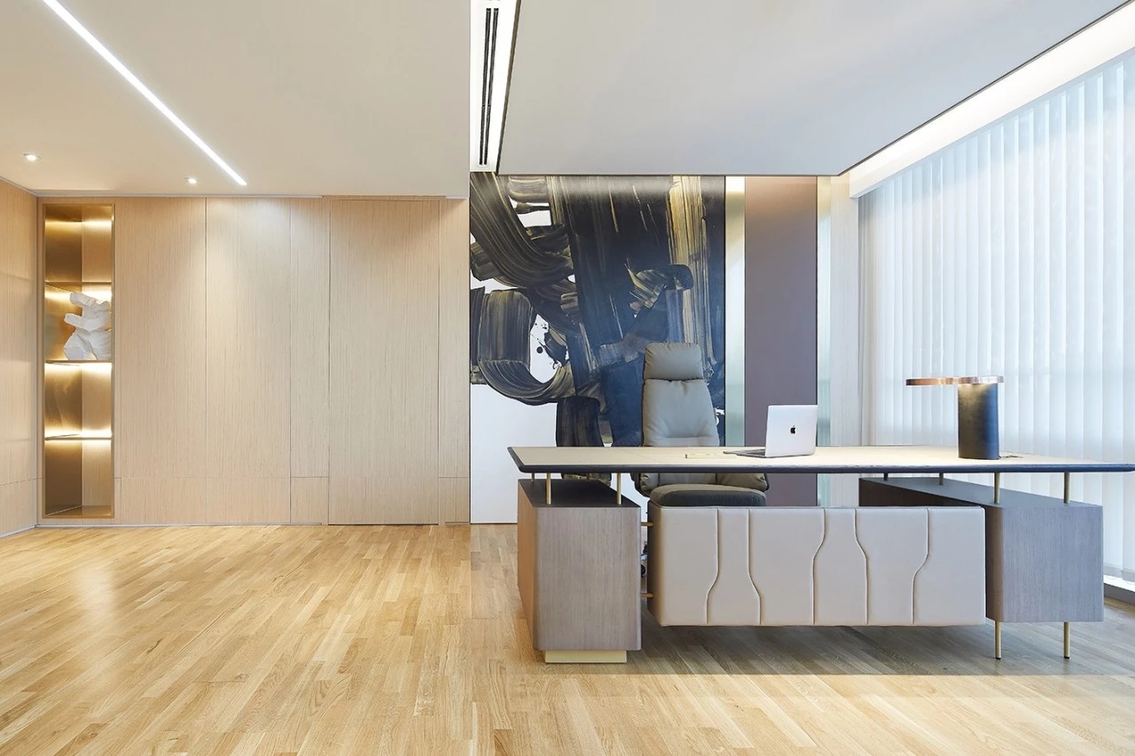 年迈的副董事长坐享的办公空间,更彰显沉稳气质。空间以木皮、皮革、金属的拼接组合构建出深浅有度、层次分明的感官体验。艺术品的置入,渲染出空间的份量感之余,构成视线的引导和虚化的空间分割节点。此起彼伏的空间节奏,构成一幅精致耐看的平面,适宜使用者长时间逗留。