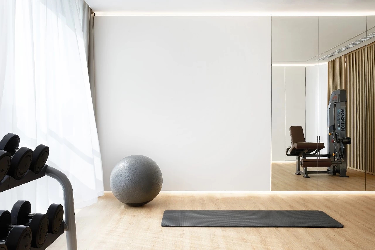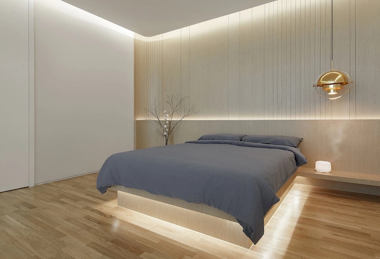 透过落地玻璃窗,将云卷云舒尽收室内,黑白灰色调加上大面积的自然木纹奠定经典干净的调性。简洁的颜色总是给人无尽的想象力,适度的放空思维有利于身心的调理;钴蓝色亚克力装饰柜与光影结合,使休闲空间轻盈通透。