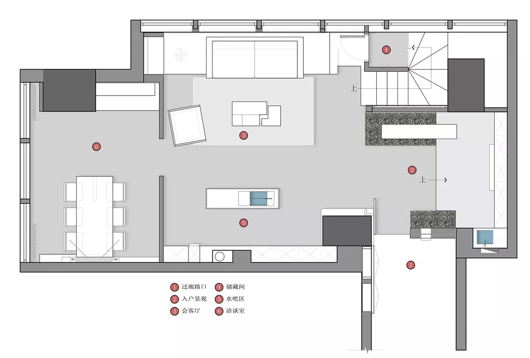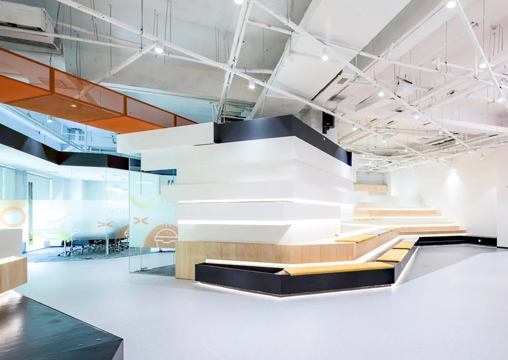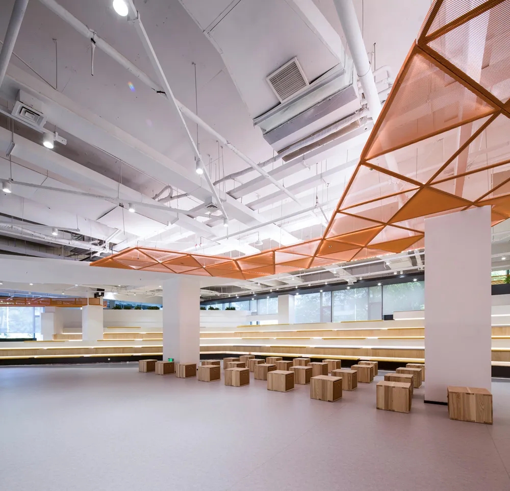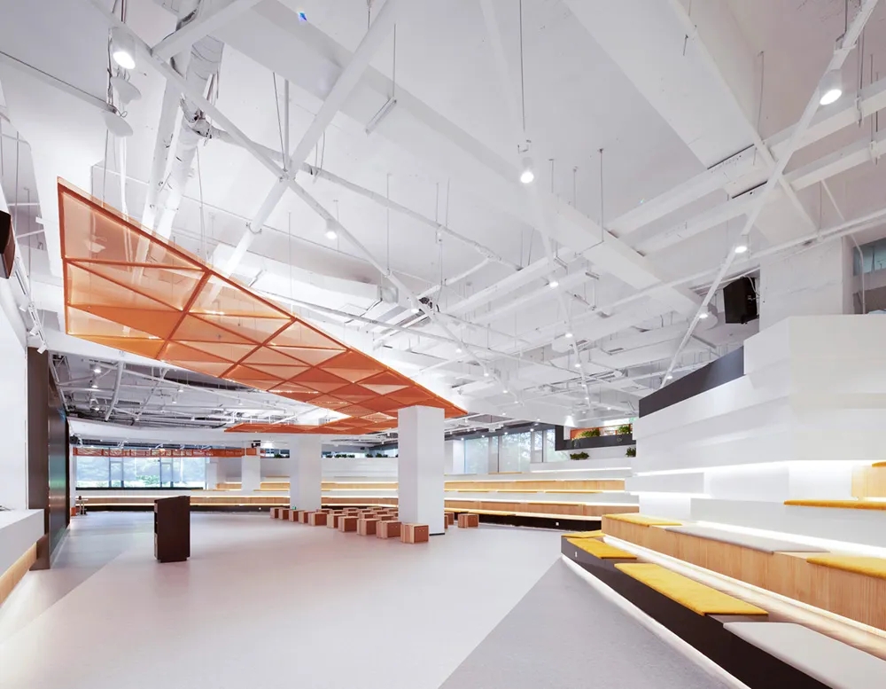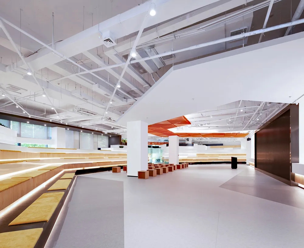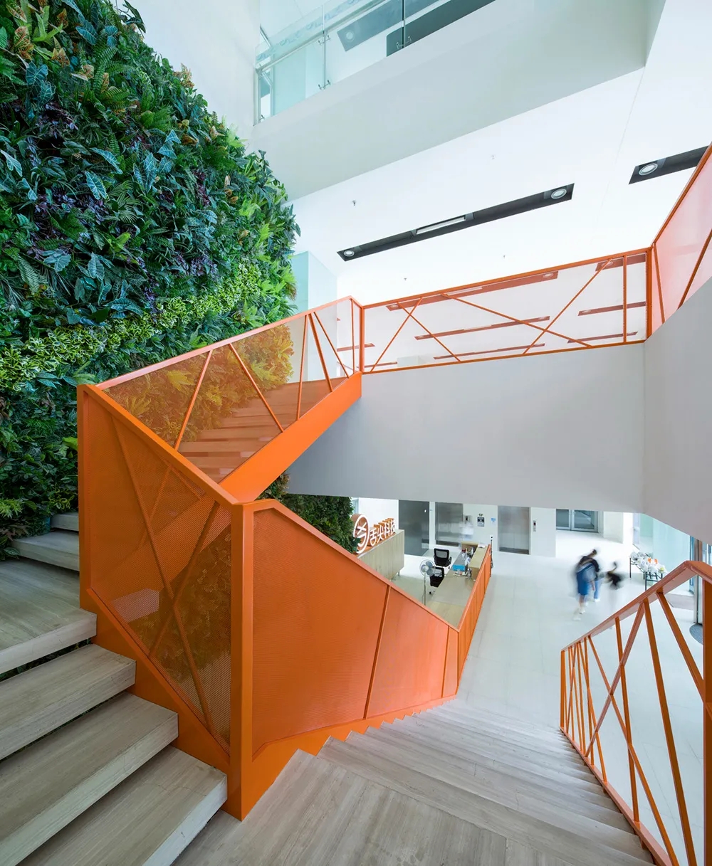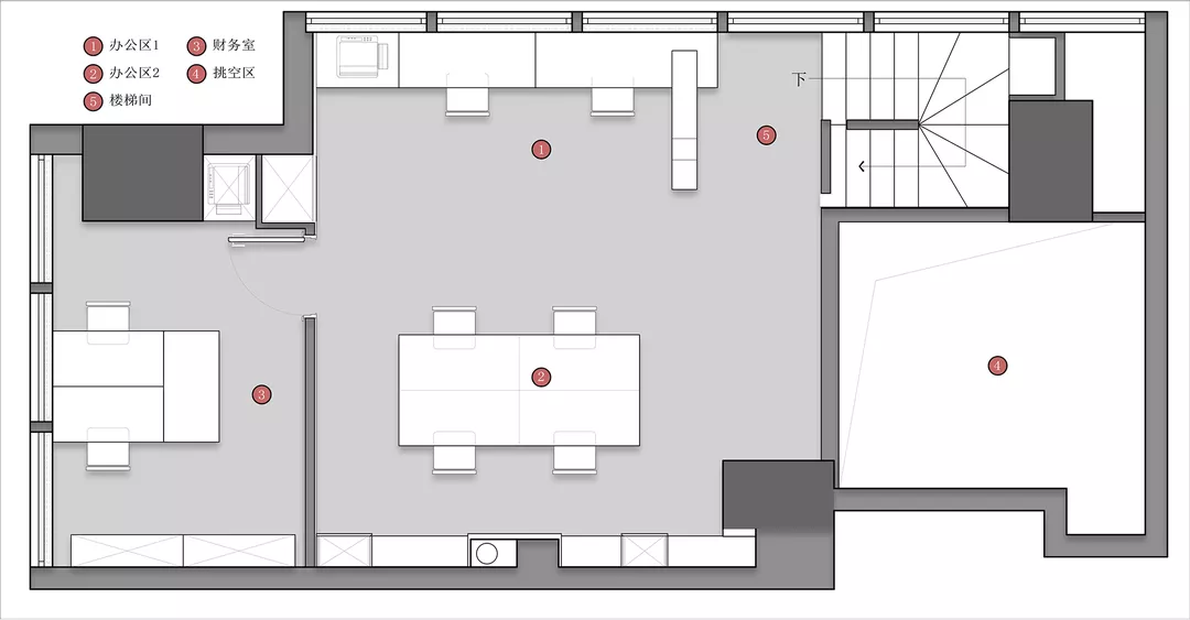以自然之形,在一层与二层之间的连接点,在楼梯台阶的设计上,注重于空间秩序的再造与重塑以体块、直线、纹理三者相互依存作为表现形式,刚中带柔,简洁而利落,灰色色调与即将到来的二层办公区的现代工业风格恰到好处的适合,这更像是踏进第二境界的交界处。