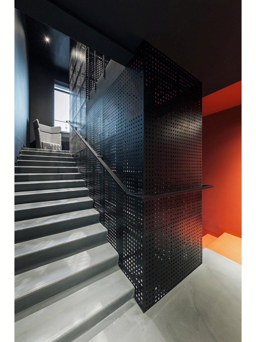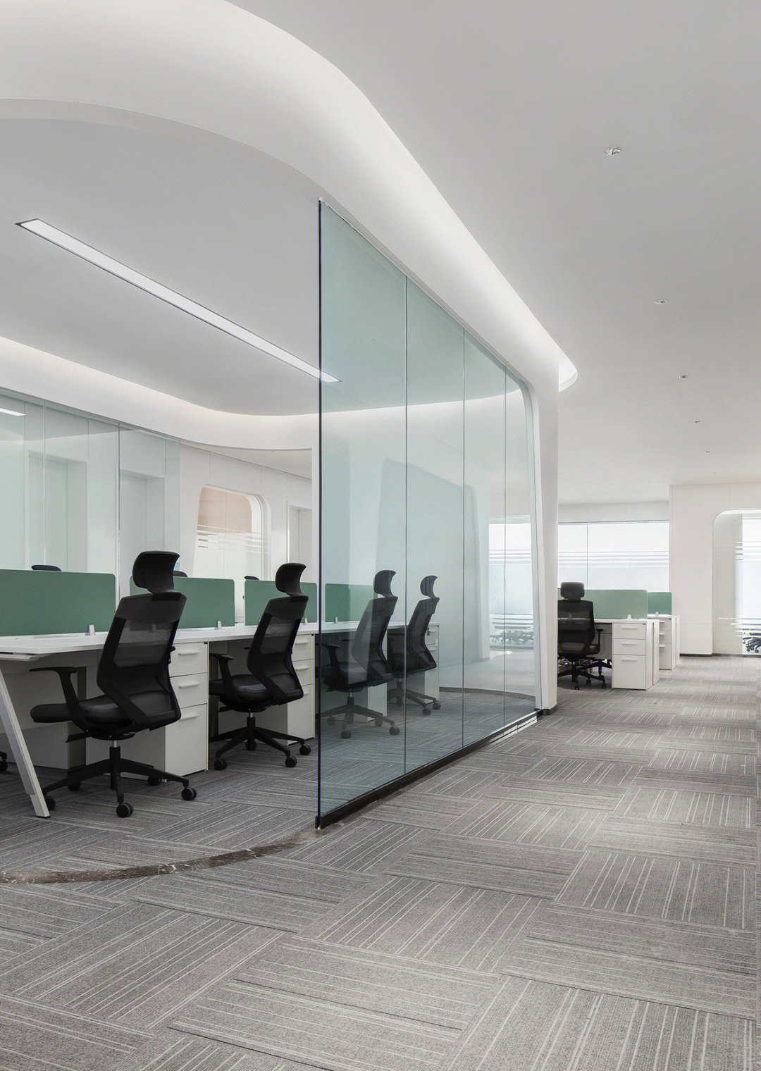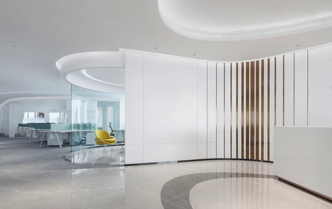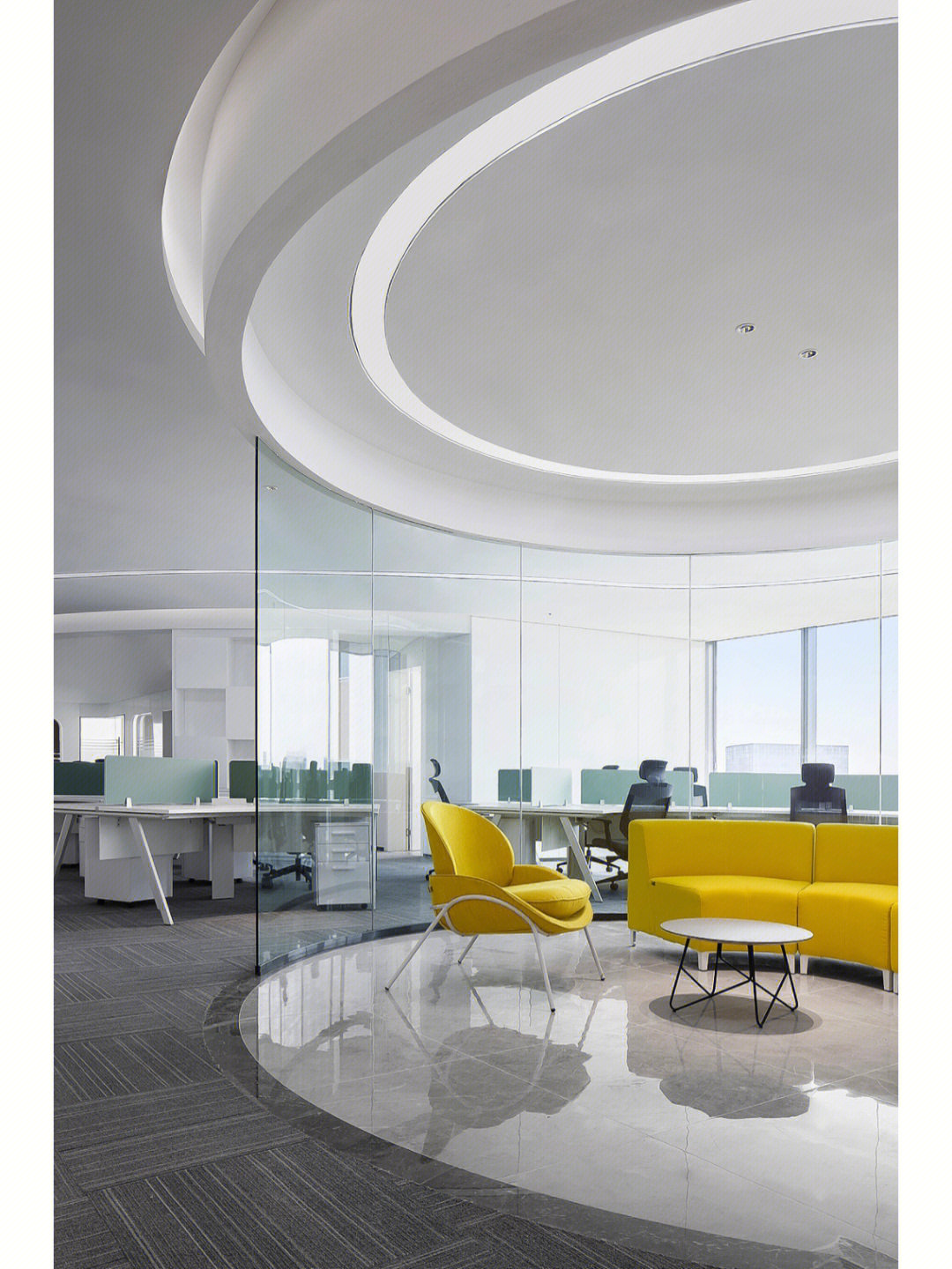 弧形房间边缘增加了公共空间的柔和度和趣味性,而黄色线条和LED灯条的嵌入为整个空间增添了动态和现代感。暗藏式的洗墙照明系统、装饰性景观元素和设计得像高尔夫球上的超大圆点的纹理天花板,强烈地刻画了两个休闲社交区域的舒适氛围。大理石材质的运用,提升了俱乐部的质感,并用于标记一些非常特殊的区域,如悬浮的接待台。长虹玻璃和透明玻璃的交错使用,增强了公共与私密空间的对话,创造了一个有趣的视角。