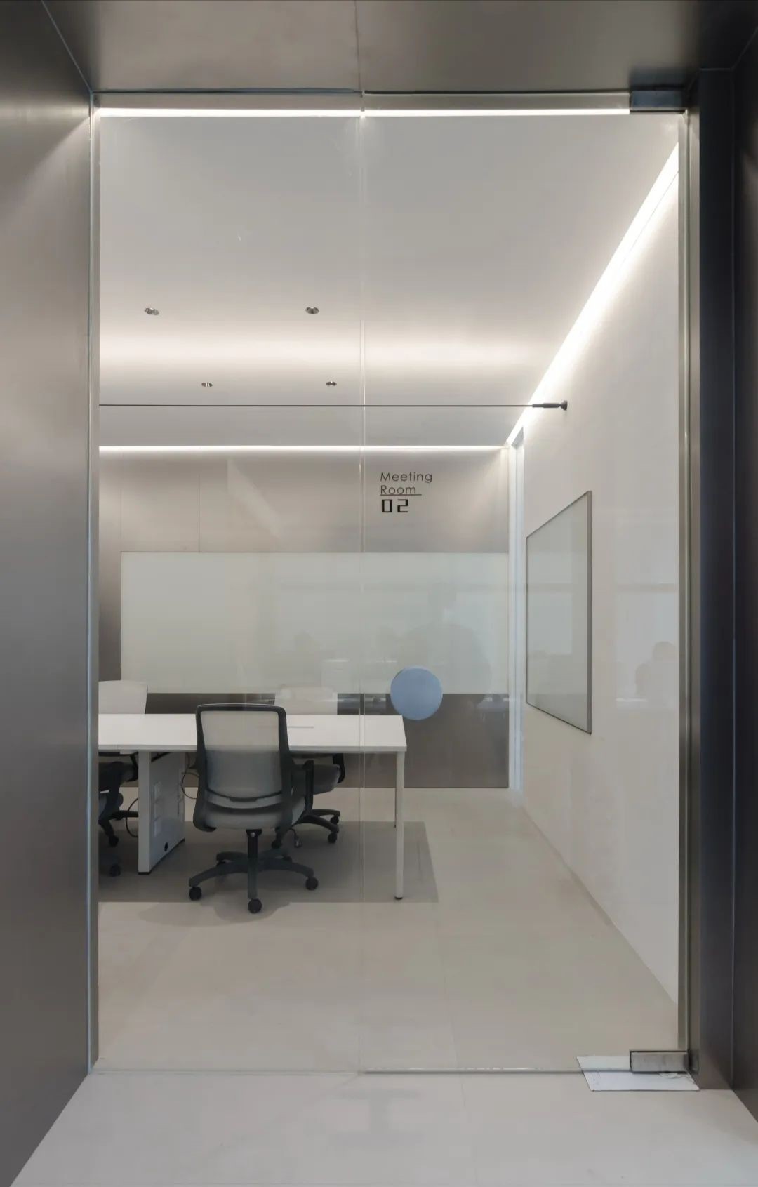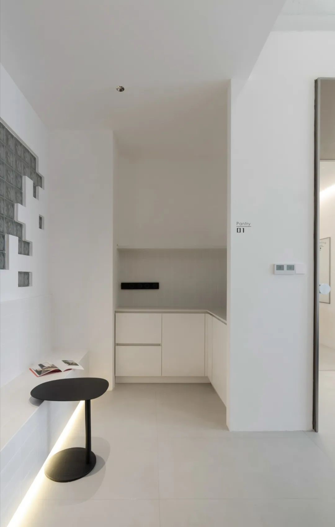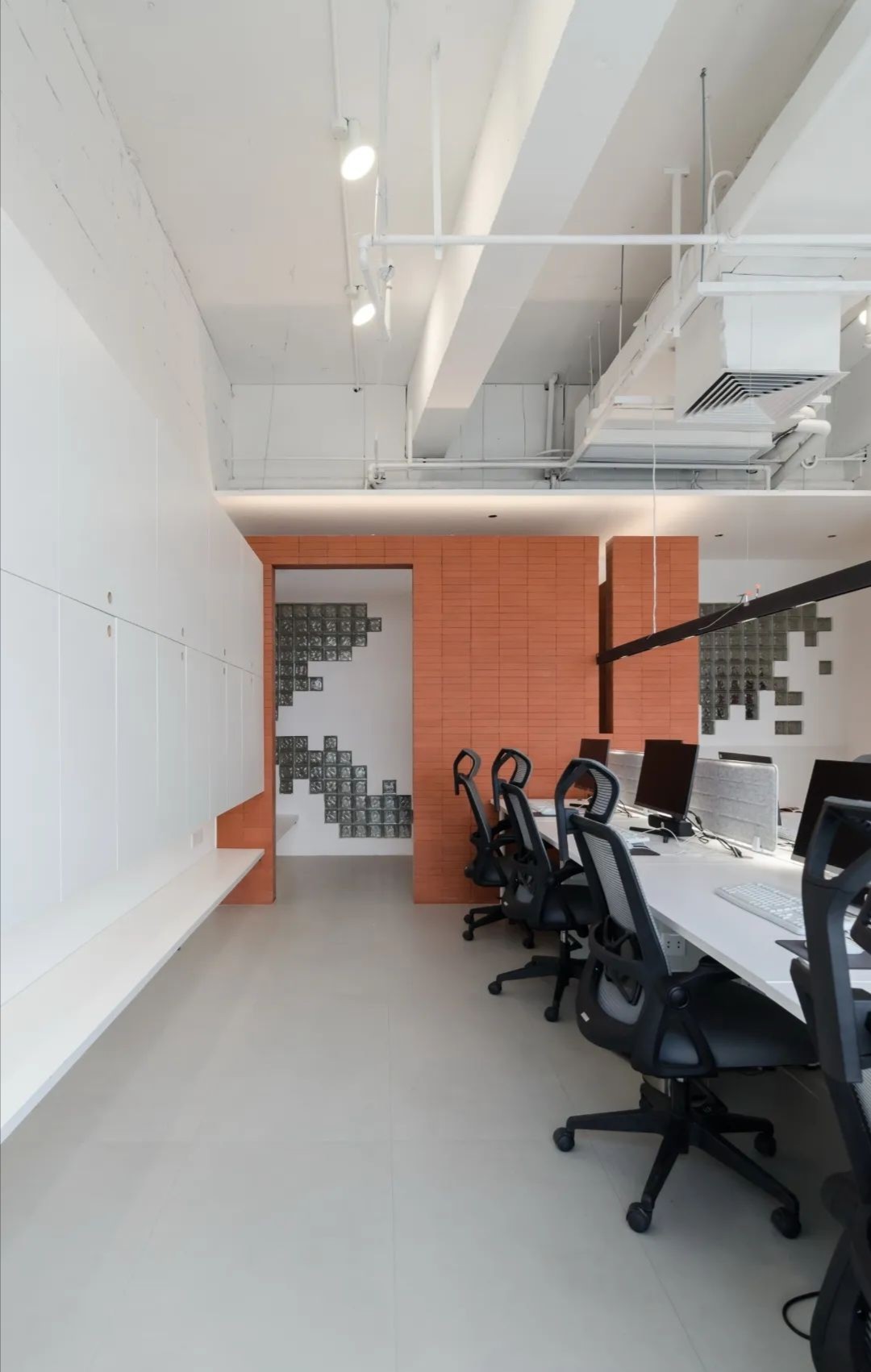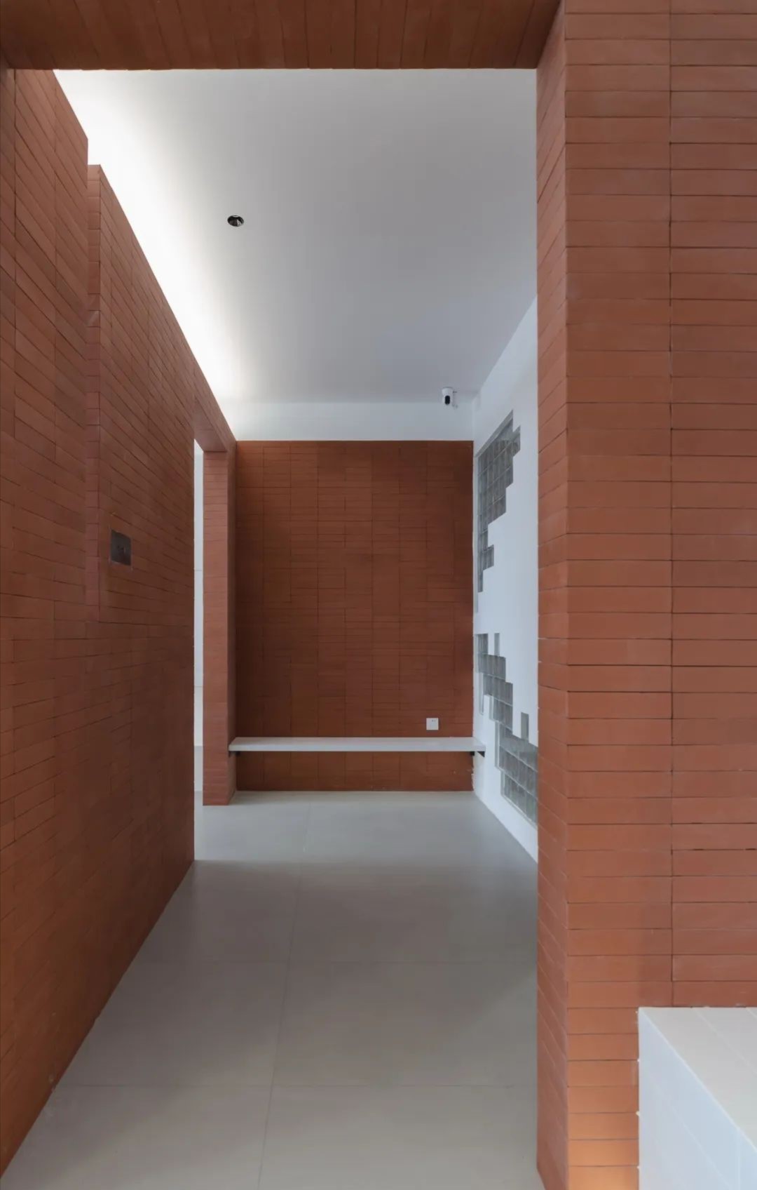 不规则的若干组150mm规格的玻璃砖形成的聚集群落分布于10米长的立面上,在墙面上呈现出一种规则中的无序感,以此丰富立面肌理,同时为狭窄沉闷的走廊区域引入光线。