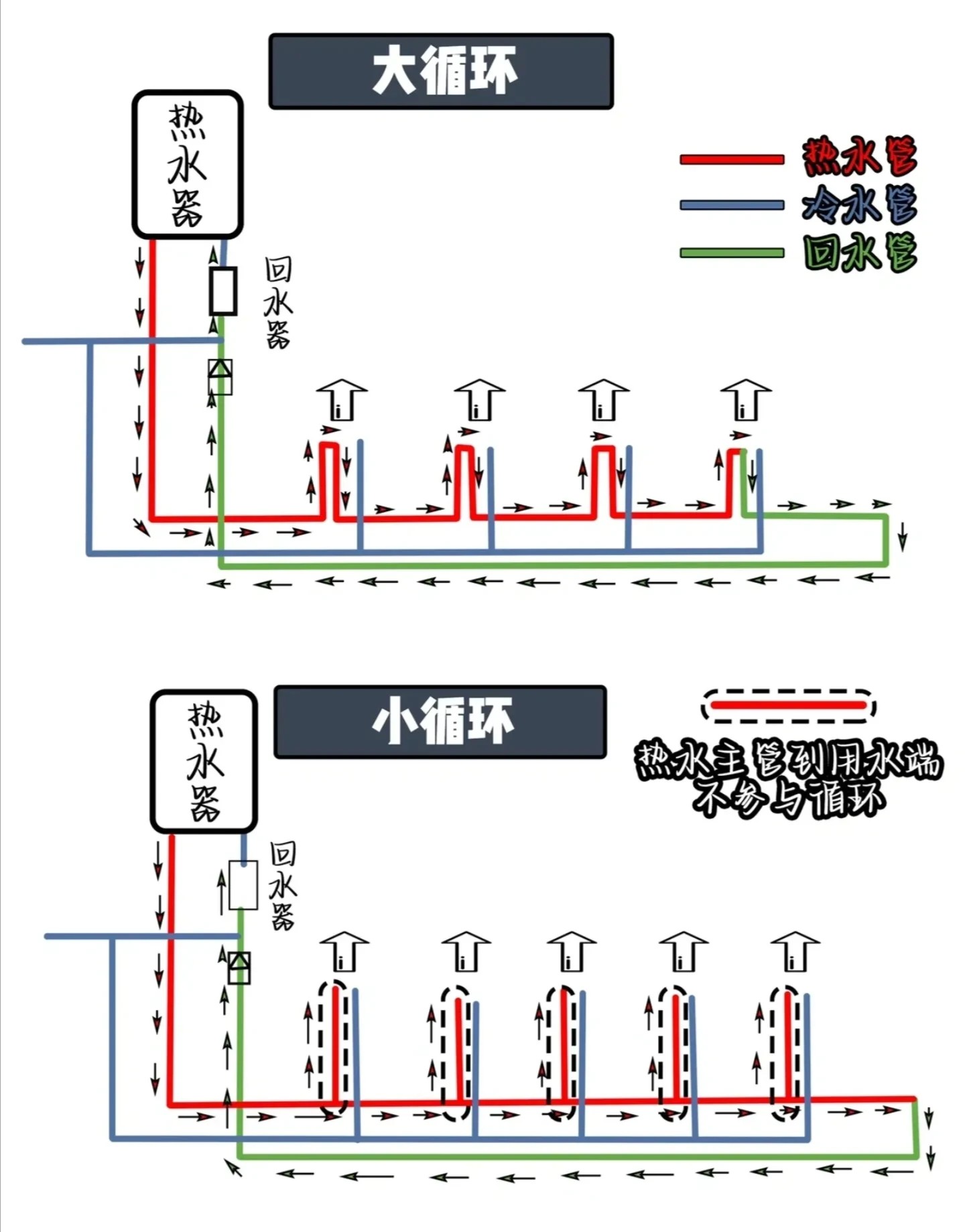 小循环:是热水管只在主路径上做循环,而通往各个取水点支路的热水管不做热循环,