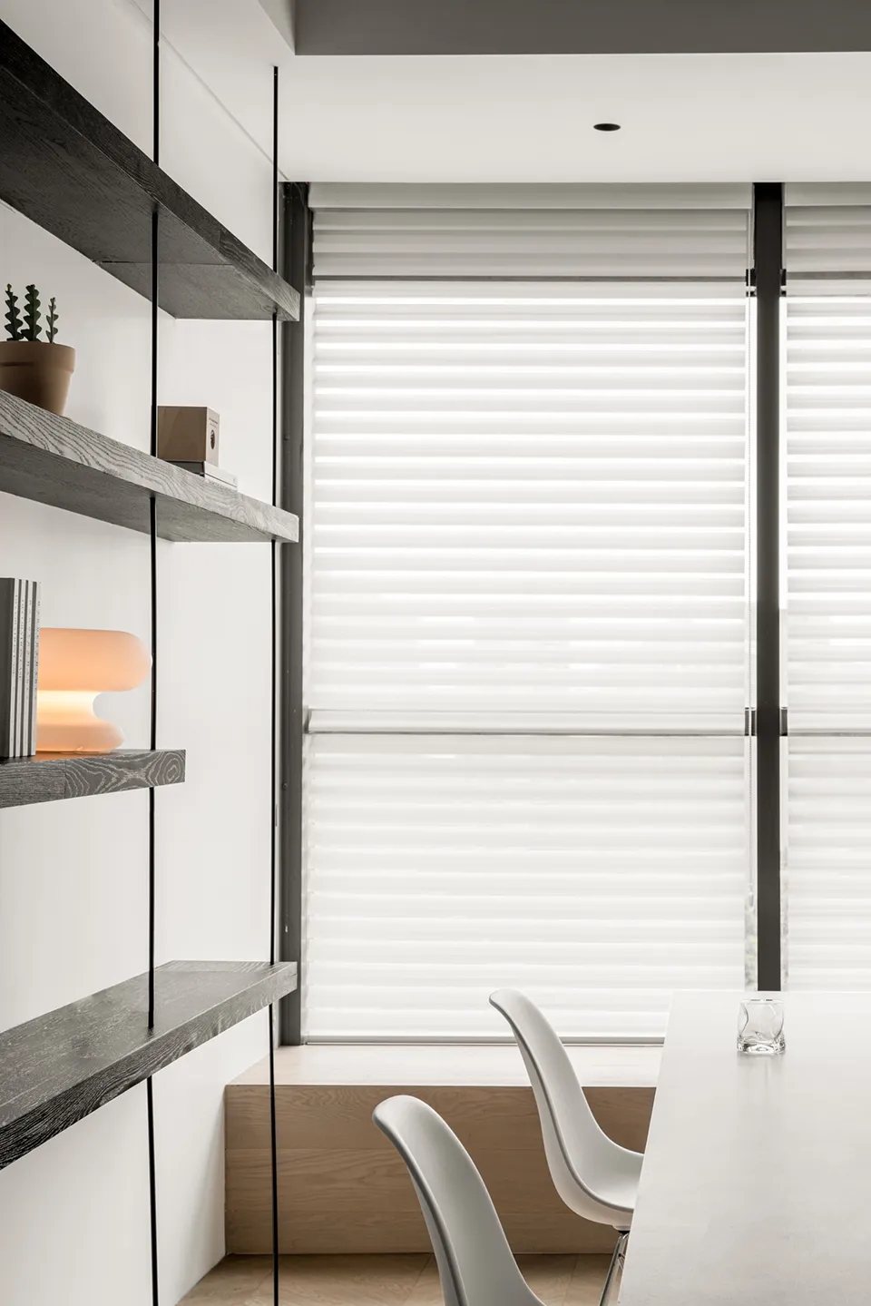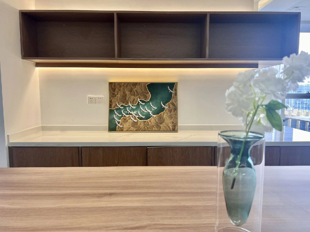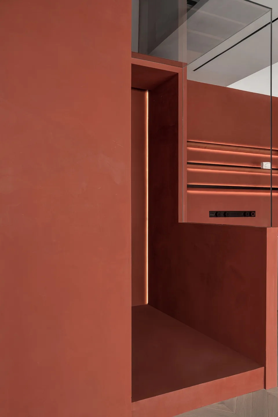 门口将地面抬高15cm做成一个盒子的形状,玻璃的结合自然形成一个小小天窗。类似夯土色泽的艺术涂料是最后反复挑选定稿的颜色,在具体有视觉冲击力的同时意外的也让人感受到平静。