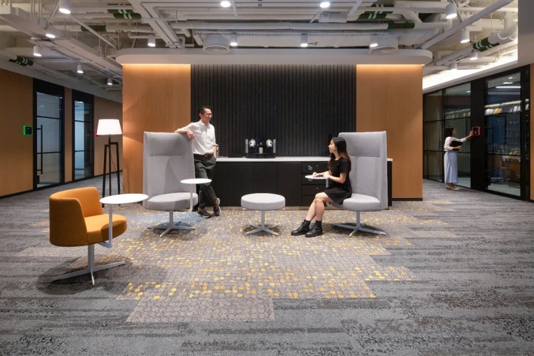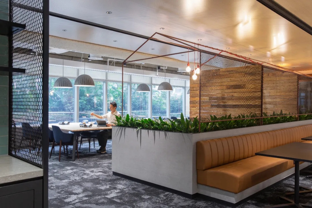 工业风玻璃框架、木炭色的隔音板和具有金属光泽的窗帘,加之以暖色系木材装饰,使正式的会议和商务休息室空间变得柔和,在满足年轻人群需求的同时,自然而然地提振精神。