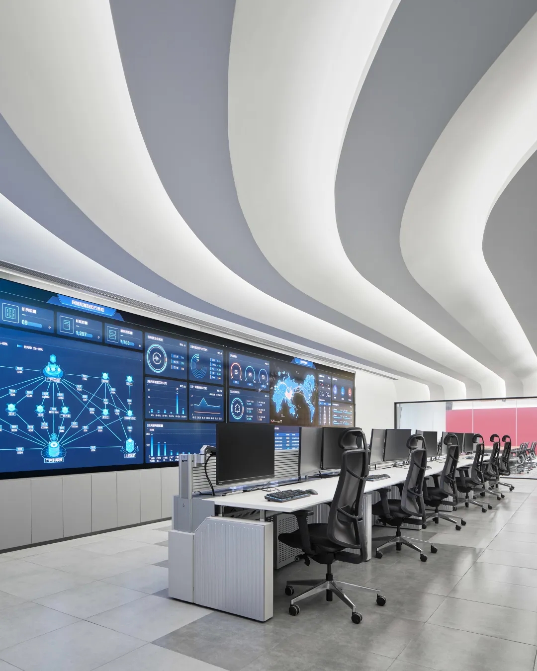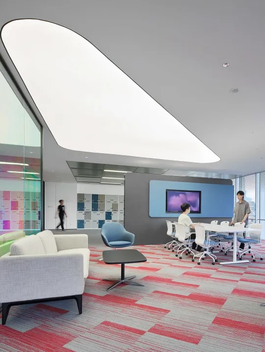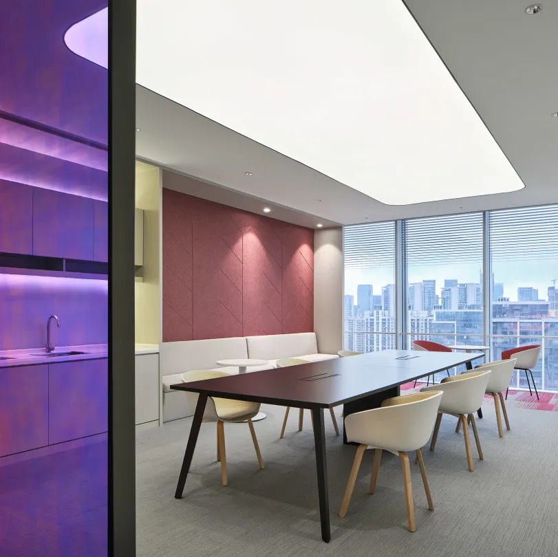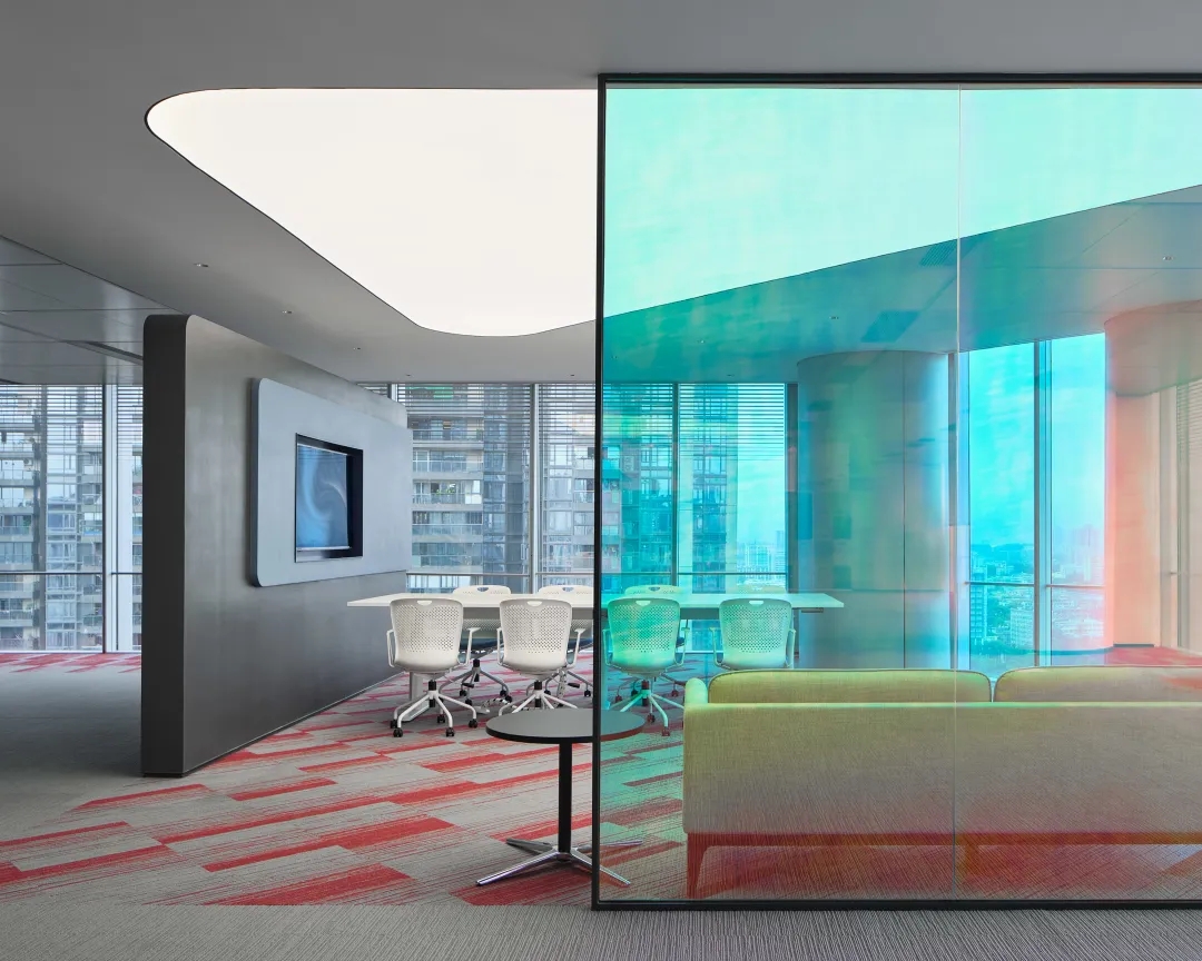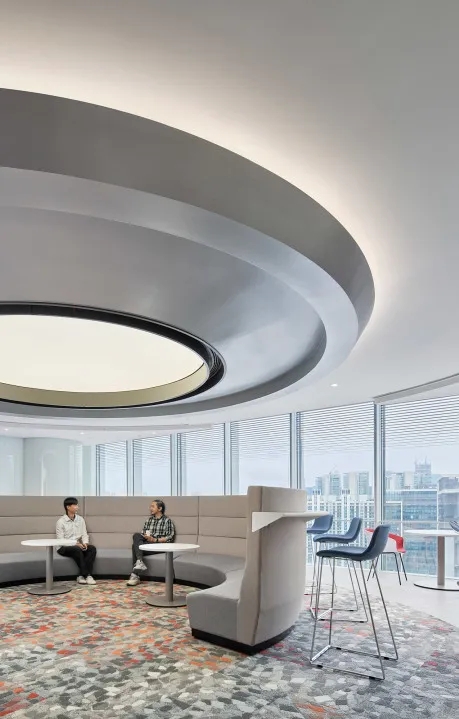 全新的客户室(Client Suite)从观塘工业区独特历史和盐场中获得了灵感。为了展现这一独特的文化和历史,设计师从大量的几何图案、纹理和盐晶体材料中汲取灵感,并用这一主题诠释整个空间,包括在整个空间内采用晶体结构和呈现棱镜光效果。