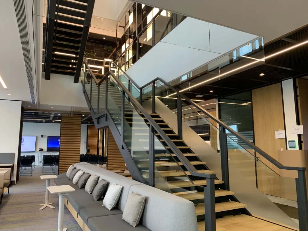 把社区中心、多功能区域和会议空间安排在楼梯周围。这样做可以促进交谈,因为当人们抵达楼层伊始,便能开始工作会谈,同时这也能鼓励三个楼层之间的人员流通并进行交流。通过打造垂直连接的办公空间,来促进沟通与协作。