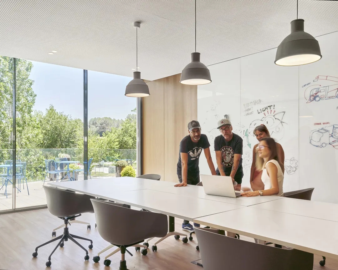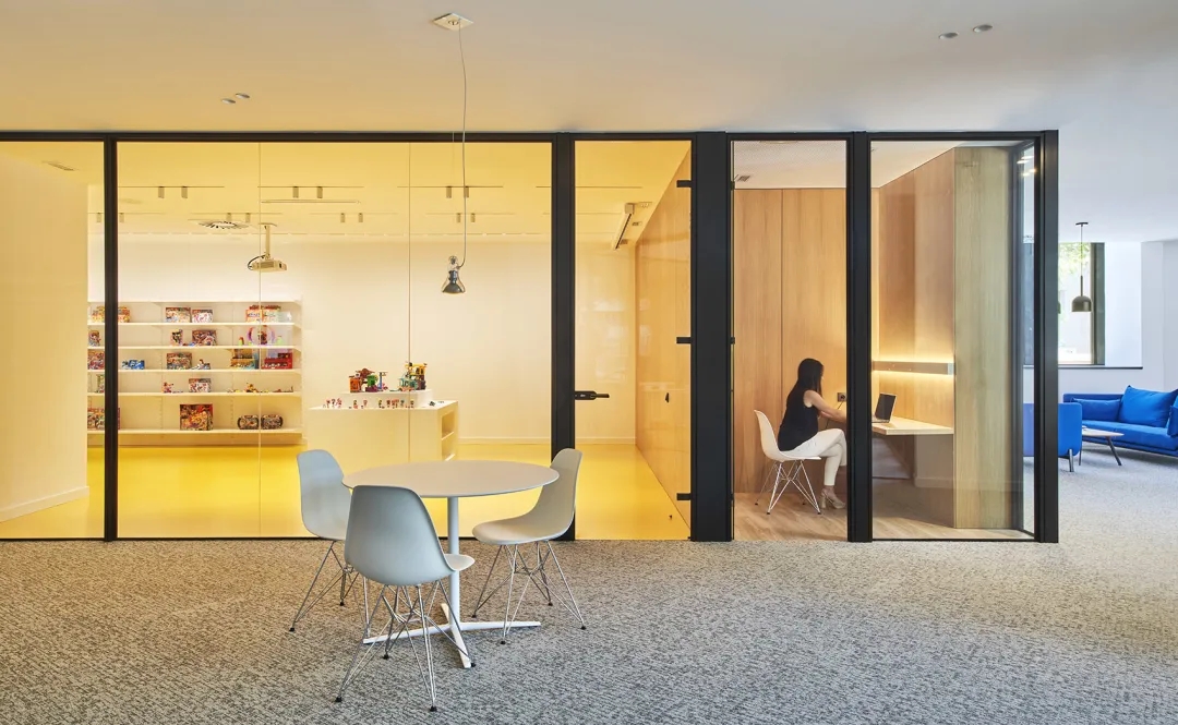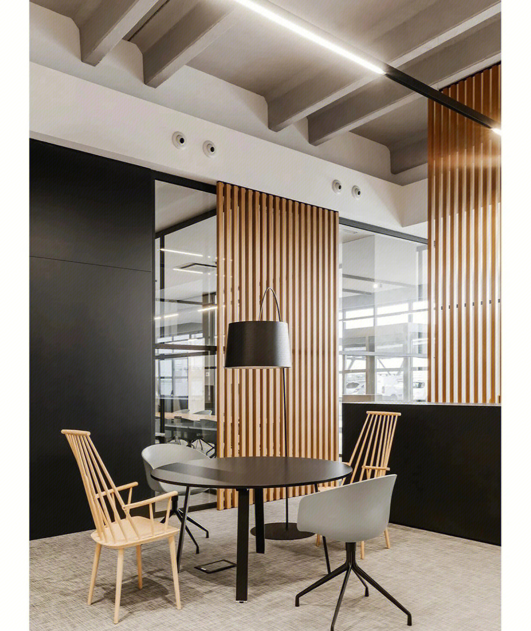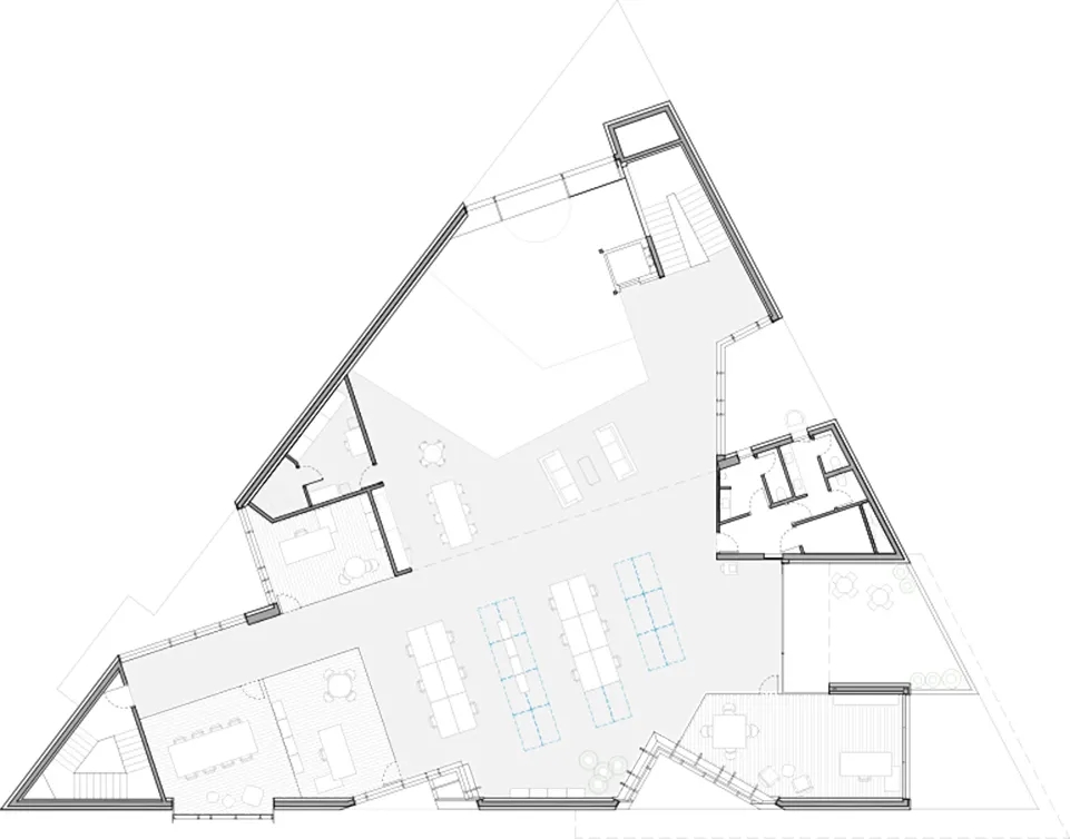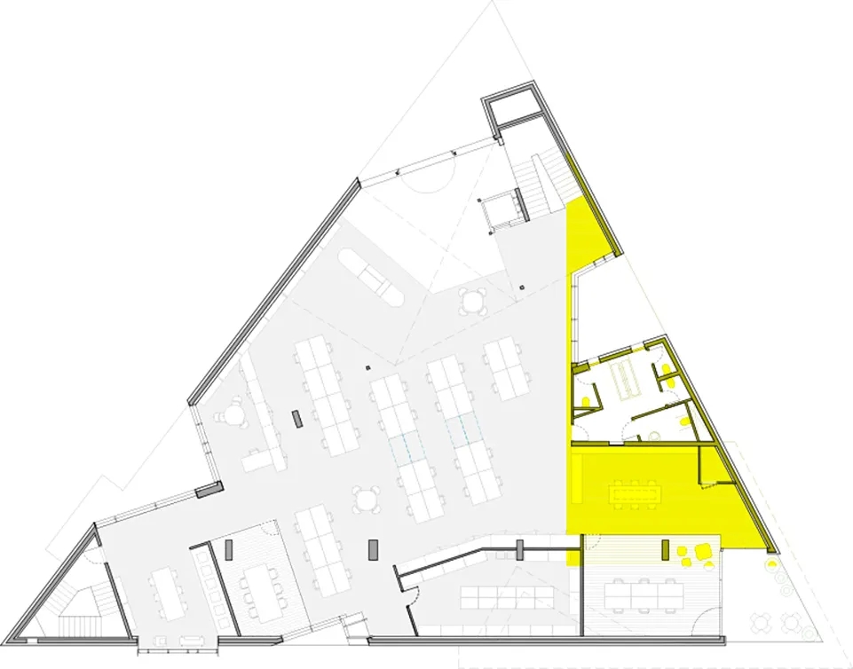 建筑的第三层专门服务于公司的创意团队,不同类型的会议室以及带有3D打印空间的工作室都是遵照相同的逻辑来设计。该楼层同时还包含管理层办公室、一个开放办公区和主会议室,其中主会议室采用了落地式玻璃墙,以张扬的姿态回应了该楼层5米的净空高度。