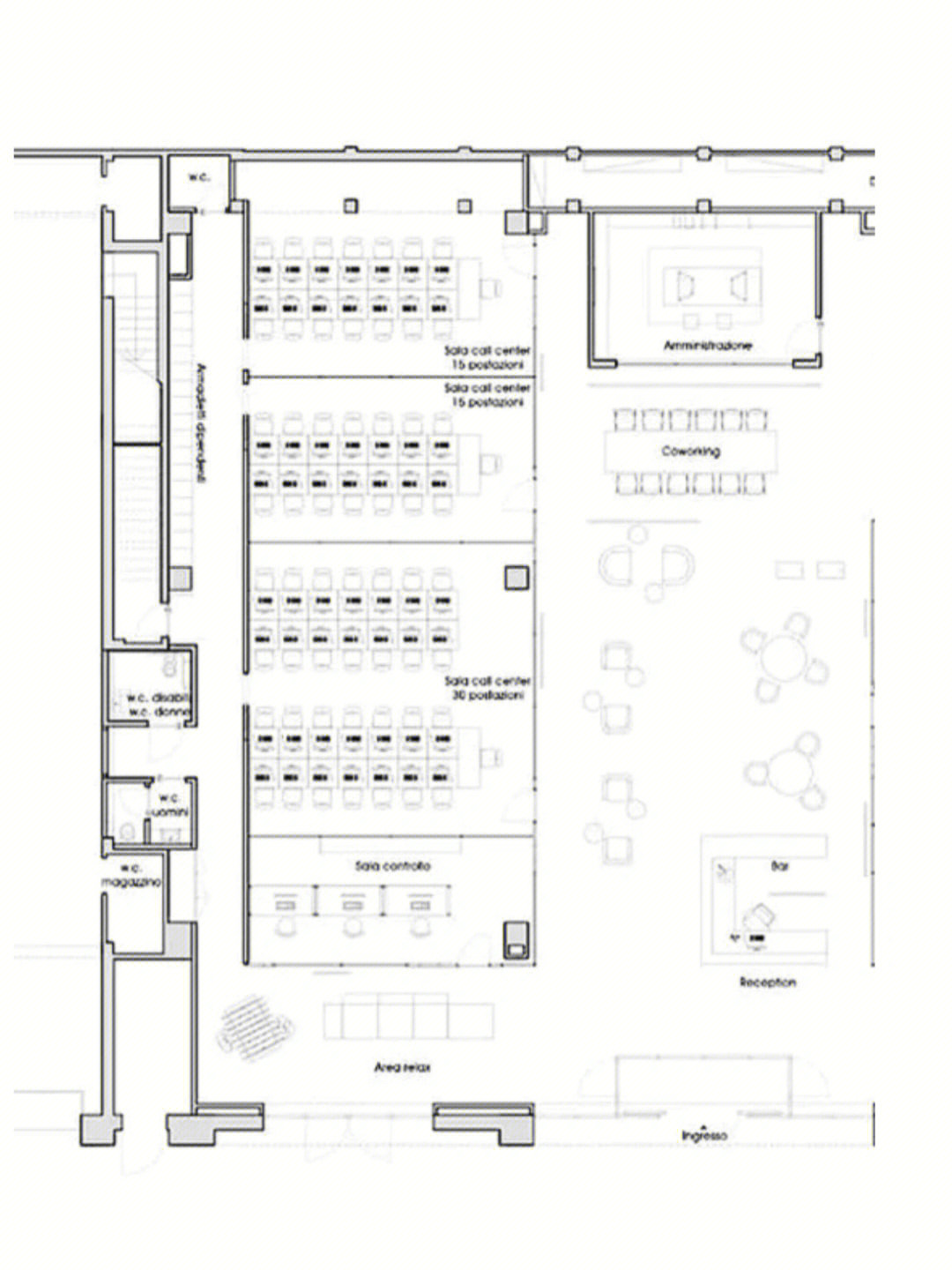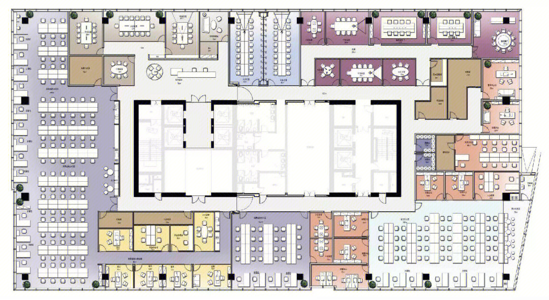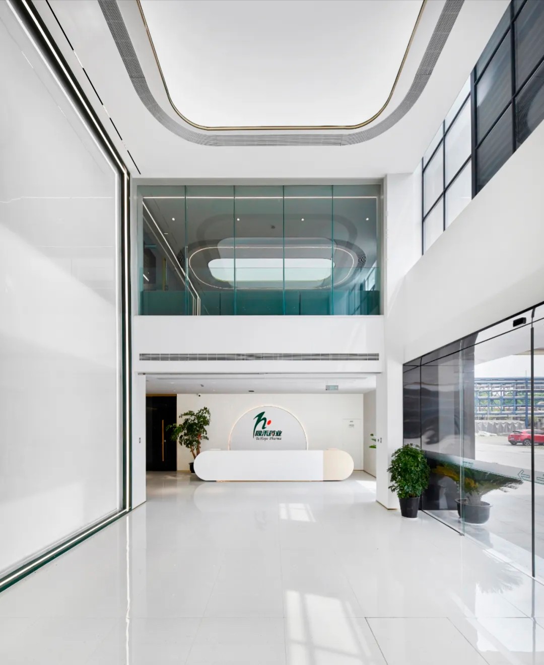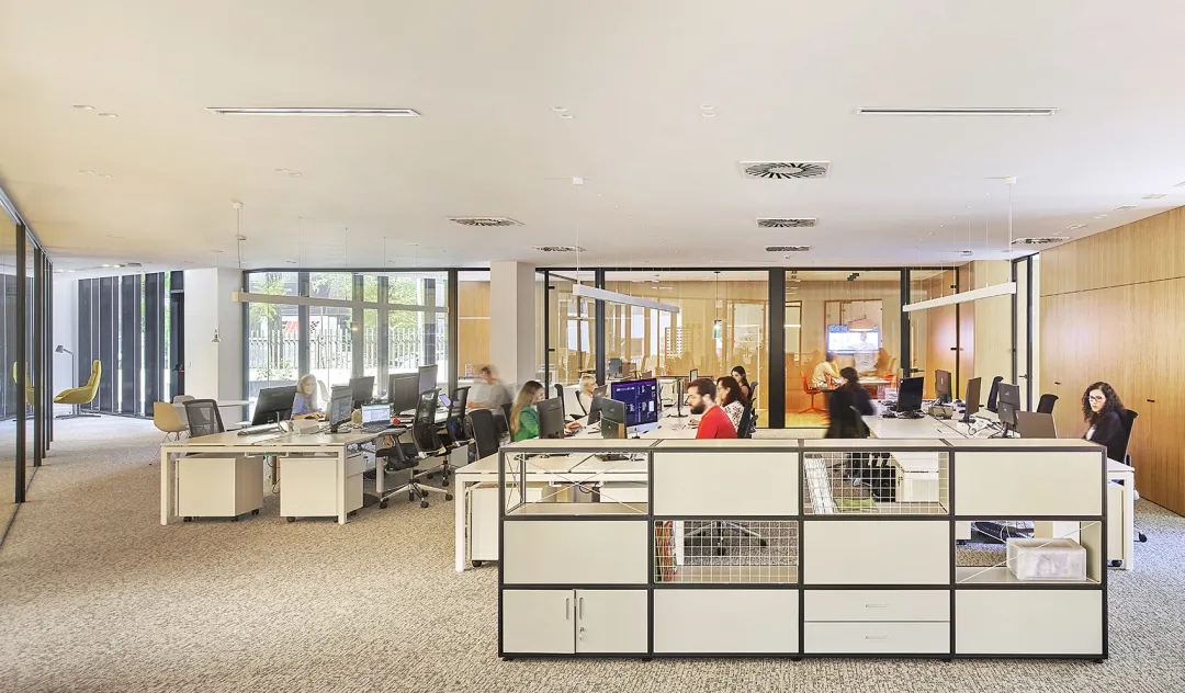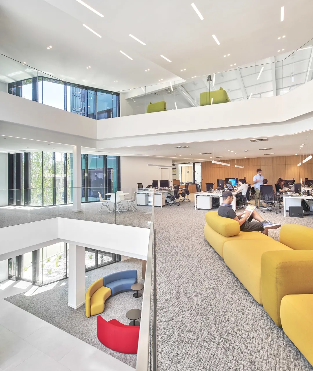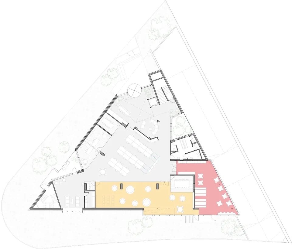 入口大厅连接至首层办公空间,这也是公共性最强的一个楼层,除了开放的办公区域之外,还设有展厅和与花园相连的自助餐厅。在餐厅和展厅,塑料纹理的地板与红色及芥末黄色的室内元素相搭配,能够帮助来访者识别空间的不同功能,同时也起到加强公司创意形象的作用。二层空间整体拥有较大的透明度,以开放的姿态吸引着人们走进内部。