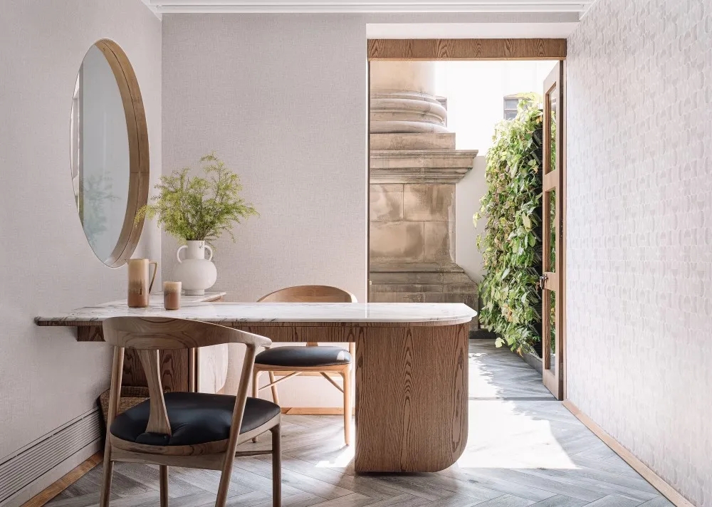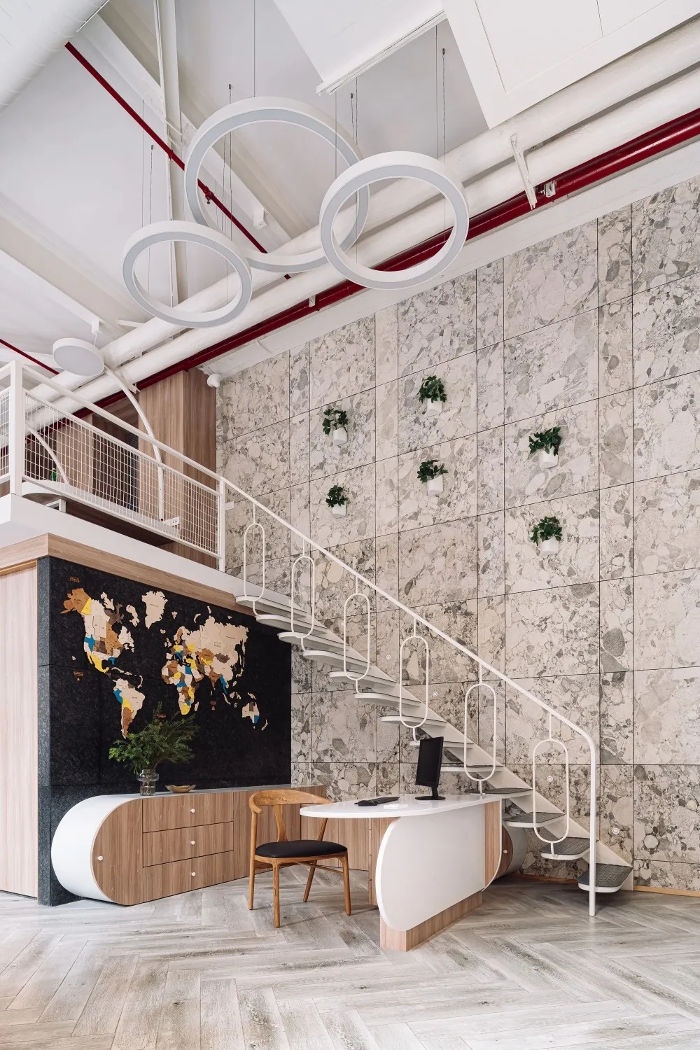 该项目位于加尔各答著名的主干道斯特兰德路的优点是可以俯瞰胡格利河和豪拉桥,享有周围景观的全景。两条截然不同的半弧线在通道与主接待区交汇处的入口处相交,提供了双层高空间的迷人景色。接待处和等候区以世界地图装置为背景,与北欧斯堪的纳维亚的空间外观相得益彰并保持空间的历史特征。