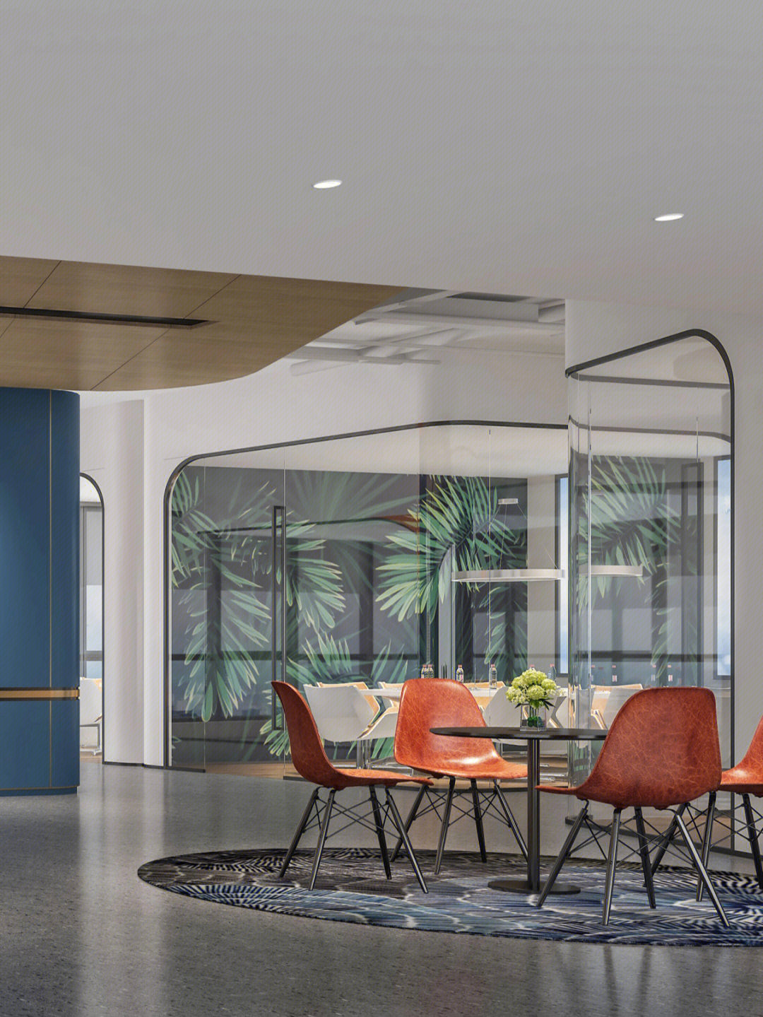 所有工作站都集成了半弧灯,增加了空间的特色主题和美观,并提供光线充足的工作站。办公室包括一个较低的楼层和夹层楼以及一个大露台。通过一个接待和等候区通向中央空间的工作站和经理隔间。所有工作站均俯瞰露台,享有胡格利河的广阔景致。在左边,夹层下,有助理的房间,还有一个储藏室和厕所。导演室位于远端,可通往露台。露台享有如画的风景和巨大的高度成为办公室的亮点,为举行非正式会议和在漫长的一天工作后放松身心提供了空间。