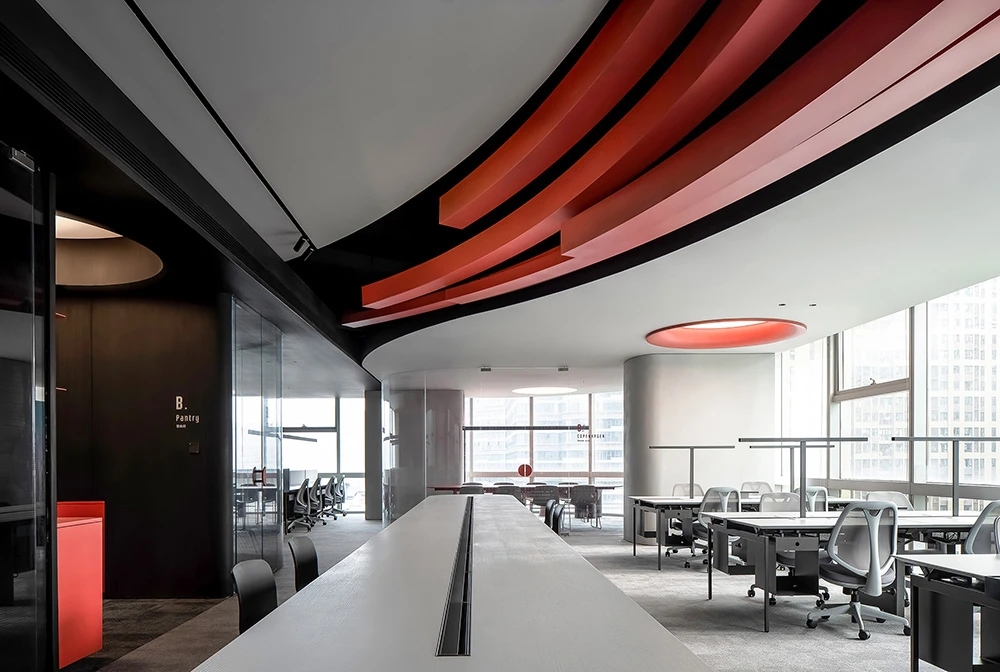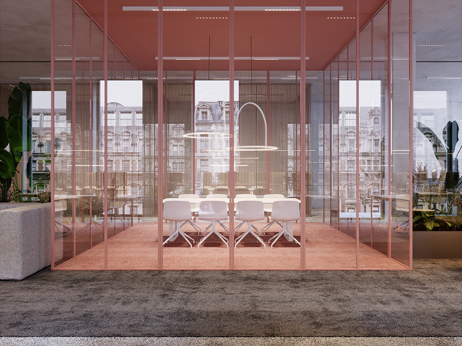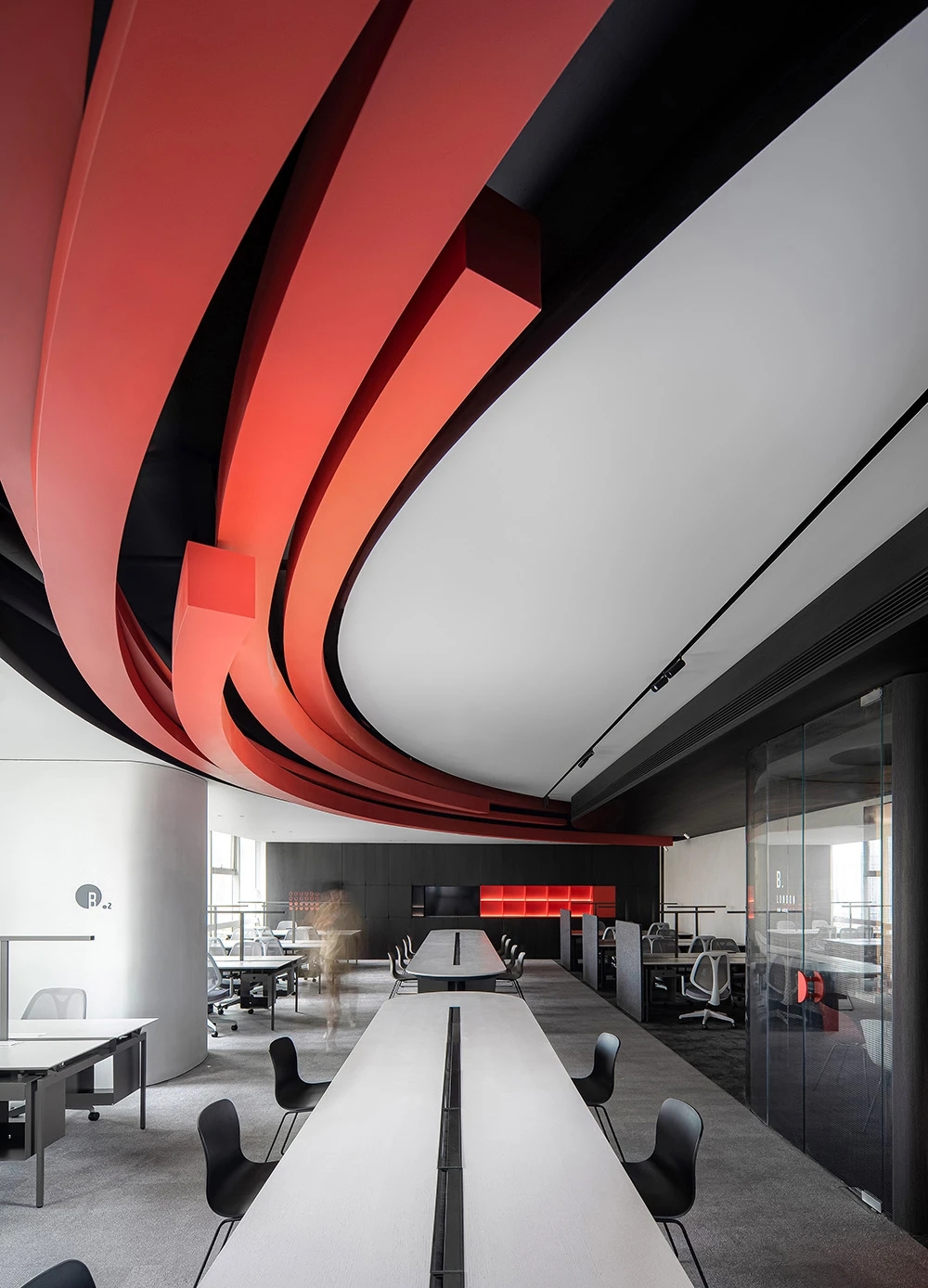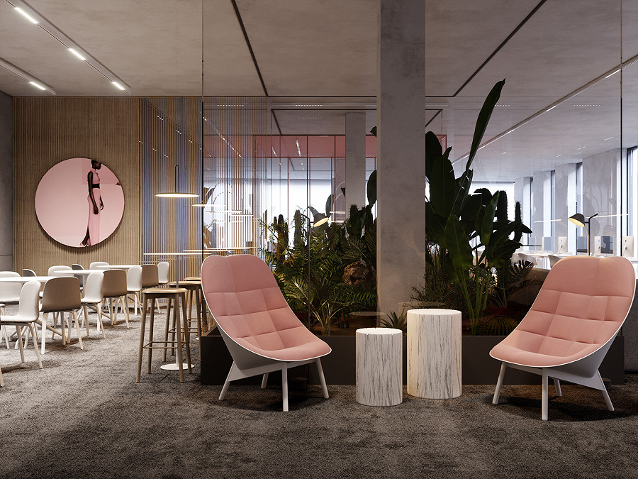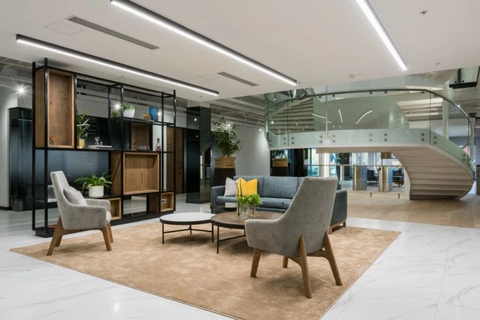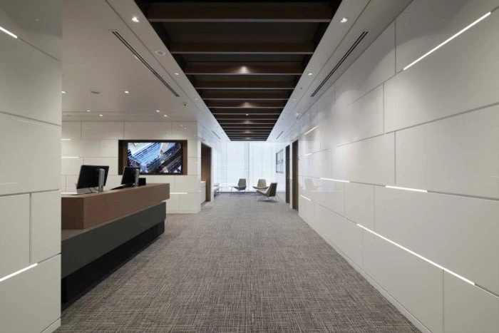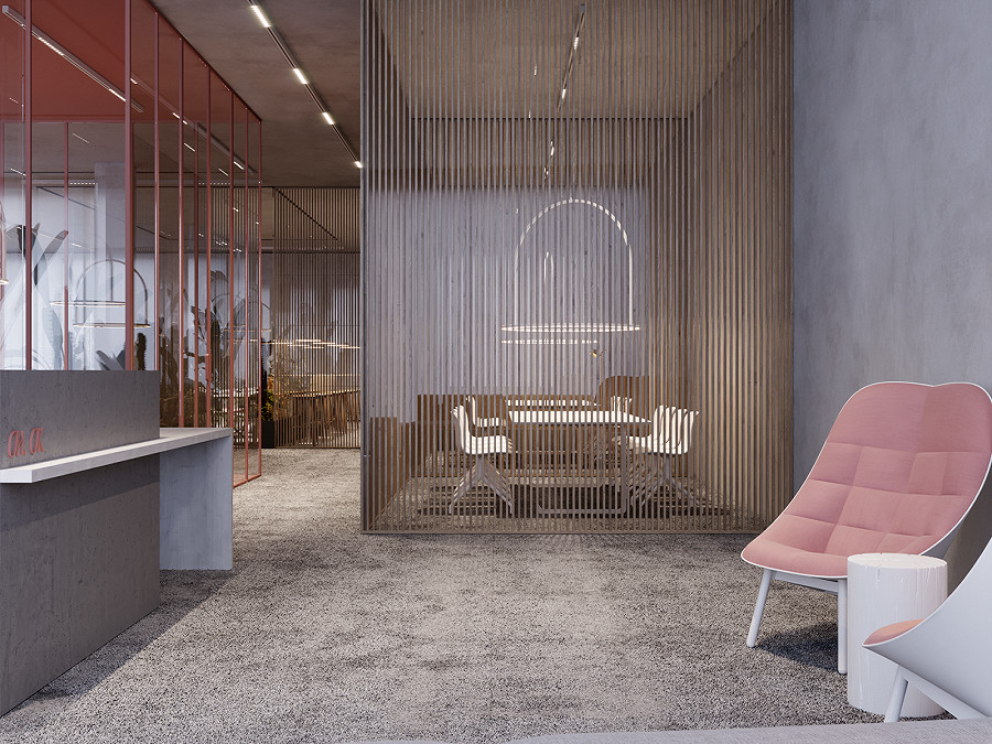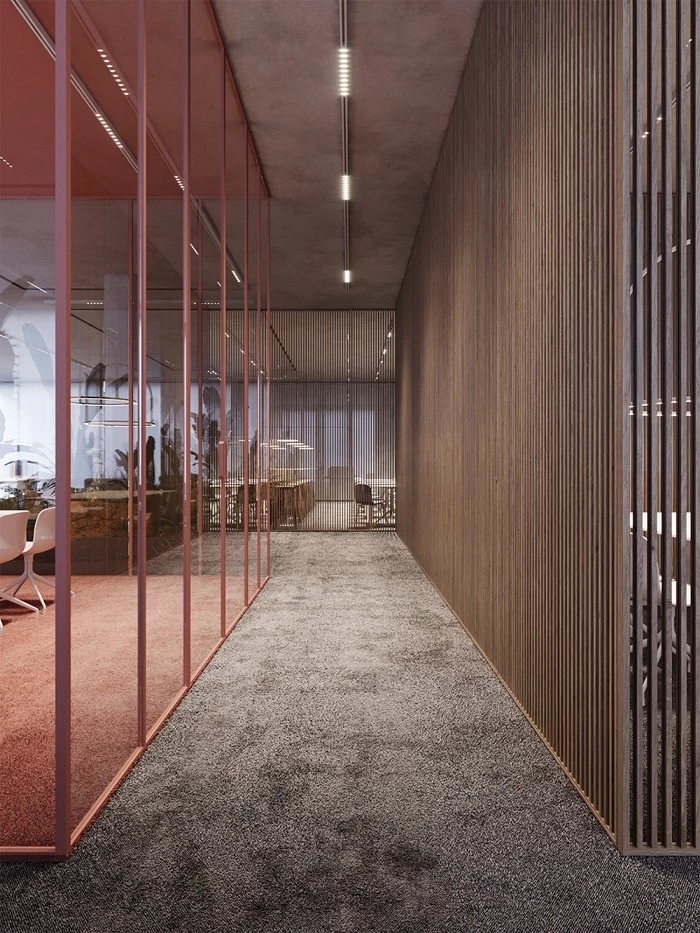 充分利用精致、专业、成熟和永恒的设计欢迎客户进入客户区,在这里,清爽的室内建筑营造了一种信任和安全的氛围。柔软和自然的材料,如隔音织物和木镶板/门,与嵌入在聚氨酯漆面板接缝凹槽中的硬内衬LED灯具很好地平衡。即使在一个有张力的空间里,它也能通过在艺术品中加入一些有机的特征来给人一些柔软感。 咖啡厅周围的玻璃墙被放置在办公场所的中心,这样大家都可以进入,以改善他们的互动。由于工作空间是无边界的和透明的,人们的思想已经转向更开放的新想法。