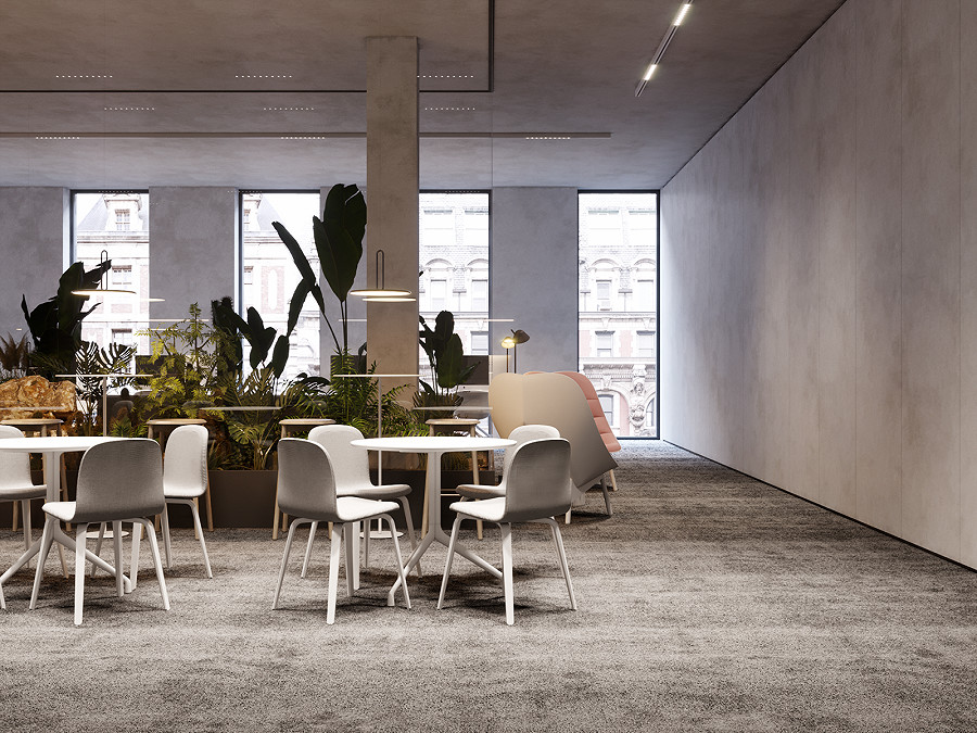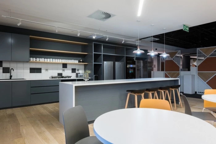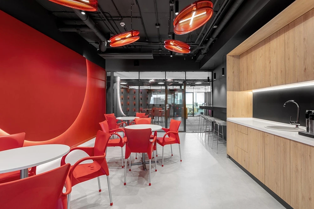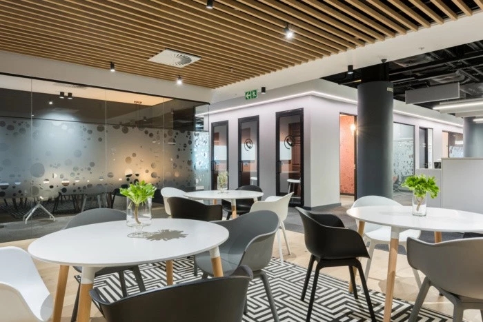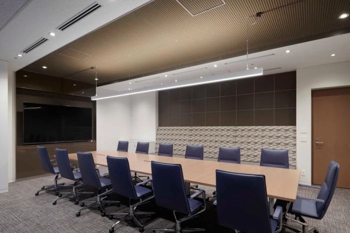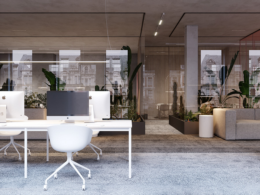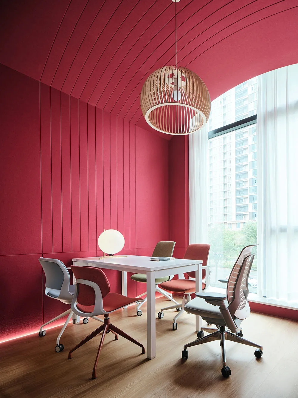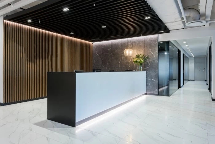 充分利用精致、专业、成熟和永恒的设计欢迎客户进入客户区,在这里,清爽的室内建筑营造了一种信任和安全的氛围。柔软和自然的材料,如隔音织物和木镶板/门,与嵌入在聚氨酯漆面板接缝凹槽中的硬内衬LED灯具很好地平衡。即使在一个有张力的空间里,它也能通过在艺术品中加入一些有机的特征来给人一些柔软感。 咖啡厅周围的玻璃墙被放置在办公场所的中心,这样大家都可以进入,以改善他们的互动。由于工作空间是无边界的和透明的,人们的思想已经转向更开放的新想法。