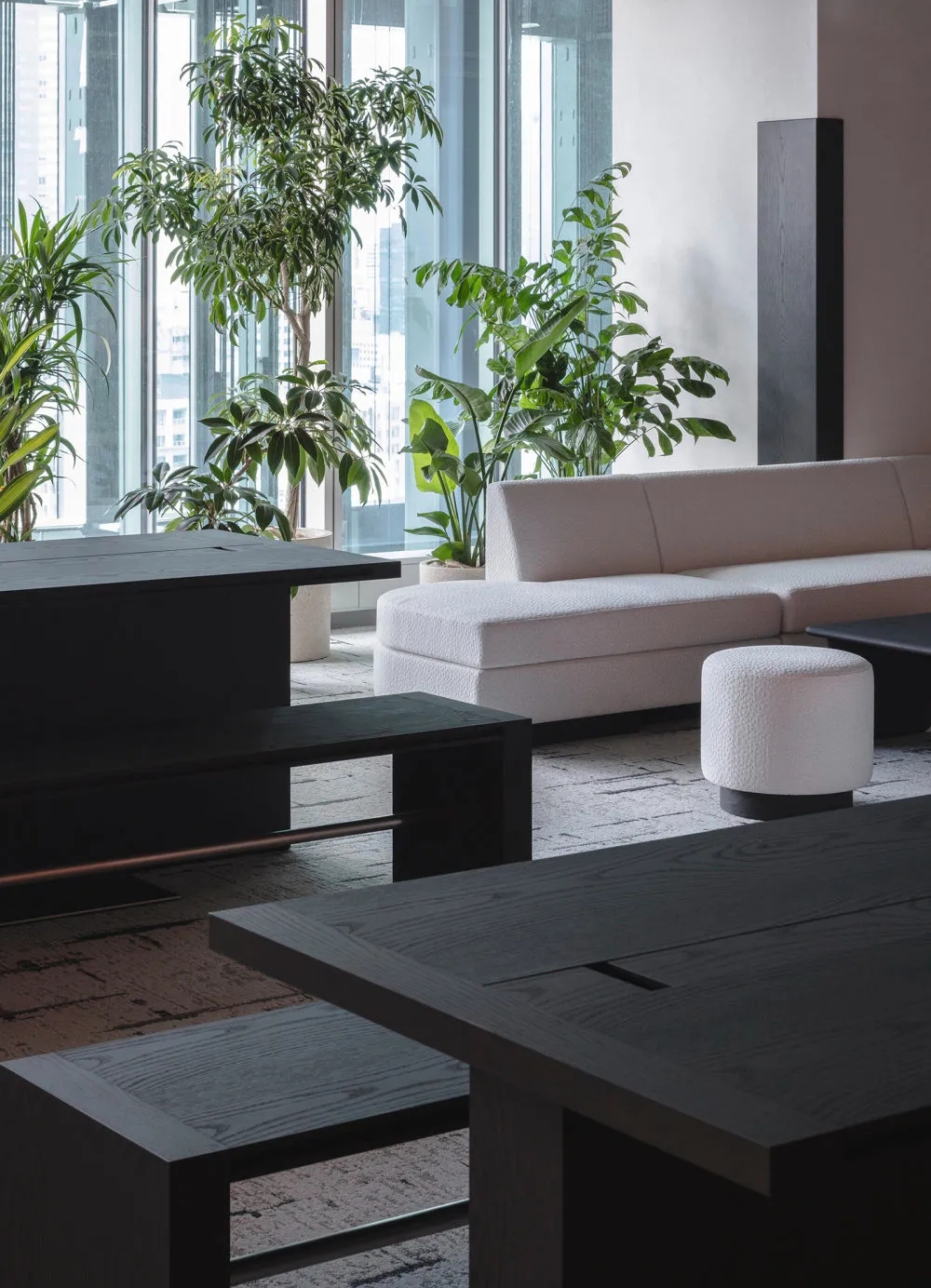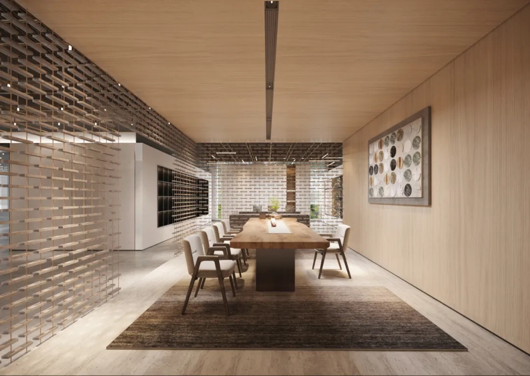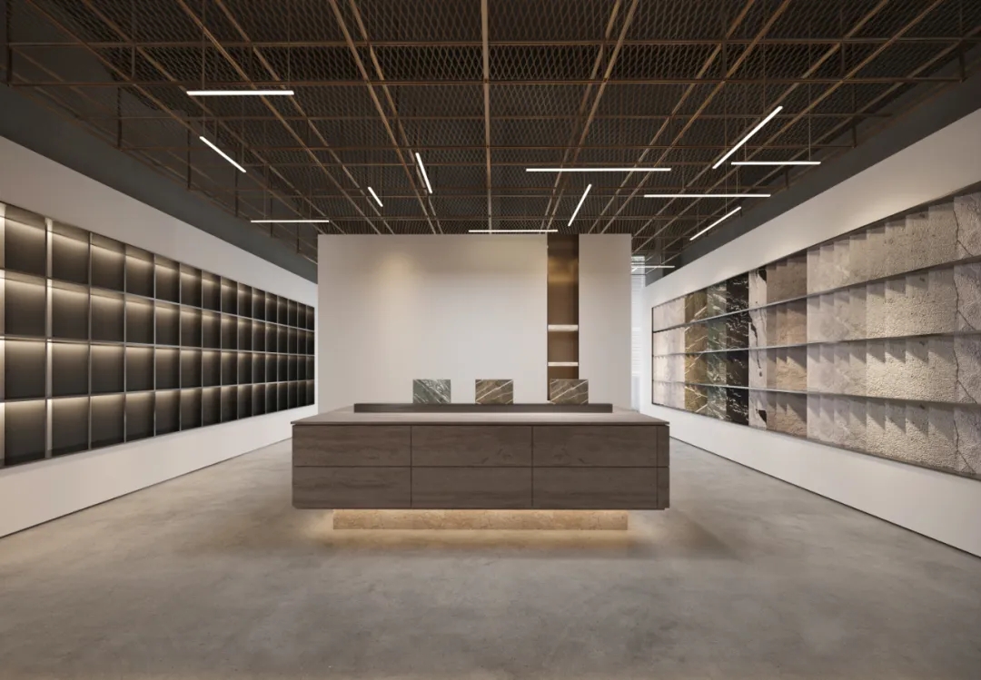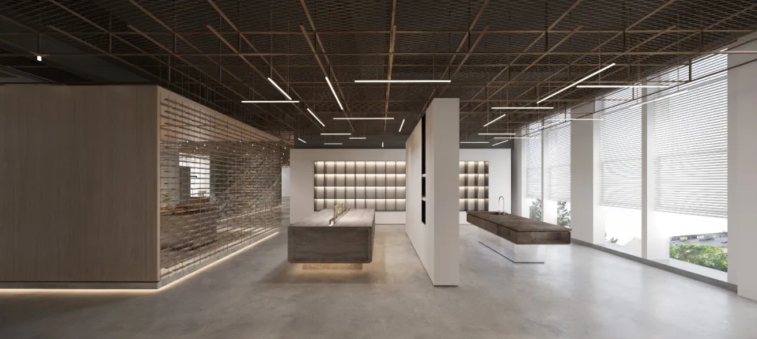 光和纹理,是这个空间背后的两大设计元素。设计团队仔细考虑时间转移对光线特质的影响,以日间充沛的自然光、黄昏的暖光和人造光,营造出空间在不同时段的独特氛围。大理石、GRC、木材和铝合金等个性独特的物料,与不同温度的光线交织,成为这场光影之舞的背景画布。天顶的结构和树叶的影子,经阳光为载体,白天洒落在大理石地面,黄昏则斜倚在条子墙上,形成一道道独特的图案,丰富了空间的视觉语言。