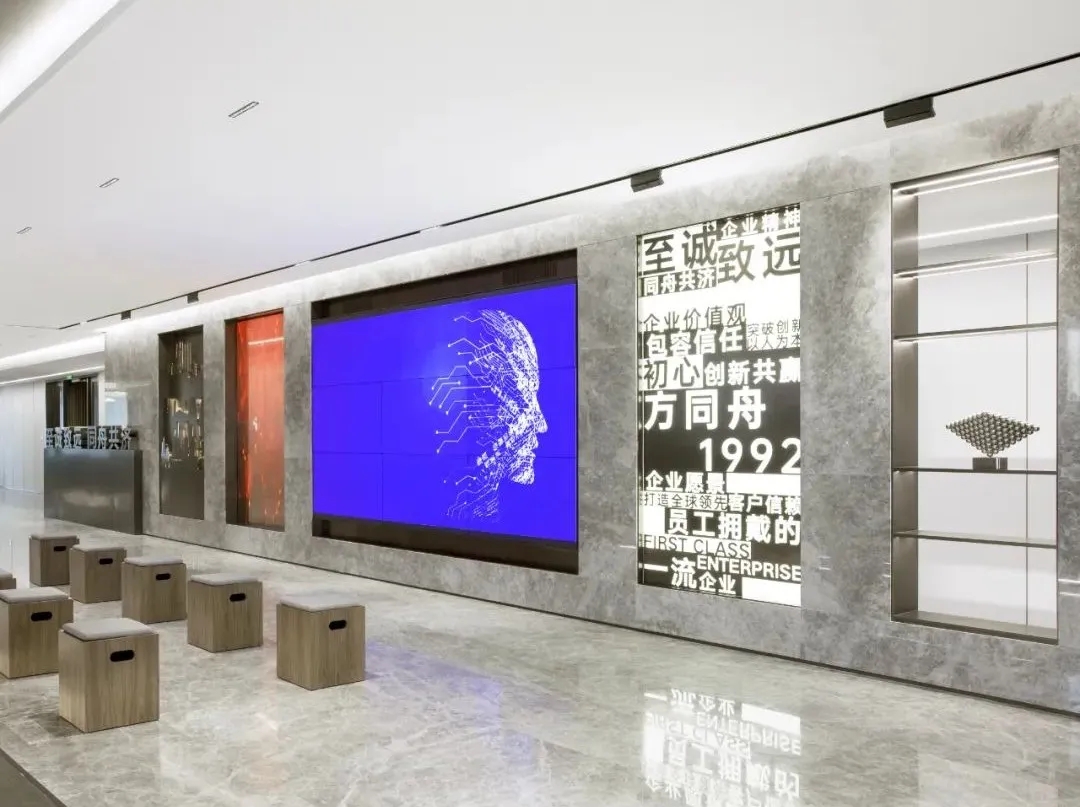 钢铁铸就的“志诚致远 同舟共济”是方同舟控股的企业精神也是方同舟创新之路的发展之源。层叠钢板雕刻出的钢厂剪影代表方同舟的传承和基石;交互玻璃LED屏可查看VR展厅、现代化工厂实景;字阵形式的企业文化展窗是合影的最佳背景;通透的搁架层板可以将将方同舟获得的重要荣誉集中展示。展墙的中间位置是一块大型拼接屏幕,可根据需要播放不同主题的企业宣传片和主题视频。