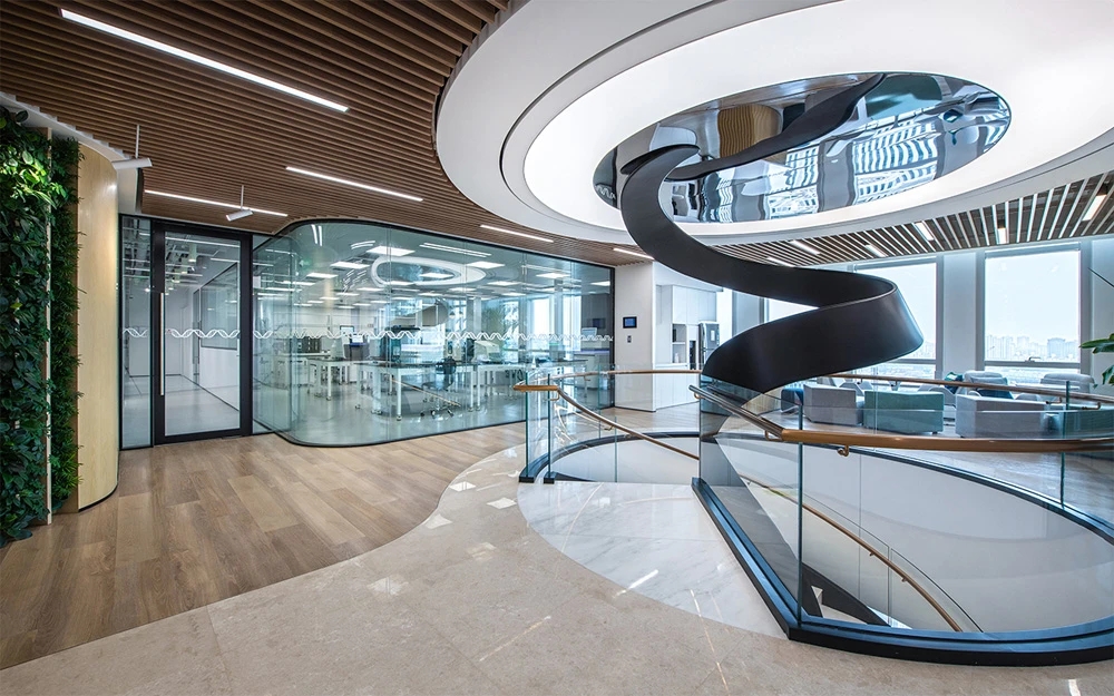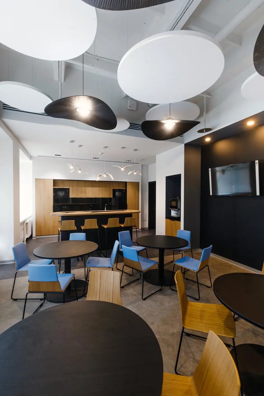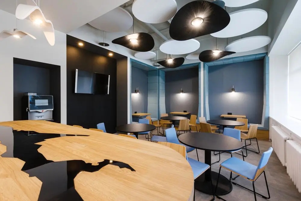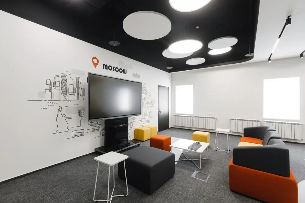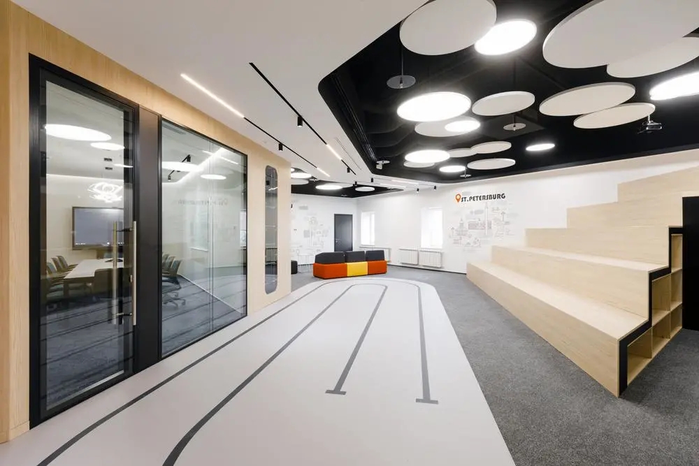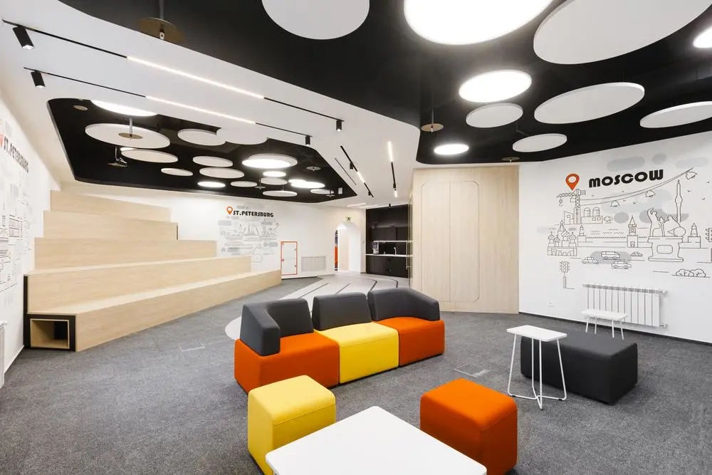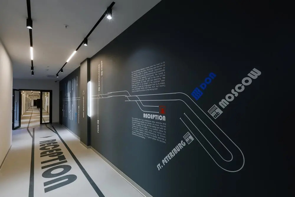 接待区的设计未来感十足。接待台前后两侧的墙面采用了金属材质的面板装饰,与天花自成一体;接待台的造型如同一列正在飞速穿越隧道的高速列车,一侧墙面上的拱形开口形似隧道的入口,具有高反射系数的可耐丽人造石创造出一种火车行驶而过的错觉。穿过“隧道”后会进入一个多功能大厅,包含一个带有模块化沙发的开放协作区以及一个露天剧场,剧场主要用于举办讲座和演讲等公共类活动。“都市感”是设计师想要在这一区域呈现的空间风格,这一点,从墙面上绘制的莫斯科与圣彼得堡城市景色图形中可以一目了然地发现。